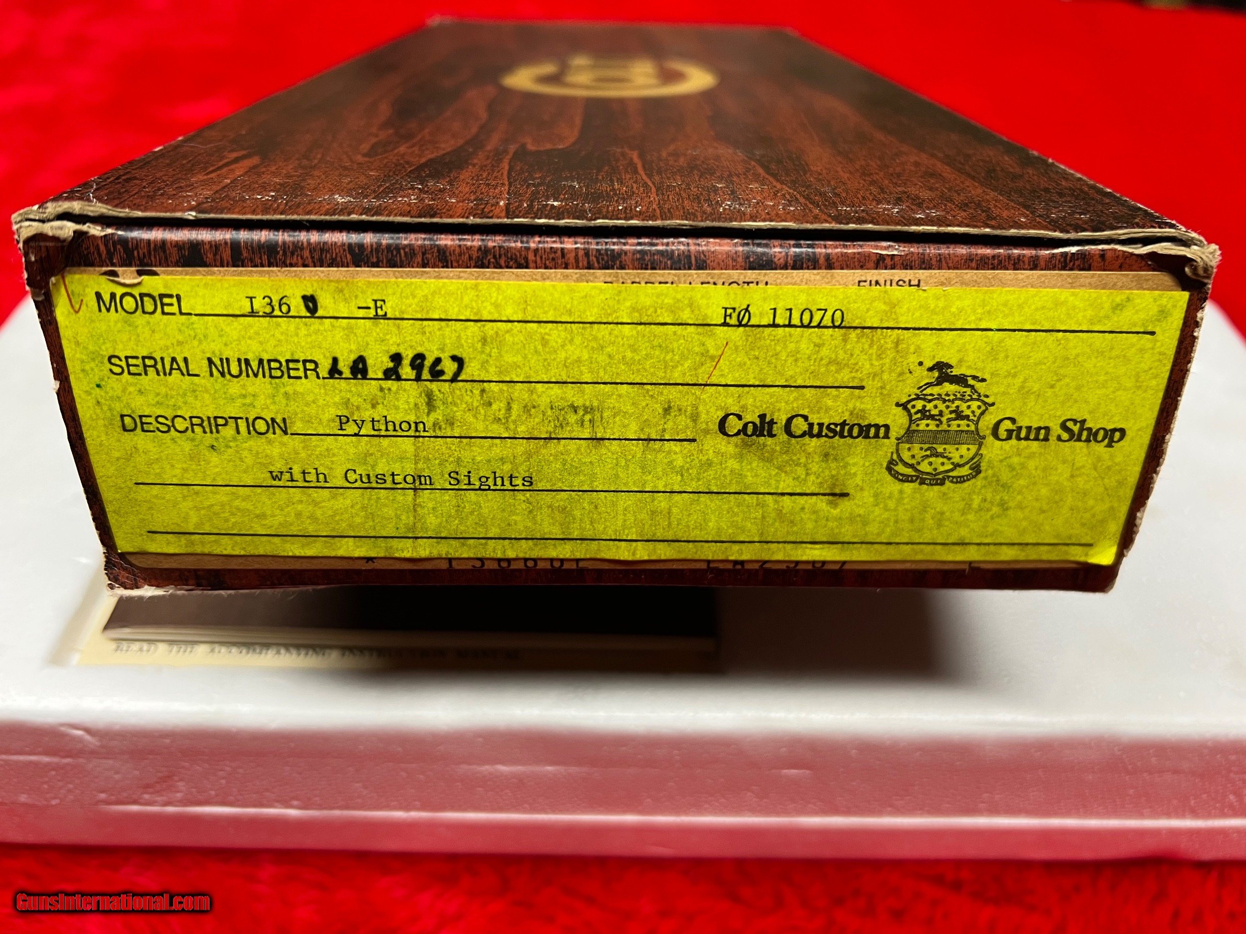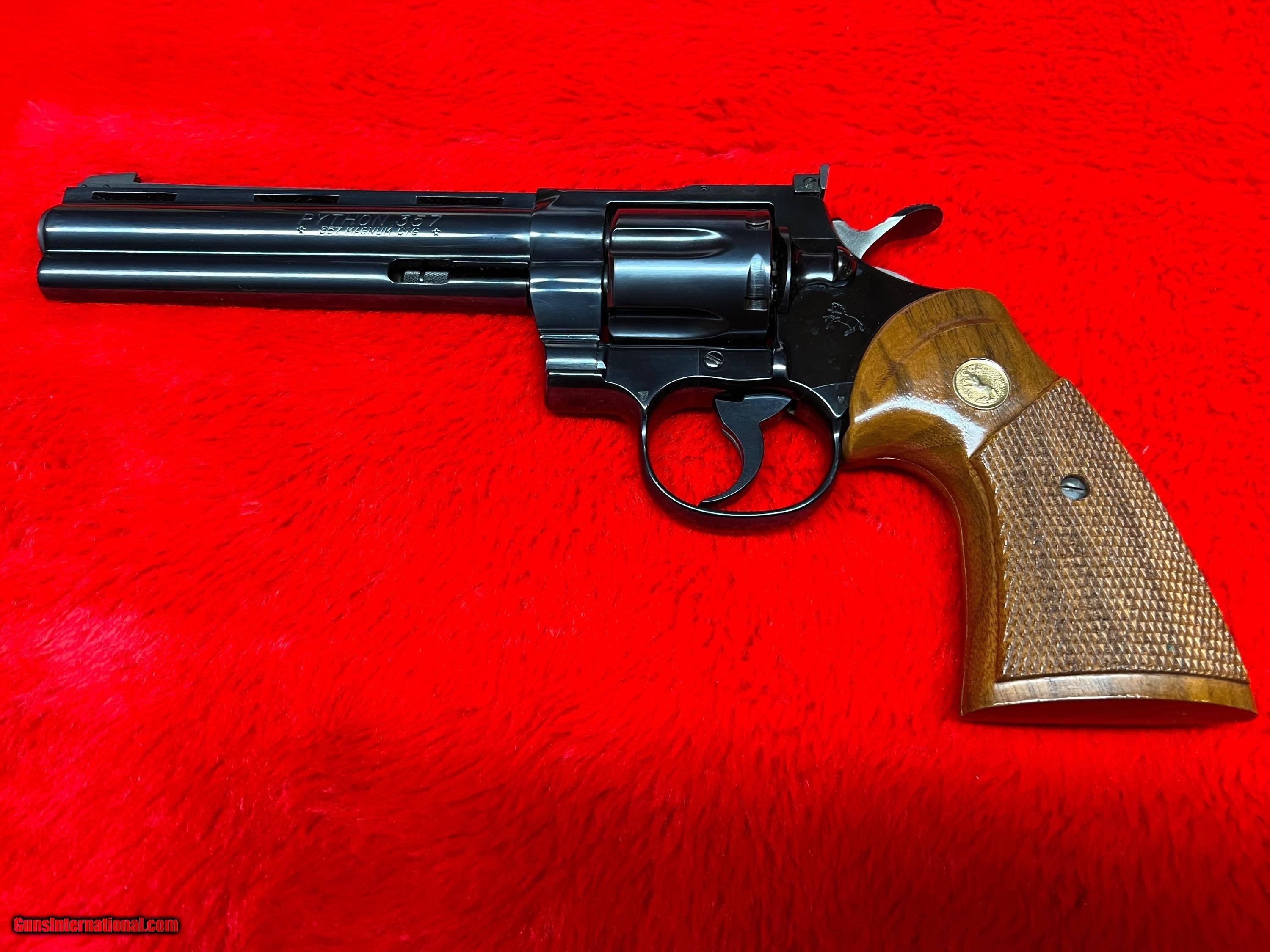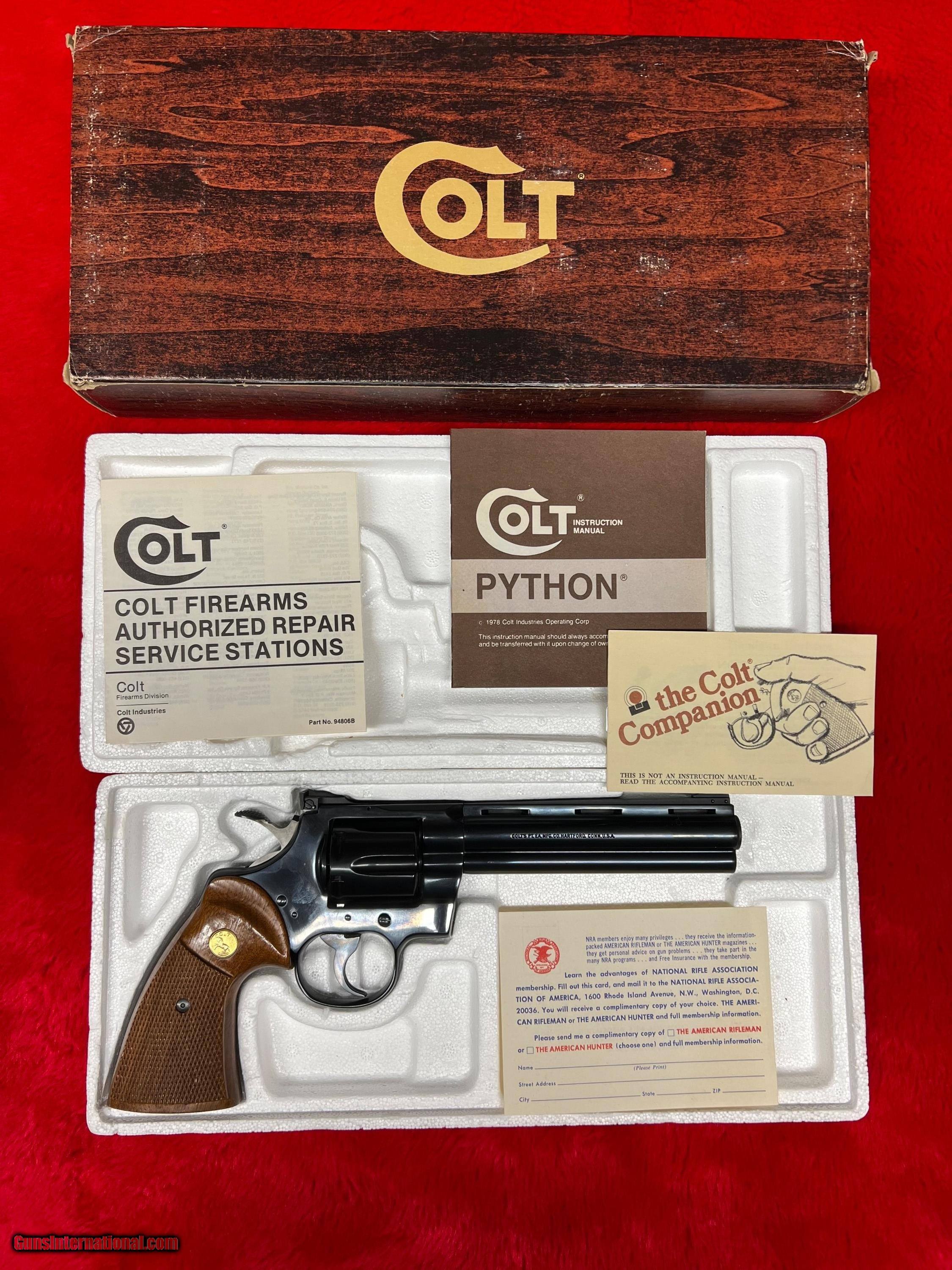 Description: Colt Python. 1980 production. ANIB. Exceptional condition. Told it was never shot except at the factory but I can't confirm that. Original box and paperwork. Box shows usual wear for 42 year old. Serial numbers match on the box and pistol. Great addition to any collection. Add $80 insured shipping. Box and revolver will ship separately SOLD Handgun Caliber: .357 Magnum Manufacturer: Colt Model: Python Barrel Length: 6” Condition: Excellent Metal Condition: Excellent Wood Condition: Excellent Bore Condition: Excellent Manufacture Date: 1980 |
