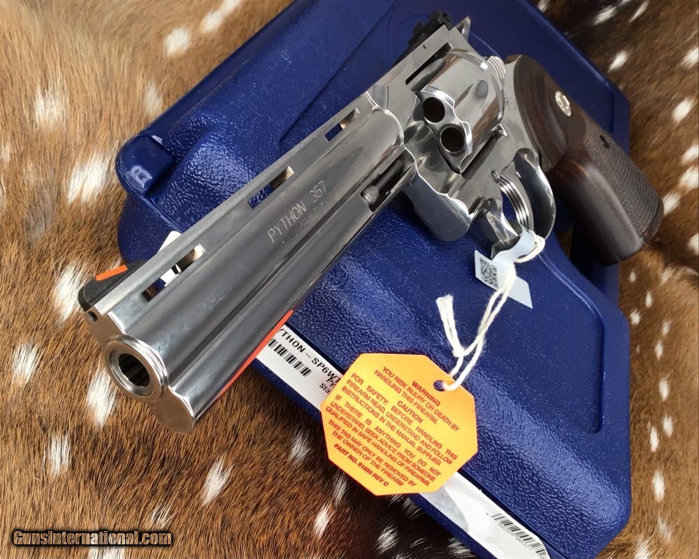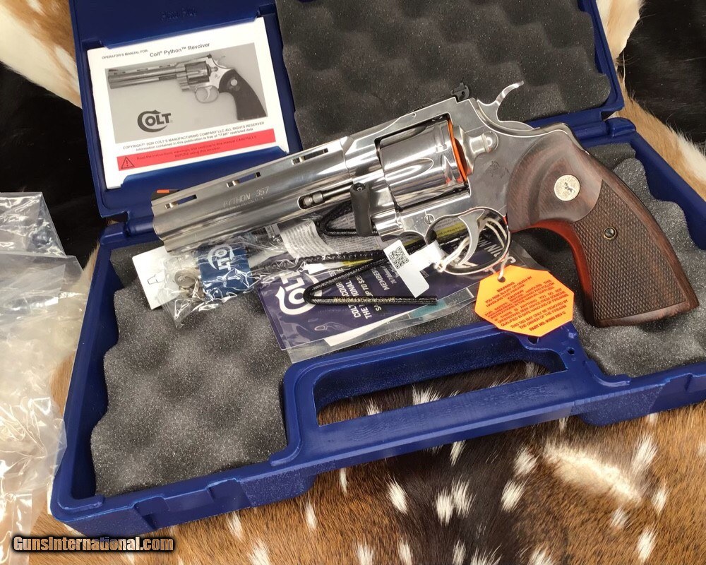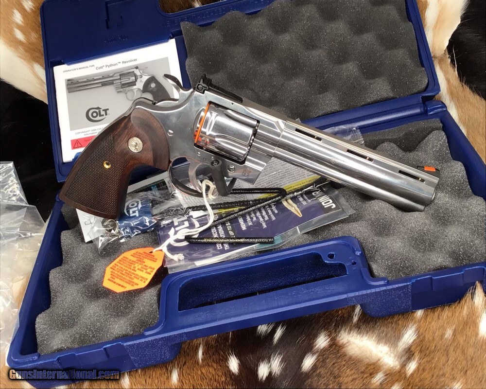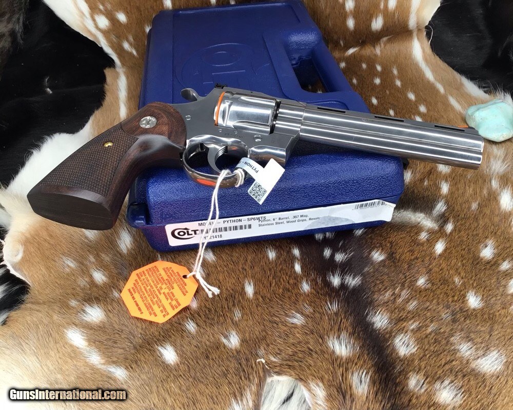 Description: NIB Colt Python wearing a six vented rib inch barrel, laminated wood grips, Target adjustable sights. In factory hardcase with manual and lock. Priced to sell fast. Add 3% if paying with credit card. God Bless America from a proud American, and a Viet Nam Vet , thankful for our freedoms.. paid for by the Blood ,Sweat and Tears of our brave men and women in uniform. Ten Below Firearms is a Veteran owned and operated business. We specialize in out of production models of high quality firearms. We love to ship! If you are out of state or can't make it to our store, just give us a call! Handguns normally ship for $30 and Long guns for $40 to $65 for extra length long guns. That's 2-3 day USPS Priority shipping, Delivery conformation and with tracking number. Optional Postal insurance is additional $1.70 per $100 and highly recommended. SOLD Handgun Caliber: .357 Magnum Manufacturer: Colt Model: Python Serial Number: PY221418 Barrel Length: 6 inch Condition: New Metal Condition: New Wood Condition: New Bore Condition: New Action: DA/SA Rib: Vented rib Sights: Adjustable target Manufacture Date: 2021 Item Location: Mn |