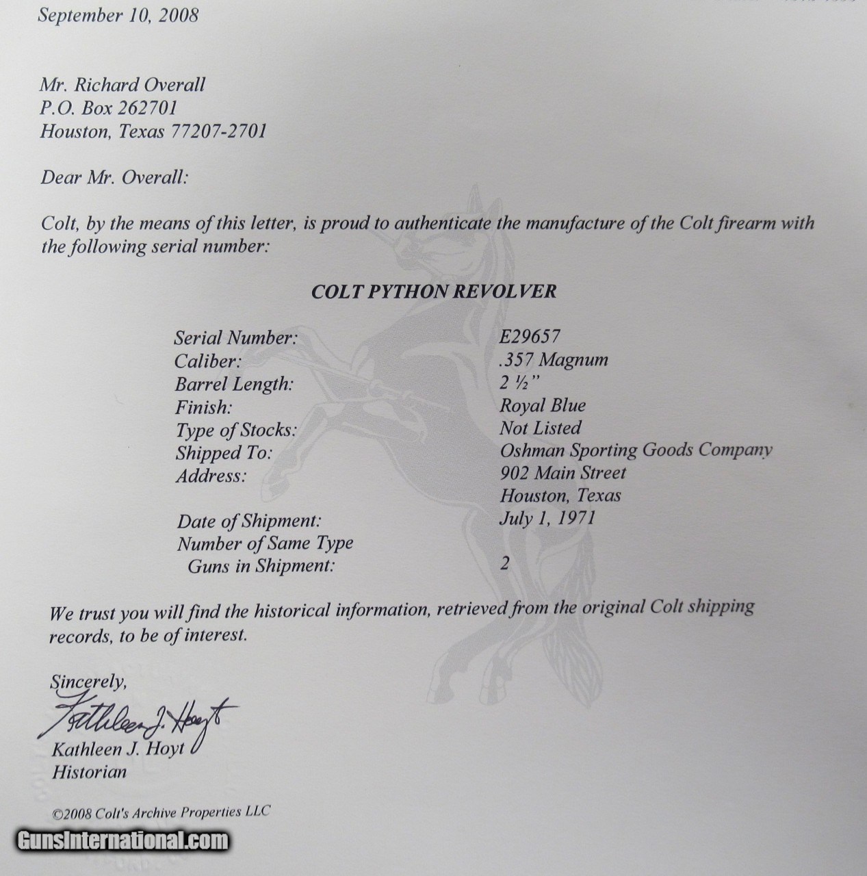 Description: The “EBB ROSE” Colt Pythons; Serial Nos. E29657 & E45024; Custom Engraved; Custom Ivory Grips; Shipped to Houston, Texas 1971 & 1972; Jesse Ebb Rose was a Houston Celebrity who raced Six Times in the Indianapolis 500 Motor Races during the 1960’s; EBB ROSE inherited the J.H. Rose Truck Line of Houston, TX; His stated ambition was to finish in the top ten, but he never did; His best placing was 14th (Twice in 1962 & 1963); Asked why he raced, he said, “For the Hell of it!”; Ebb Rose passed away on August 27, 2007 at the age of 82; Letters and Photos Included; See All Photos for Condition; No Texts. Call or Email Only; PERSONAL PROPERTY of Harold Wieser; Price: $20,000 + $45 S&H Via FedEx Express; Price includes insured shipping; return policy: three days inspection from the date the item is received; full refund of shipping both ways ONLY IF THE ITEM IS MISREPRESENTED. SOLD Manufacturer: Colt Model: Python Serial Number: E29657 & E45024 |