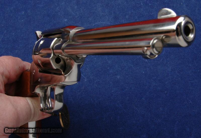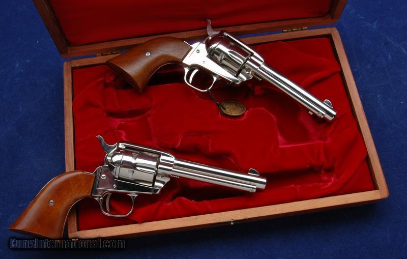 Description: Available for purchase is this really nice pair of Colt Frontier Scouts. Both nickel, one chambered in 22LR, the other in .22 Magnum. Both have partial, very light turn lines, neither one has been fired. Overall beautiful condition, they come in the original Colt wood case, no papers or outer boxes. Note that the one with the medallion is the magnum. Bores are of course mint. Box has a few bruises, these 2 revolvers are not consecutive numbers. Sold as a pair only. $50 shipping to the lower 48, 3% surcharge for using a CC. SOLD |