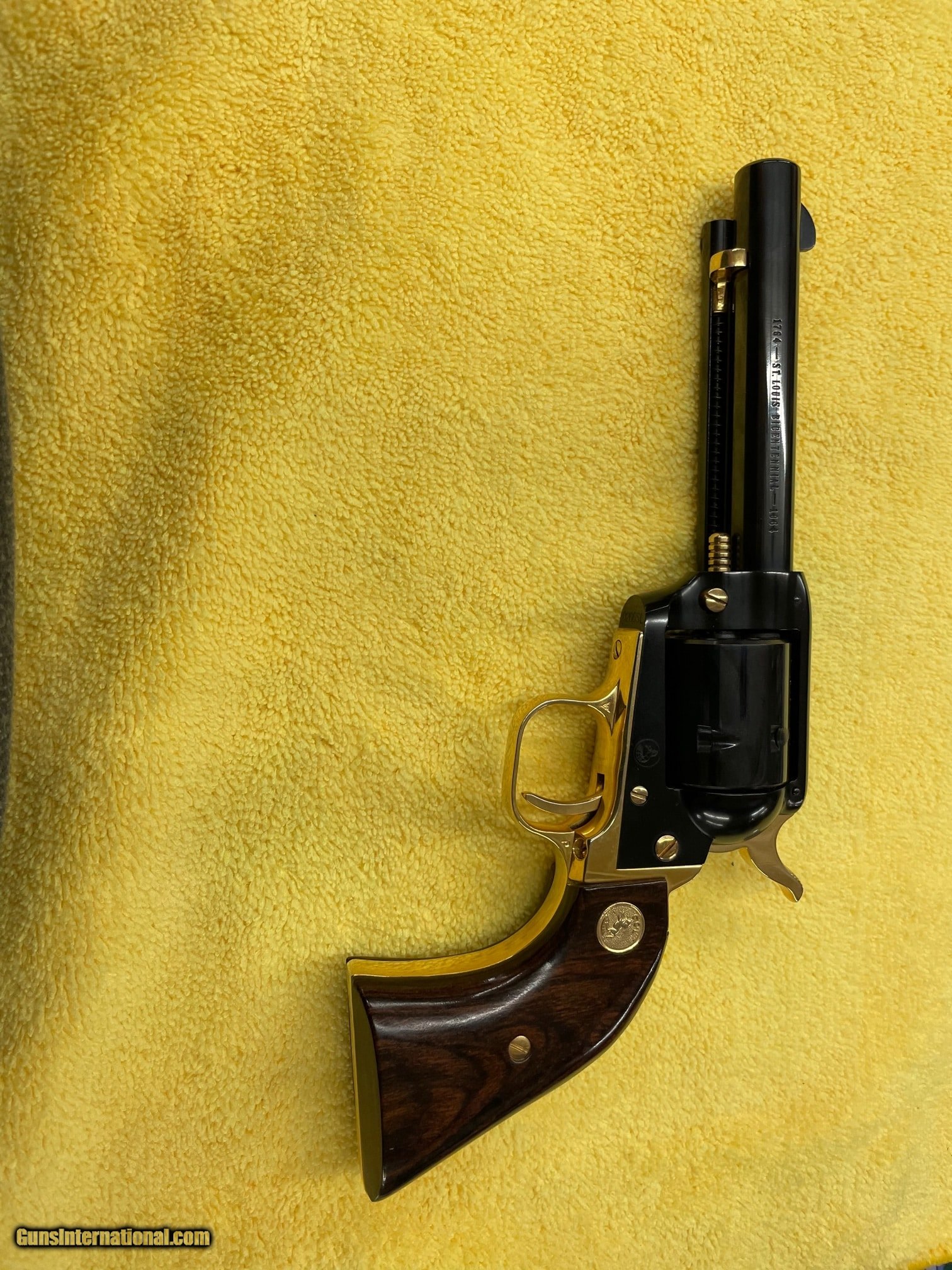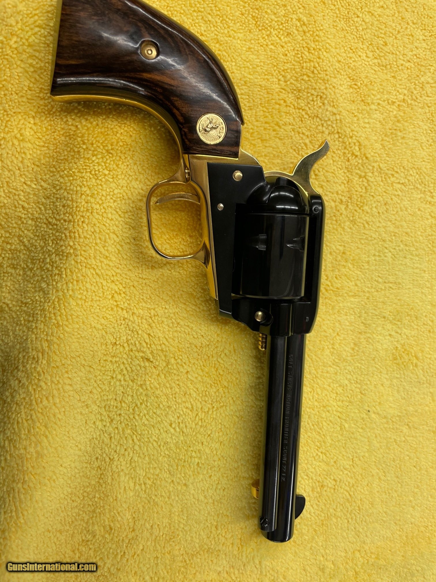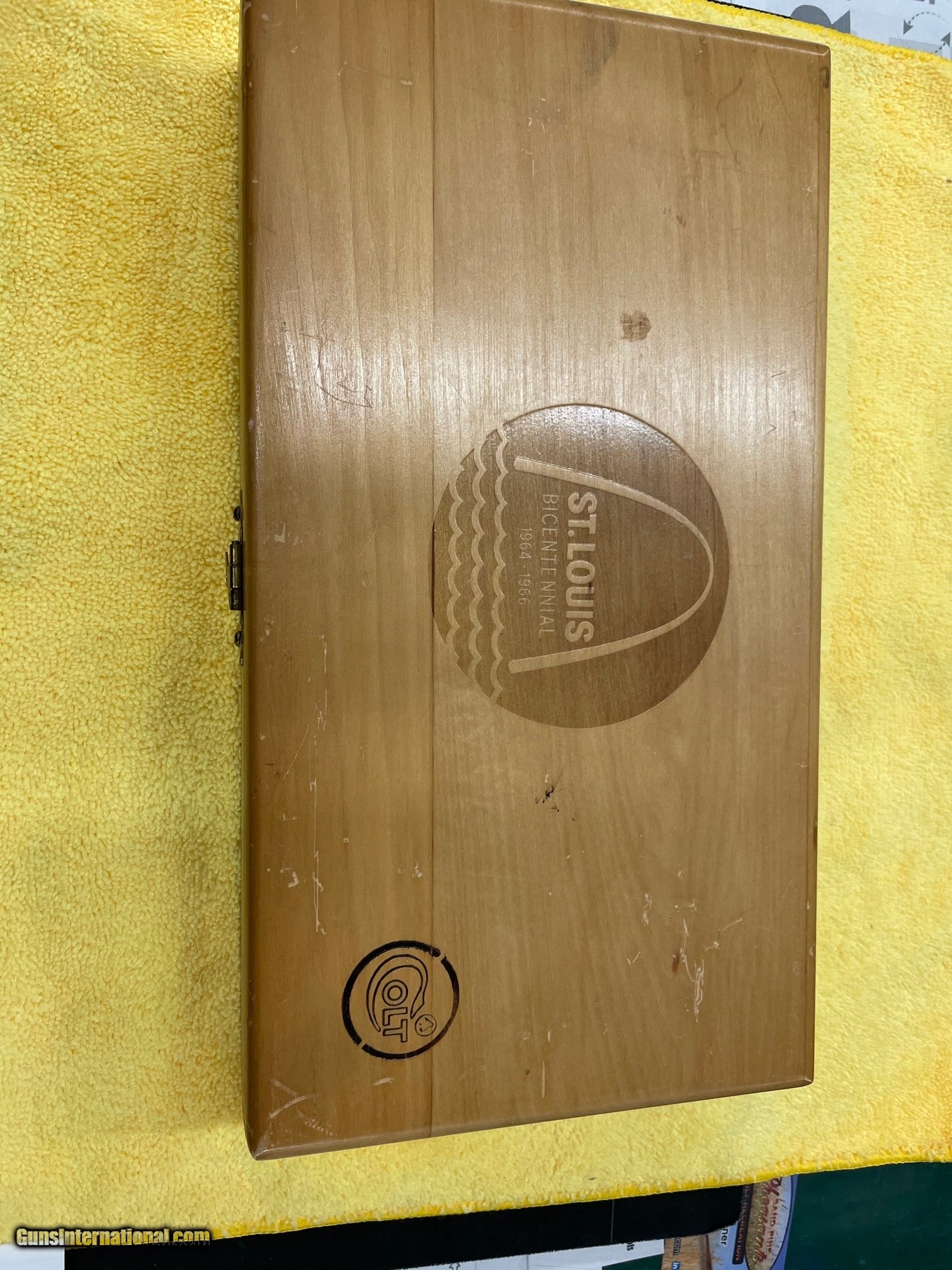 Description: Guns Listing ID: 274511 has never been fired.22 lr caliber, 5.5" barrel, lower serial under 300 . Blue and gold finish, walnut checkered grips with Colt medallions, left side of barrel marked "1764 - St. Louis Bicentennial - 1964;" right side of barrel marked "Colt Single Action Army .22 lr." Housed in its original wooden display box SOLD Manufacturer: COLT Model: 1764-st.louis bicentennial-1964 Caliber Info: 22 LR Condition: Used - Non-Certified Barrels: 5.5 BARREL Finish: BLACK AND GOLD |