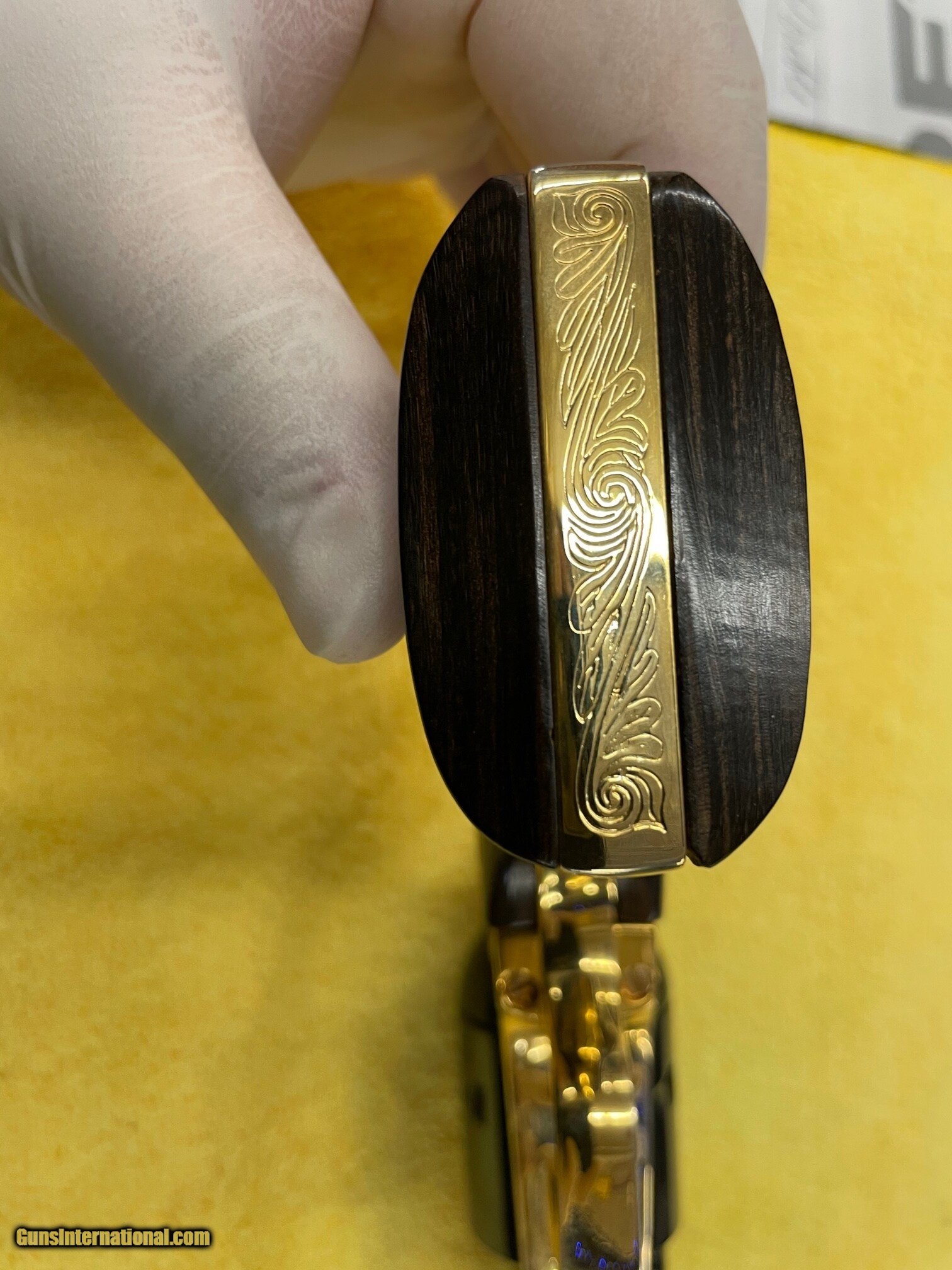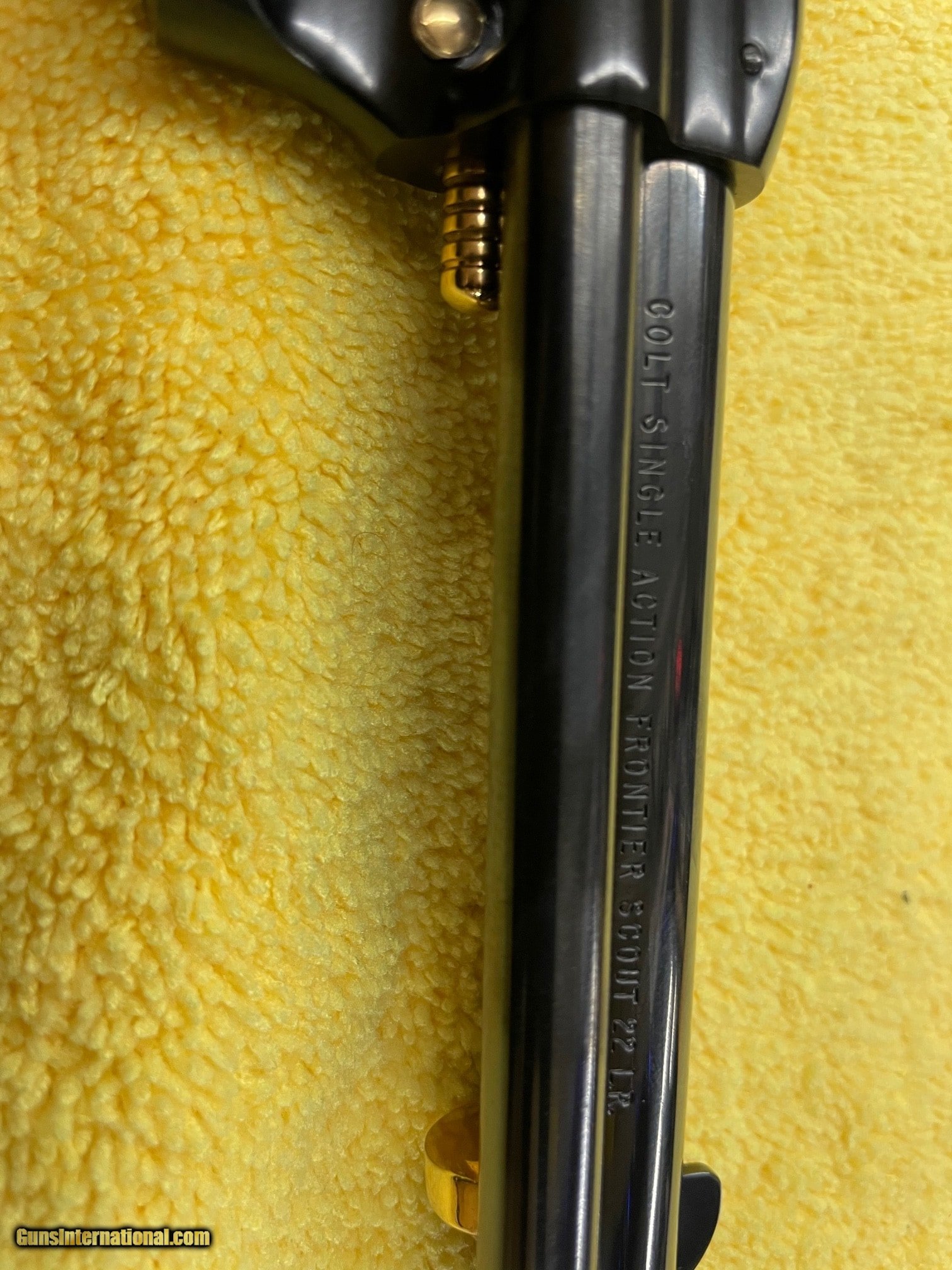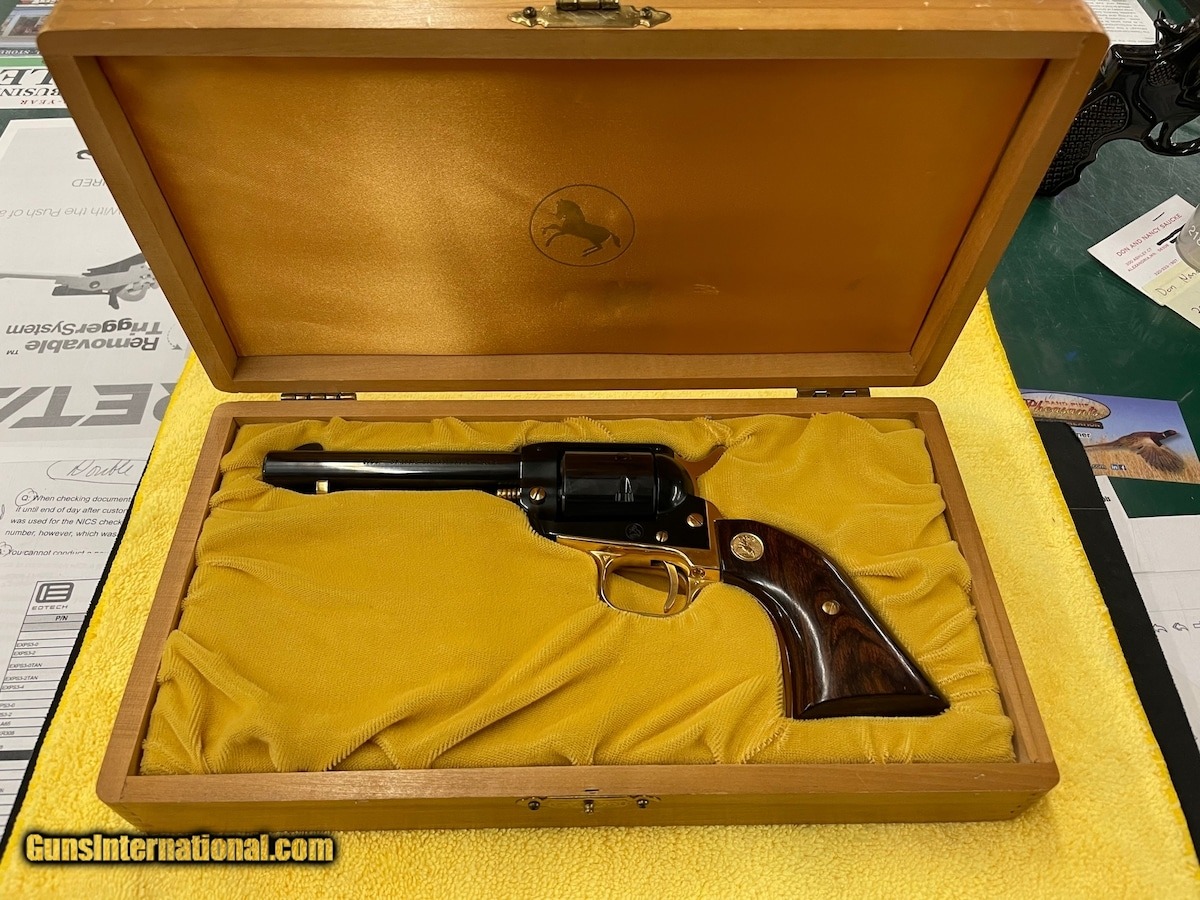 Description: Guns Listing ID: 274511 has never been fired.22 lr caliber, 5.5" barrel, lower serial under 300 . Blue and gold finish, walnut checkered grips with Colt medallions, left side of barrel marked "1764 - St. Louis Bicentennial - 1964;" right side of barrel marked "Colt Single Action Army .22 lr." Housed in its original wooden display box SOLD Manufacturer: COLT Model: 1764-st.louis bicentennial-1964 Caliber Info: 22 LR Condition: Used - Non-Certified Barrels: 5.5 BARREL Finish: BLACK AND GOLD |