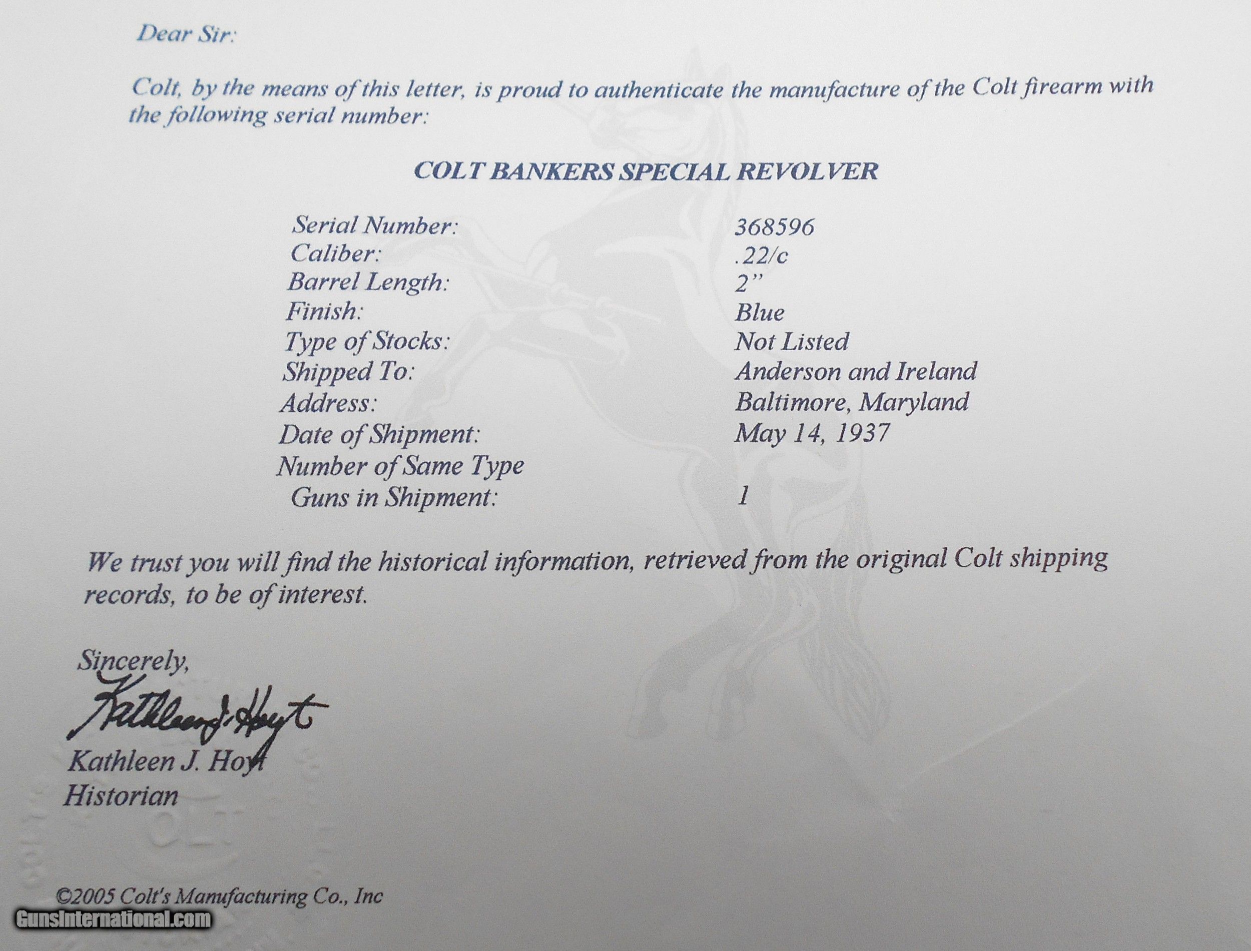 COLT BANKERS SPECIAL 22 CALIBER FACTORY LETTER