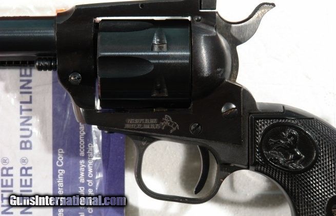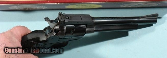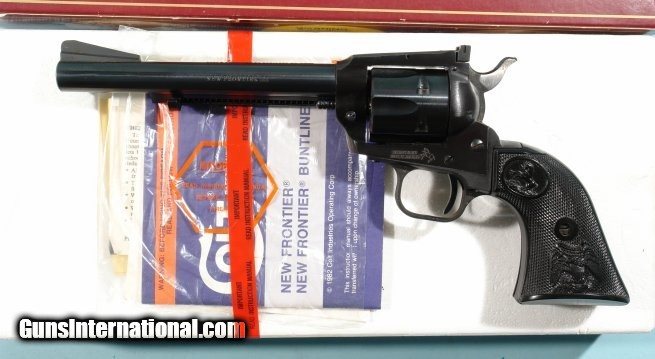 Description: COLT NEW FRONTIER .22LR SINGLE ACTION 6” REVOLVER CA. 1980’S IN ORIG. BOX. As new condition with 100% blue and mint hard rubber grips. May have been fired a very few rounds but unused. All original. Extra nice with original box and instruction manual and the related enclosures as well as the red “Warning” hanging tag. SOLD |