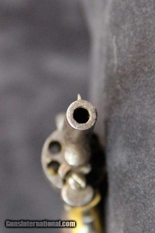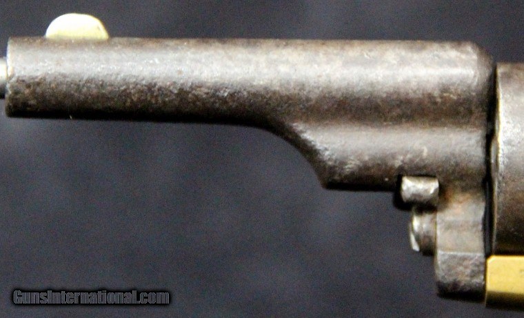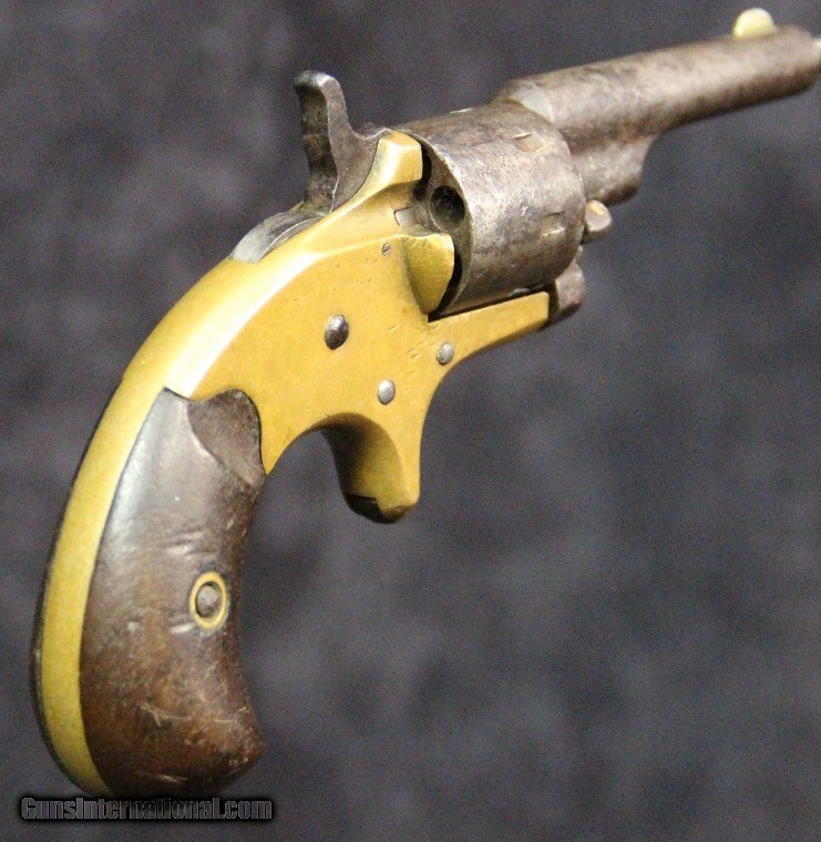 Description: .22rf, short, #19092, 2 1/2 inch barrel, blue and brass finish, 2 piece walnut grips, 7 shot, 1874. Condition: dark bore, barrel and cylinder silver/gray, brass frame even aged finish, very good grips, very good mechanically, good marks. SOLD Antique: Yes |