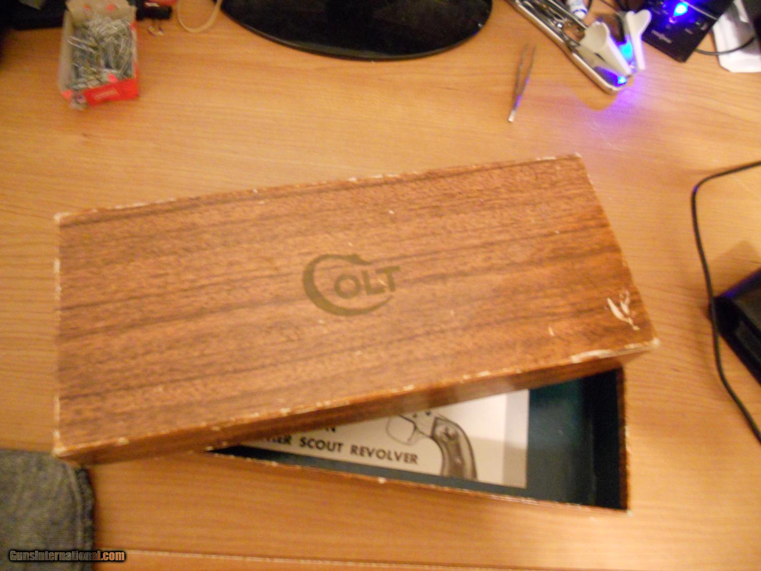 Description: Colt Scout 22 Mag Revolver made in the 60s. 99% condition. Just a few minor handling marks. Gun is very nice with no turn line. All blue . Correct box but end label is missing. Serial # on bottom of box. 25.00 shipping SOLD Manufacturer: Colt Model: Scout Serial Number: 104849 Caliber Info: 22 Mag Condition: 99% |