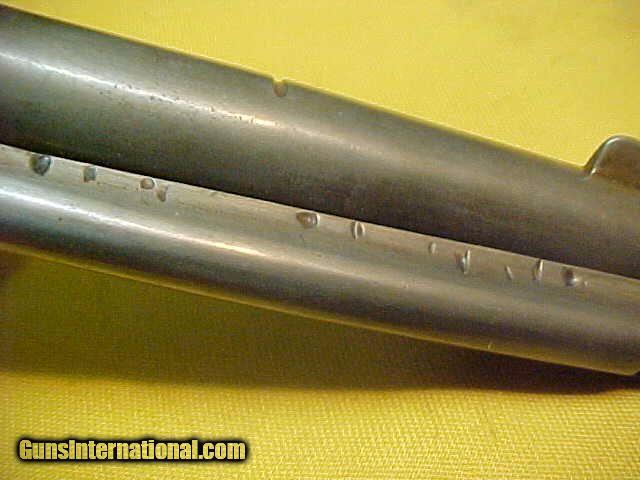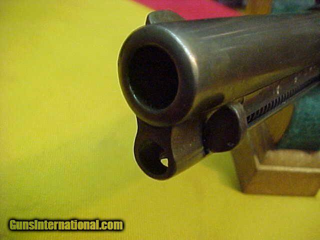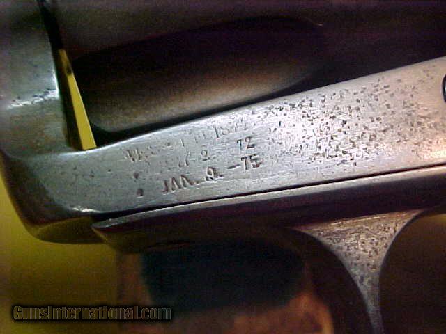 Description: #4984 Colt S/A 4-3/4”x44WCF, 118XXX(1897), G-VG bore, just (6 to 6-1/2 on a scale of 10) and having no pitting of mention but does have considerable wear to the rifling. Indexes fine, and the action is very tight with all clicks on the hammer. The exterior has a smooth even dark grayish-brown patina on good metal, but the markings are very weak with just faint traces of the two-line barrel address visable, and there are deep pits on the ejector housing (see photos). All matching numbers. The etched COLT FRONTIER SIX-SHOOTER barrel logo is totally gone from holster wear having worn off any vestage of it. Worn original wood grips have been non-factory checkered by some bored cowboy and are undersized on all edges and there is a small shallow cut on the top of the barrel. Overall this is just an average little “short-barreled bad forty-four” (to quote Marty Robbins in his song “Mr Shorty”) and while it’s not a great high-end collectors item, it is a very inexpensive 1880s Single Action in a very popular configuration. G-G+. $2250 SOLD Curio/Relic: Yes Antique: Yes |