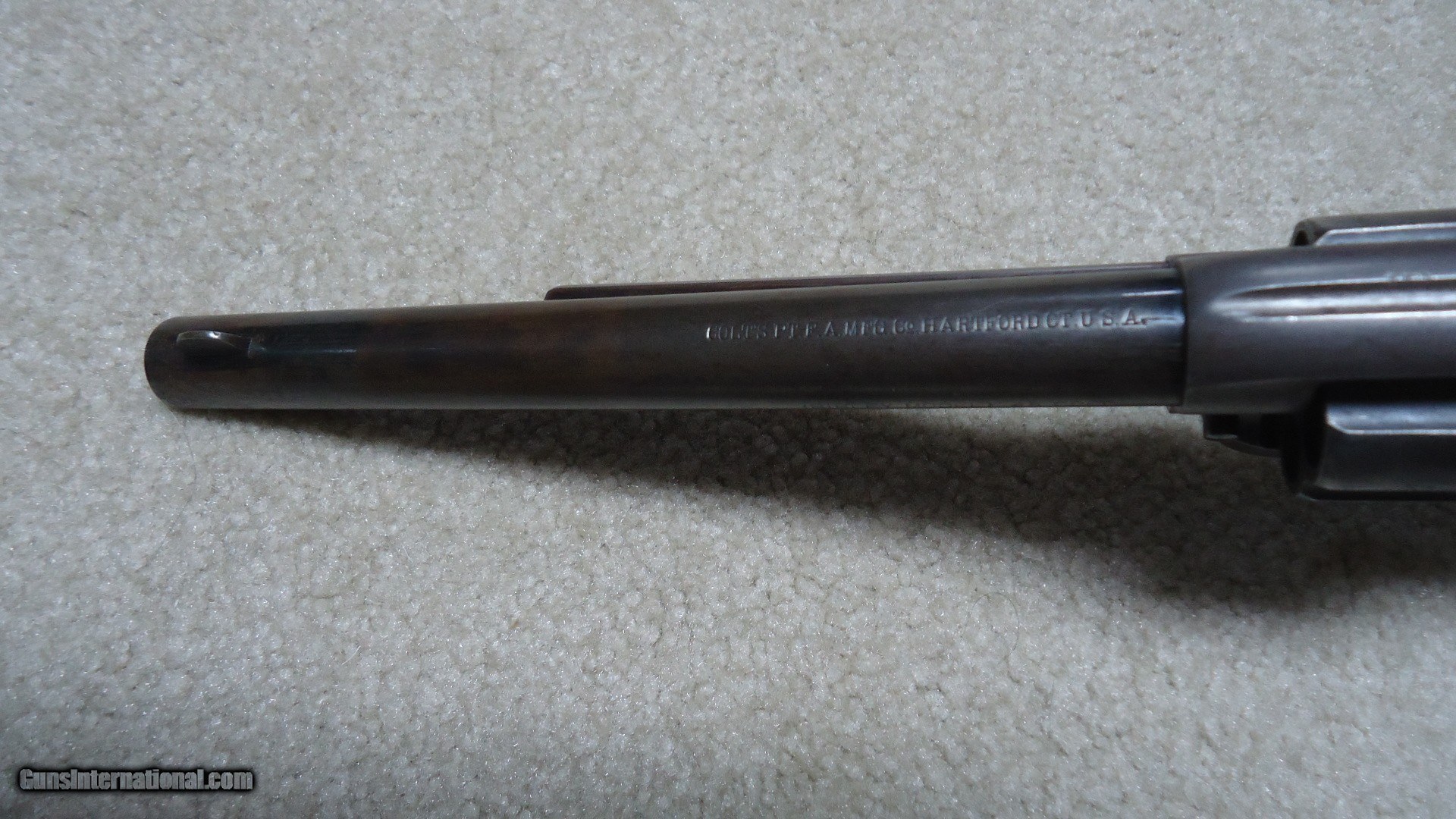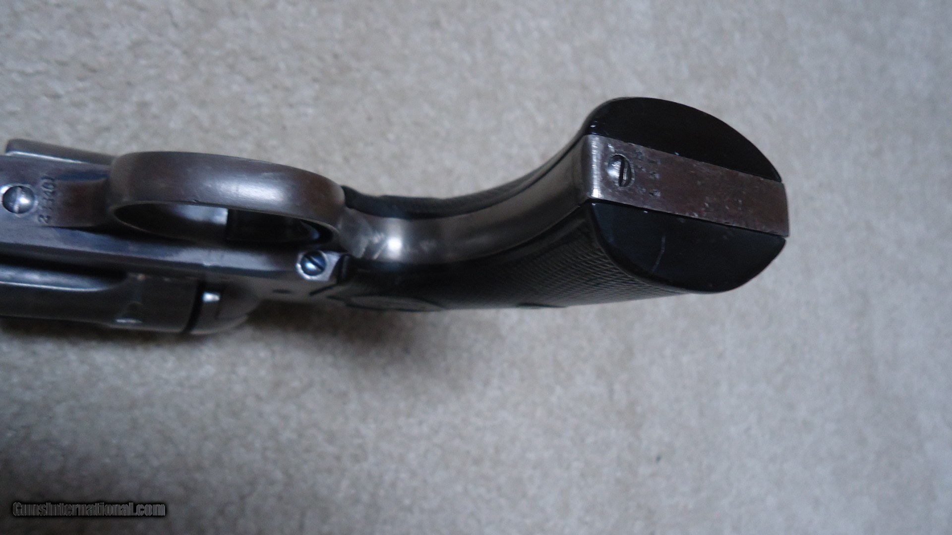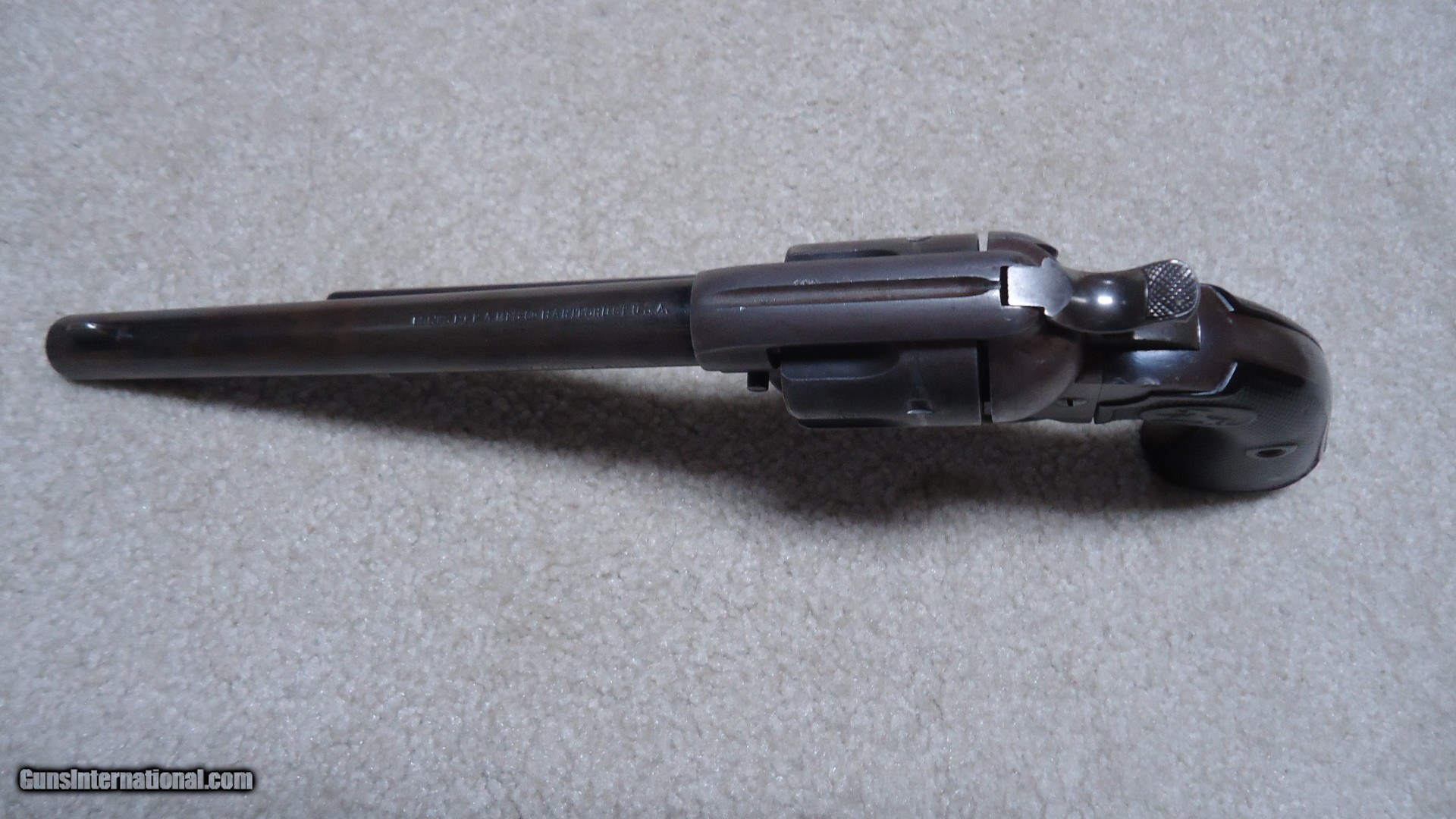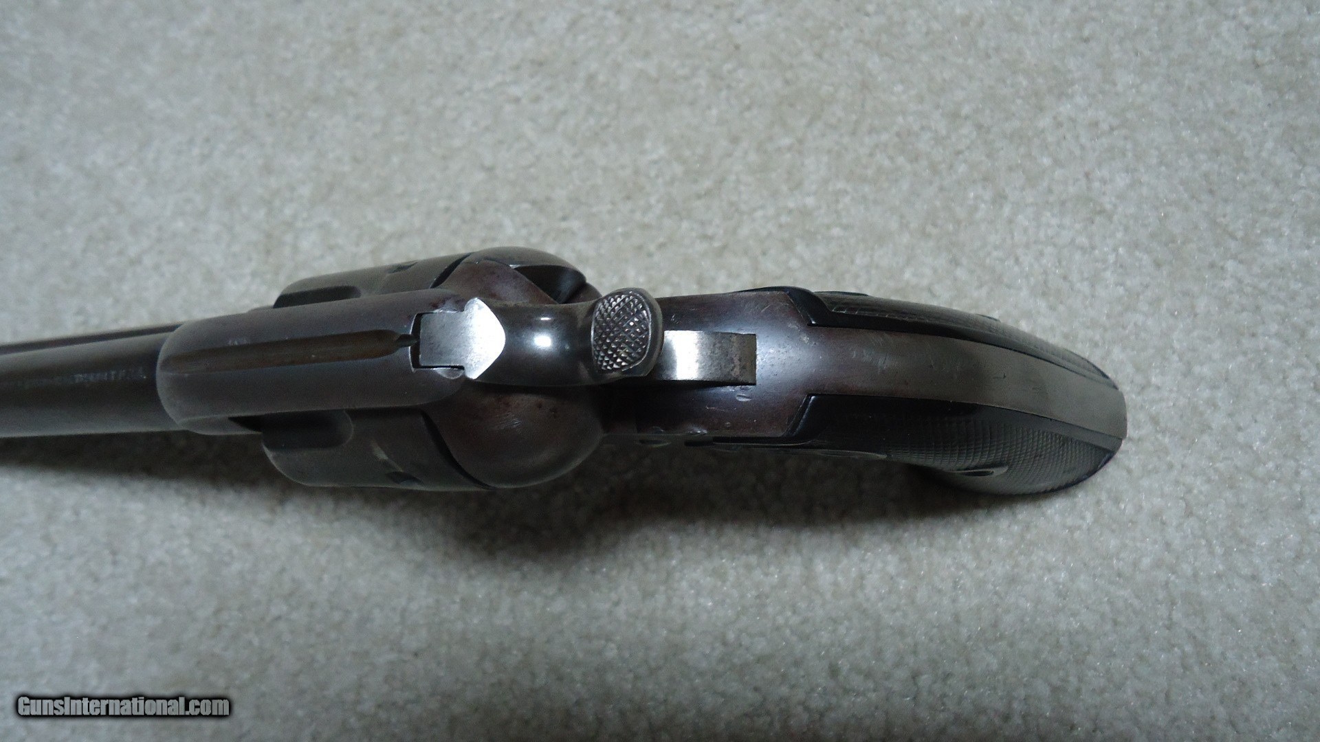 Description: BISLEY IN SCARCE AND DESIRABLE .45 COLT CALIBER WITH 7 1/2" BARREL, #238XXX , MADE 1903, WITH FACTORY LETTER. Really difficult finding these long barreled .45s as most Bisley Models were shipped with 4 3/4" or 5 1/2" barrels with most of the production in .32-20 and .38-40 calibers. The Colt letter verifies the caliber and barrel length and shows it was sold January 12, 1903 to James Mayshan (address unavailable) Chicago and shipped to Sears roebuck & Company, Chicago, Illinois as a shipment of 1. No doubt, this James Mayshan placed his special order through Sears Roebuck. Chicago was a big meat packing center at the time with many thousands of cattle shipped there by rail each year. This example has matching serial numbers, excellent screw heads and markings including the "(BISLEY MODEL) 45 COLT" on the left side of the barrel. The front sight has not been altered and the mechanics are excellent with four clicks to the hammer, all markings and patent dates are clear, overall the gun is a mixture of mainly gray/brown with blue in the more protected areas- upper trigger guard sides, cylinder flutes, barrel tip and around ejector housing, in the ejector housing flutes, etc. Grips fit perfectly and show only normal wear, bore will brush out to excellent- shows a little leading that ought to clean out. In all, a handsome and early big caliber/long barrel Bisley with factory letter. SOLD Curio/Relic: Yes Handgun Caliber: .45 Colt Manufacturer: COLT Model: BISLEY Serial Number: 238XXX Barrel Length: 7 Condition: VG |
