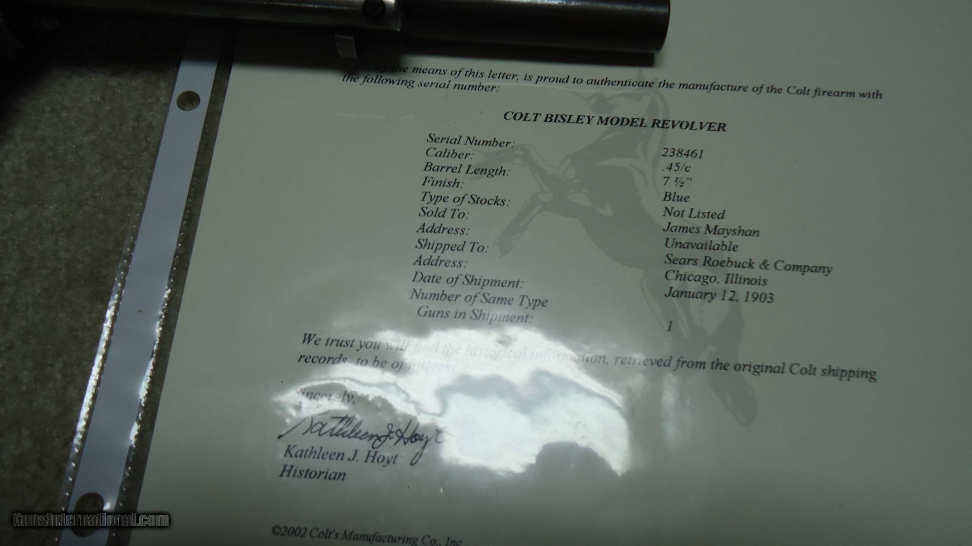BISLEY IN SCARCE AND DESIRABLE .45 COLT CALIBER WITH 7 1/2" BARREL, #238XXX , MADE 1903, WITH FACTORY LETTER