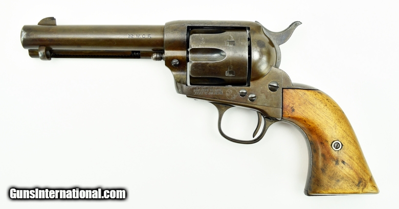Colt Single Action Army .32-20 caliber pistol. Colt Pre-War single action. Manufactured approximately 1904. Bore has good rifling and is frosty in the grooves. Action works crisply and indexes perfectly. All markings are perfect. Grips are old replacements that fit well but not perfectly. This is a very crisp revolver with no dings. The finish is a smooth even patina. No abuse on this revolver.