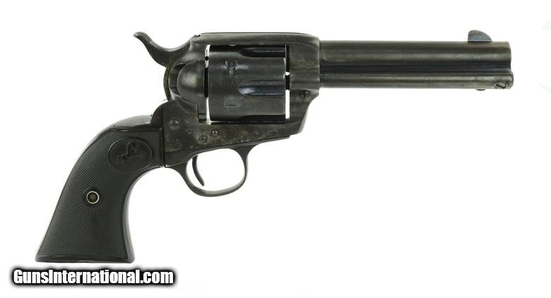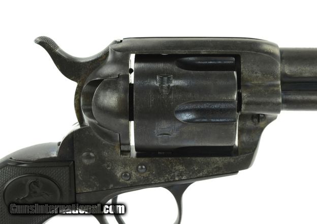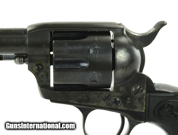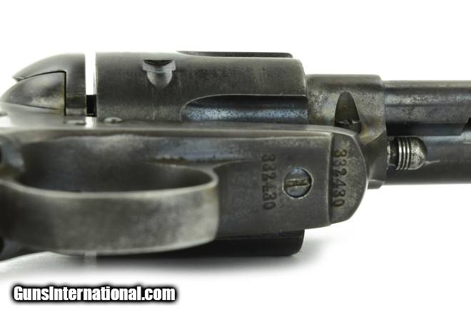 Colt Single Action Army .32 WCF caliber revolver. 1st Gen made in 1916 with 4 ¾” barrel. Bore has strong rifling with minor frosting. Metal has a brown patina with some original blue in protected areas of the flutes and ejector rod housing. Frame retains some original case colors in protected areas. Action work perfectly.