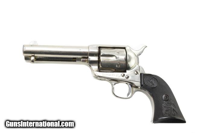 Colt Single Action Army .41 caliber pistol. Made in 1893. This is a 4¾” barrel in .41 caliber. This gun has an old nickel finish and the barrel address is not readable. Sight is replaced as well as grips. Gun locks up tight and works properly.