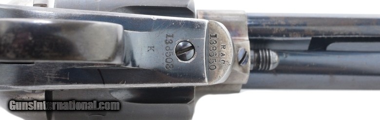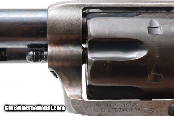 Colt Single Action Army Artillery Model .45LC caliber revolver. Made in 1891. This is an artillery model single action with correctly mismatched numbers. This gun is in very-fine condition with 85% of the original blue. Very-good case colors on the frame. The grips have been checkered during the period of use. Whoever checkered the grips tried to preserve the “RAC” cartouche and made provisions to do so. They then went over the cartouche to make it deeper. These guns were originally 7½” long barrel that were issued to the cavalry. They were retired, then brought back into service. When they brought them back, they reworked them. This entailed shortening the barrel and refinished all parts and refitting them. No attempt was made to put these guns back with original serial numbers. Very-fine gun. $6500.00