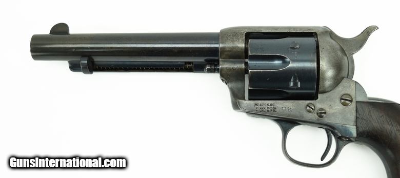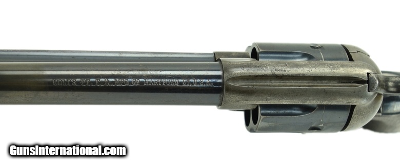 Colt U.S. Army Issue Artillery Single Action .45 Colt caliber revolver. Excellent bore. Action works perfectly. Gun has approximately 70% blue and 10-15% case colors. Grips are very good with R.A.C. cartouches. Dated 1902. Cylinder is marked with R.A.C.(Rinaldo A. Carr). Inspector mark on the rear face of cylinder. Very fine U.S. Artillery.