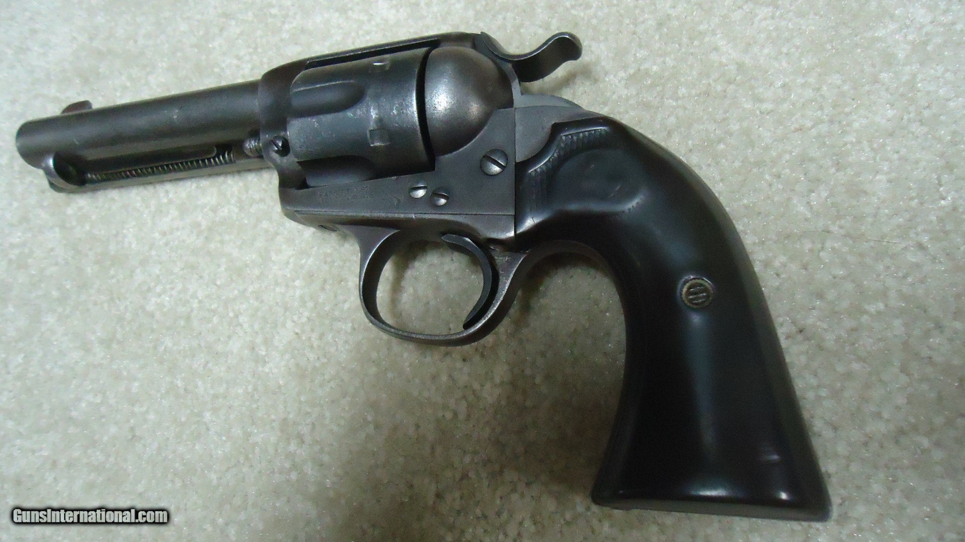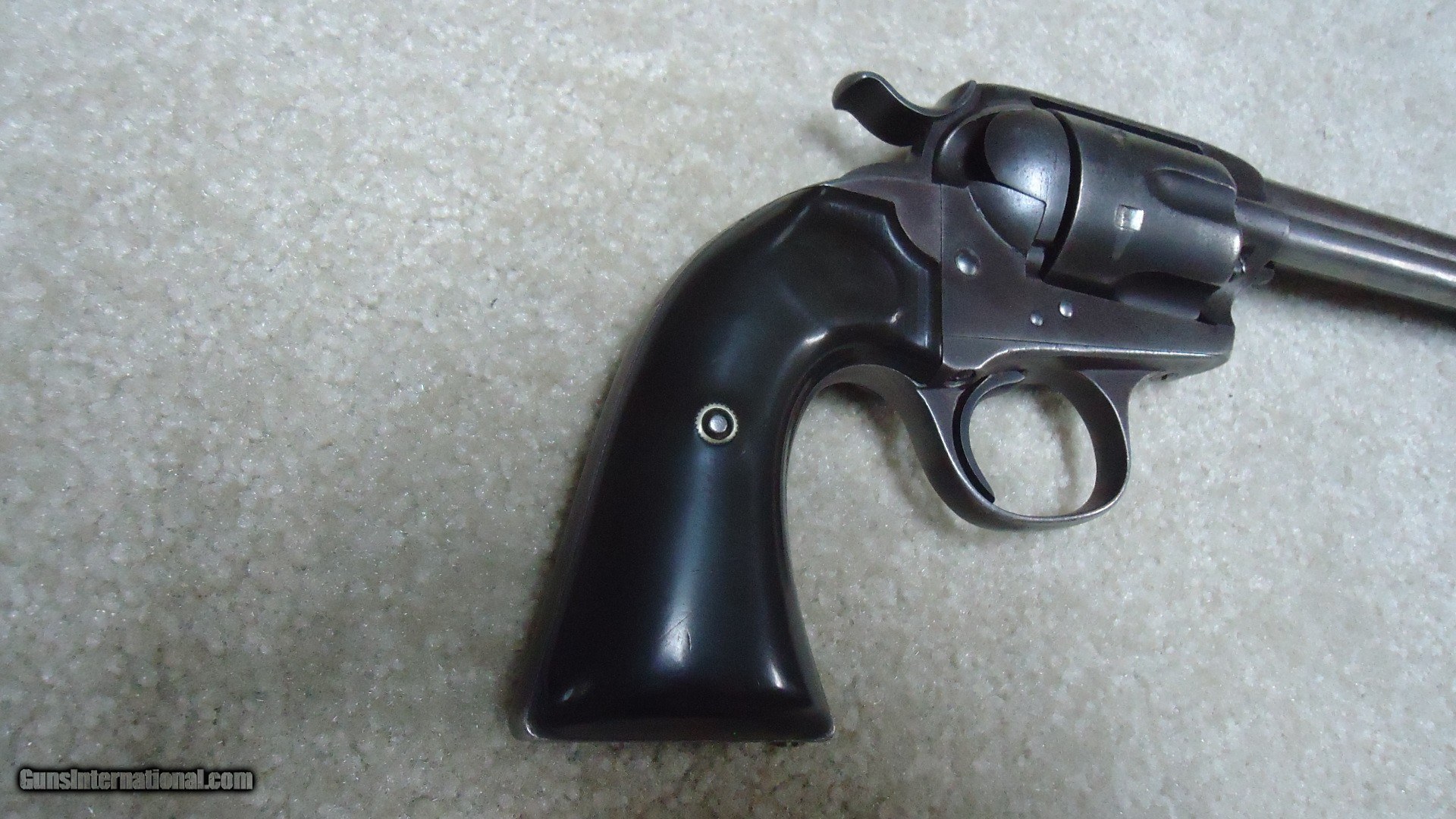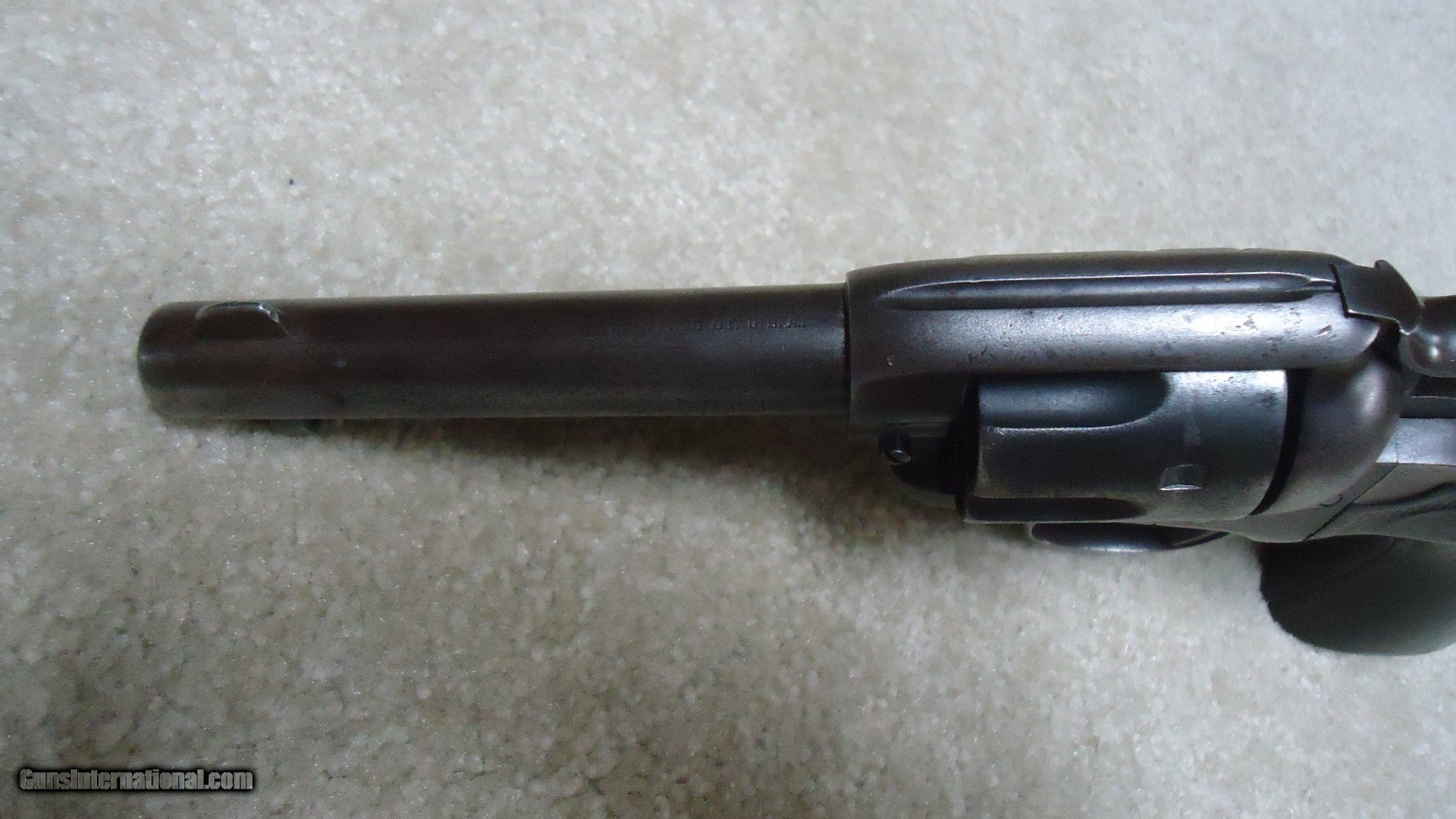 Description: DOCUMENTED AND IDENTIFIED EL PASO, TEXAS SHIPPED COLT BISLEY, .45 COLT CALIBER REVOLVER, 4 3/4", #284XXX, SHIPPED 1906. I know it's a cliché, but this is one I wish could talk! The Colt letter verifies the caliber, barrel length, blue finish etc. (grips not listed), as being shipped to Krakauer, Zork & Moye Co., El Paso, Texas on October 19, 1906 in an order of 7 revolvers. Many of these Colts sold through this company were purchased by Mexican Nationals. In fact, some of their ledgers still exist and they wrote the names/serial numbers of Colts they sold. In the ledger some names are simply noted as "Mexican." This one is listed in their records as being sold in 1907 to H. Mohr, who I believe was a doctor in the area who purchased a large number of firearms from Krakauer, Zork & Moye Co. Who he was supplying or selling guns to requires some more research. (A photo copy of the page listing this gun by serial number and purchaser from Krakauer, Zork K& Moye is included). The Mexican Revolution began in 1910 and ended in 1920. Old photos show loads of Winchesters and Colts being used in this bloody affair. This Bisley in .45 Colt chambering was obviously somebody's every day carry gun. The grips fit very well and are worn about smooth except for a very worn oval Colt in the top of each hard rubber grip with a small amount of checkering at the very top edge. The metal surfaces are a smooth gray/brown with much typical frontier holster wear on the left side where metal is actually worn away at the muzzle and "Bisley Model" markings are nearly obliterated. Correct two line barrel address on top of barrel and caliber marking on the side is good. Frame patent dates are also good. Screw heads are fine and the action is also fine. Looks like the front sight has been slightly filed, but looks good. the bore was very dark when I got this one. I ran a few oily patches through it followed by a brass brush and loads of black gunk came out. Bore is fairly bright with fine rifling and will probably clean out much better with some additional diligent scrubbing. Matching serial numbers. This one comes with the kind of Colt letter and history collectors love to see! Loads of Tex-Mex history in this one! Great used, but never over-cleaned appearance. SOLD Curio/Relic: Yes Handgun Caliber: .45 Colt Manufacturer: COLT Model: BISLEY Serial Number: 284XXX Barrel Length: 4 3/4 Condition: VG Bore Condition: FINE |