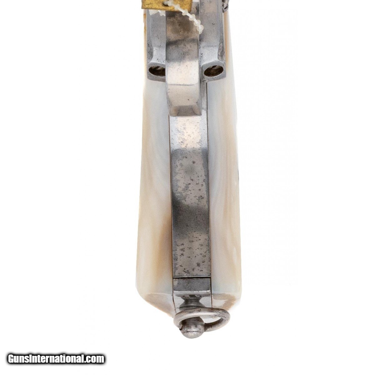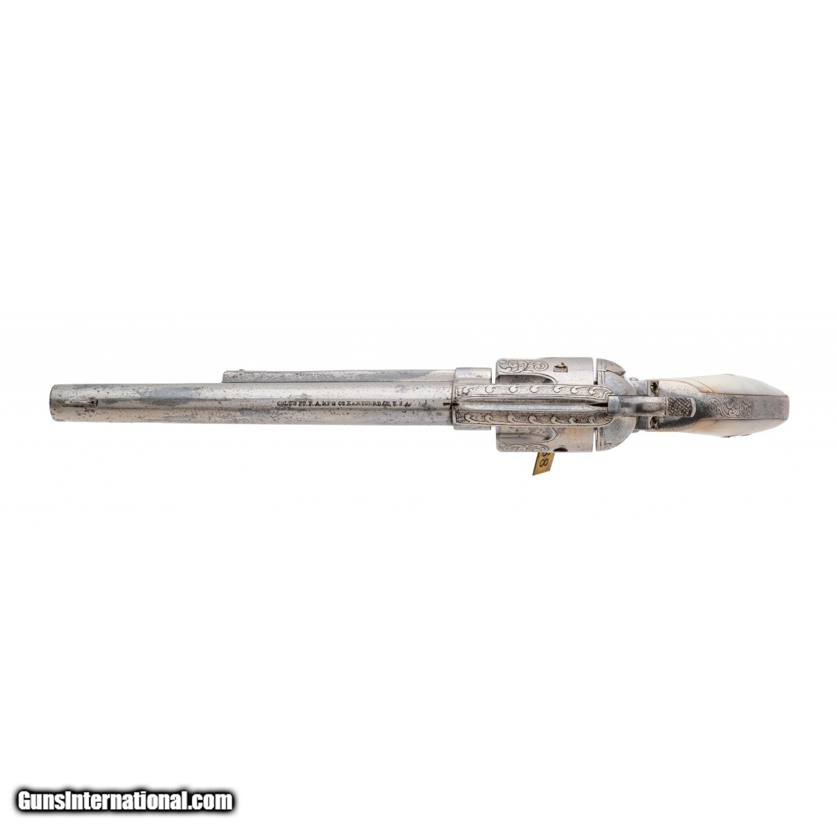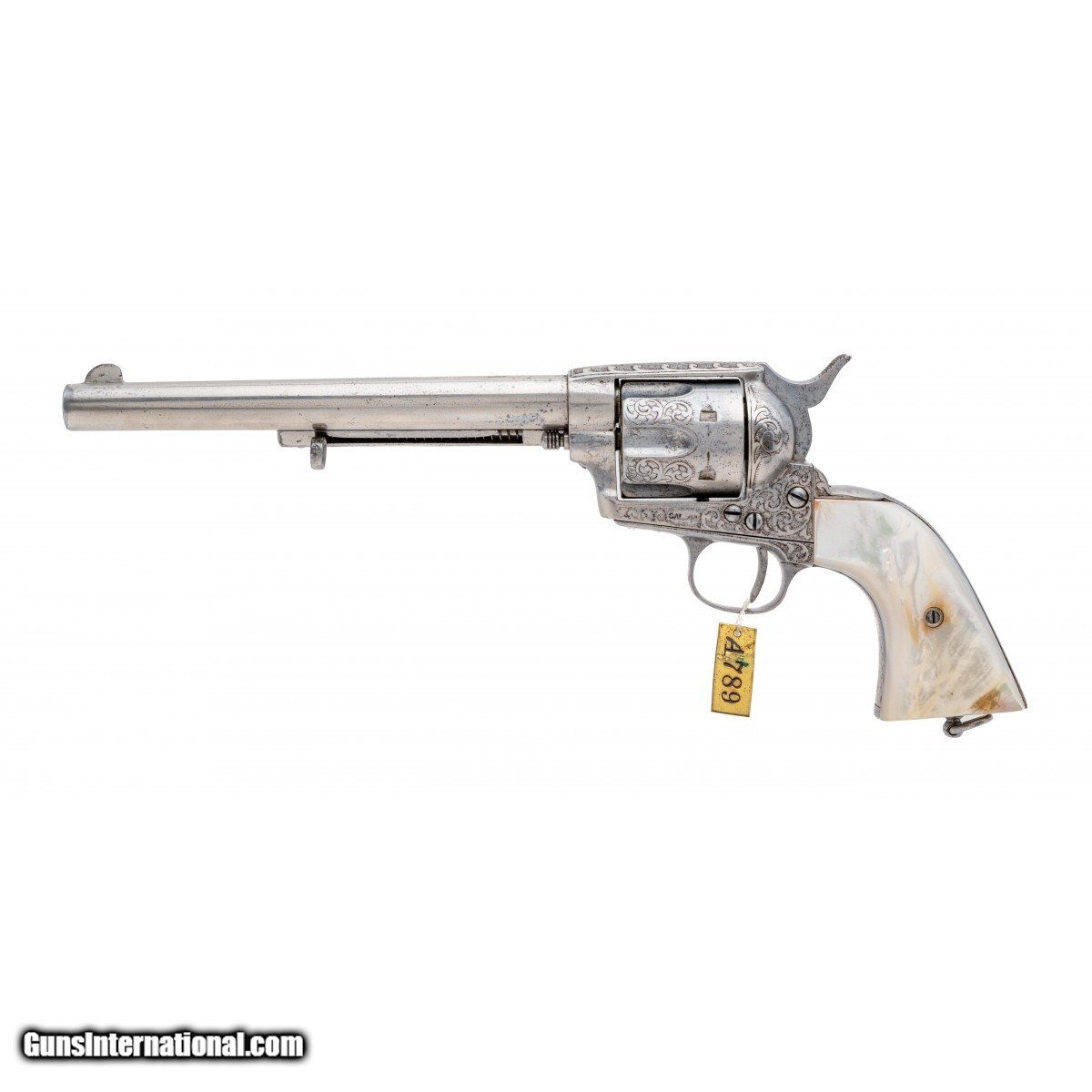 Description: "Serial numbers 178 & 154. Made circa 1880s- 1890s. 45 LC caliber with 7 ½" barrels. These guns are most likely Mexican or Spanish copies. These guns are in very fine condition with most of the nickel finish. Th frames and cylinders are engraved. Both of these guns has very fine two piece pearls. SOLD Antique: Yes |