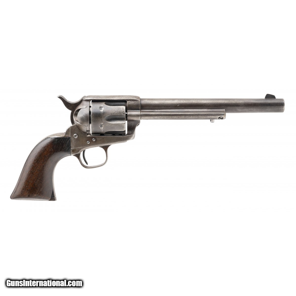 Description: "Serial number 12504. Made in 1874. 45LC caliber with a 7 ½" barrel. This is a Ainsworth inspected Colt Cavalry Model Single Action that was in the batch issued to the state of West Virginia and subsequently sold to the civilian market to raise funds. The majority of these guns found themselves on the western frontier. This gun has had some restoration which includes replace small parts like screws and cylinder pin. Some markings have been refreshed and possibly renumbered. SOLD Antique: Yes |