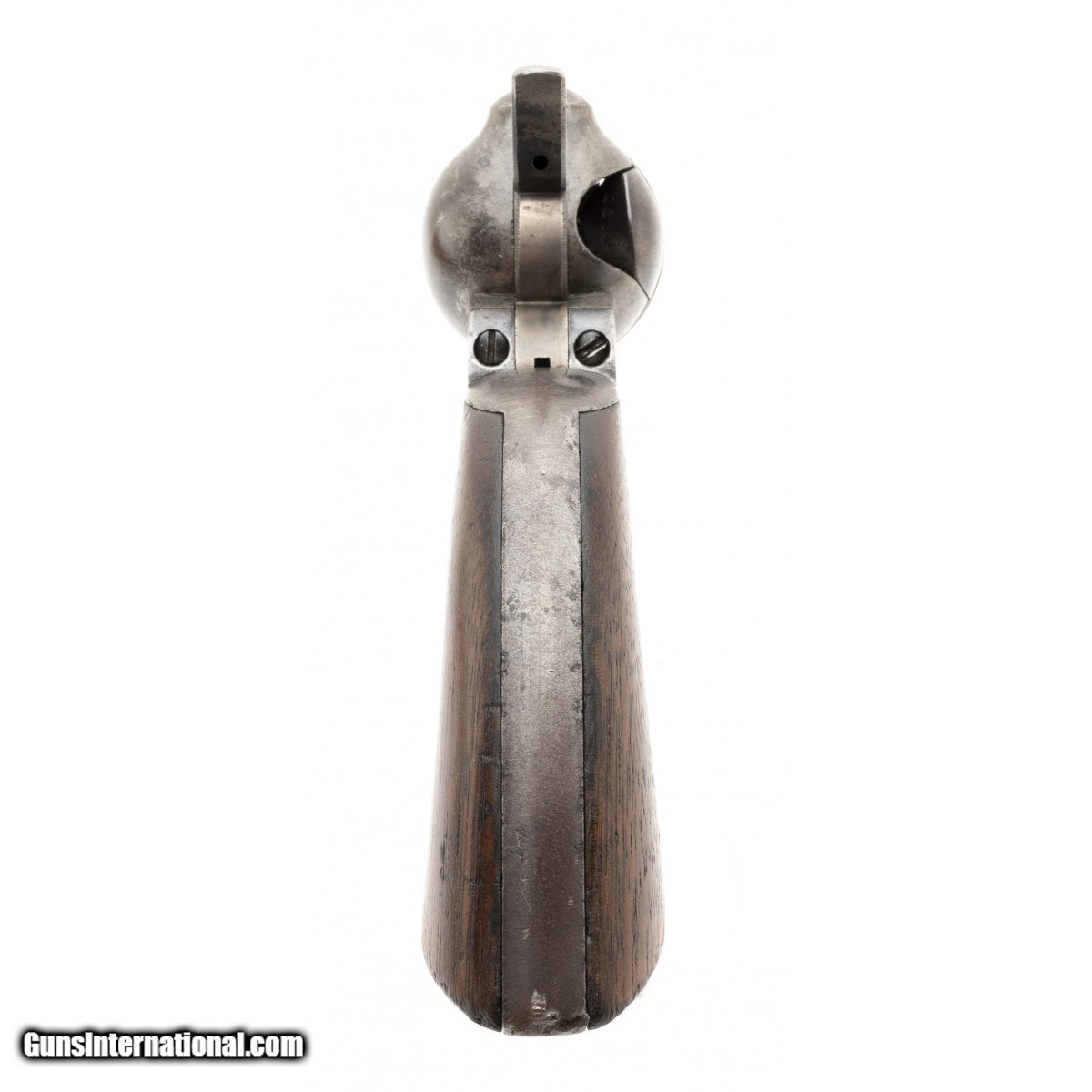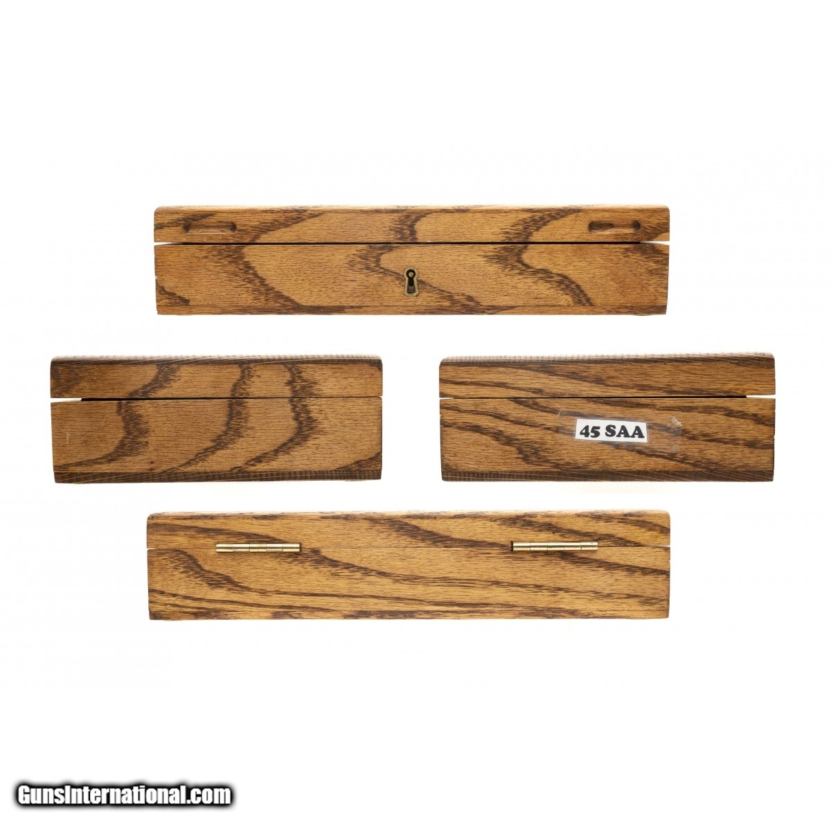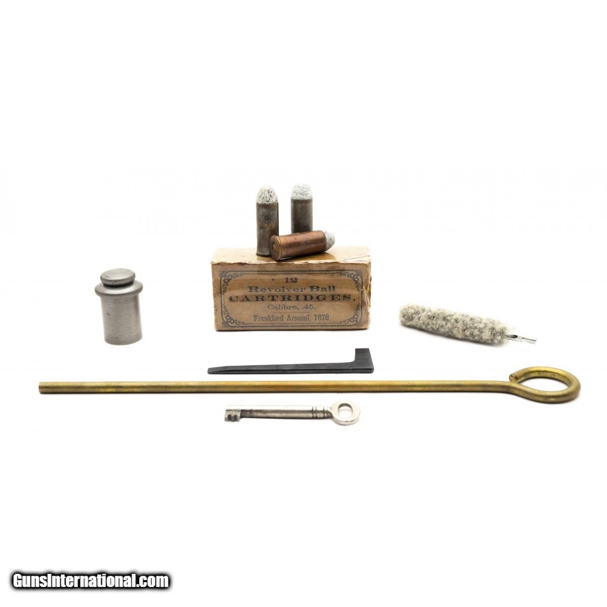 Description: "Serial Number 115062. Made in 1885. 45LC with a 5 ½" barrel. Metal has a dark gray patina. Blue finish remains on the protected areas. Action works well. Grips are very good. The numbers are correctly mismatched as these guns were refurbished by the arsenal and no attempt was made to assemble them with matching numbers. Gun comes with a well made custom case including a Frankford Arsenal box of cartridges dated 1878. Very nice set! SOLD Antique: Yes |