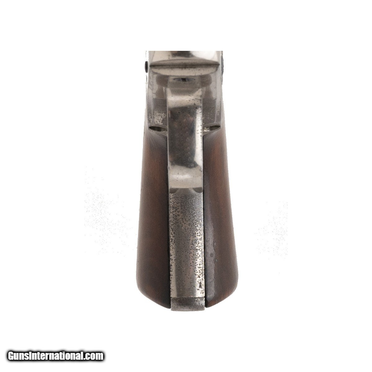 Description: "Made in 1876. 45 Boxer with a 7 ½" barrel. Beautiful gun with 85% of the original nickel finish. This gun is all matching and barrel shows any use. This gun has very small British proofs marks on the cylinder chambers and barrel. Grips are excellent. Box is very good with a complete label. Gun is all matching. Very Fine all original Colt Single Action Army! SOLD Antique: Yes |