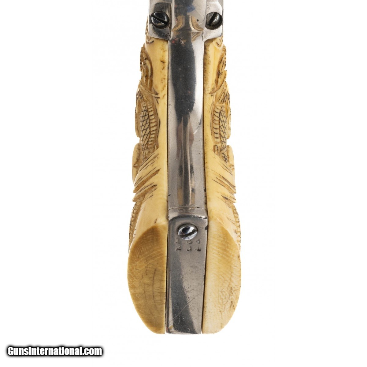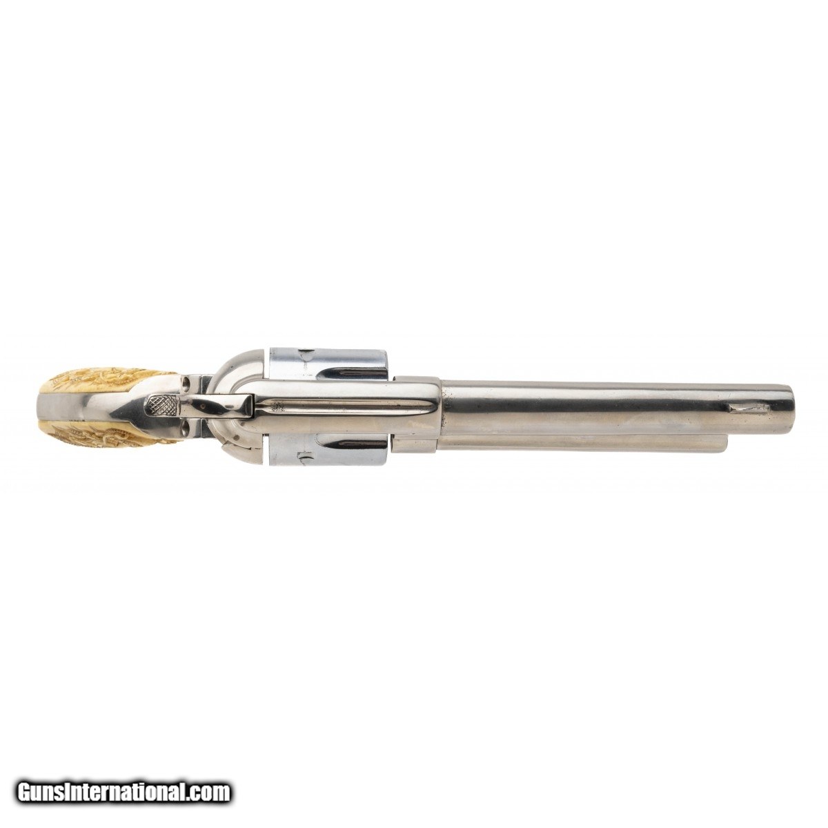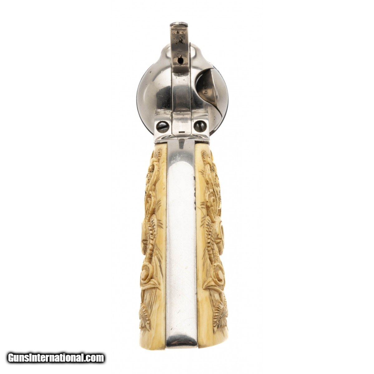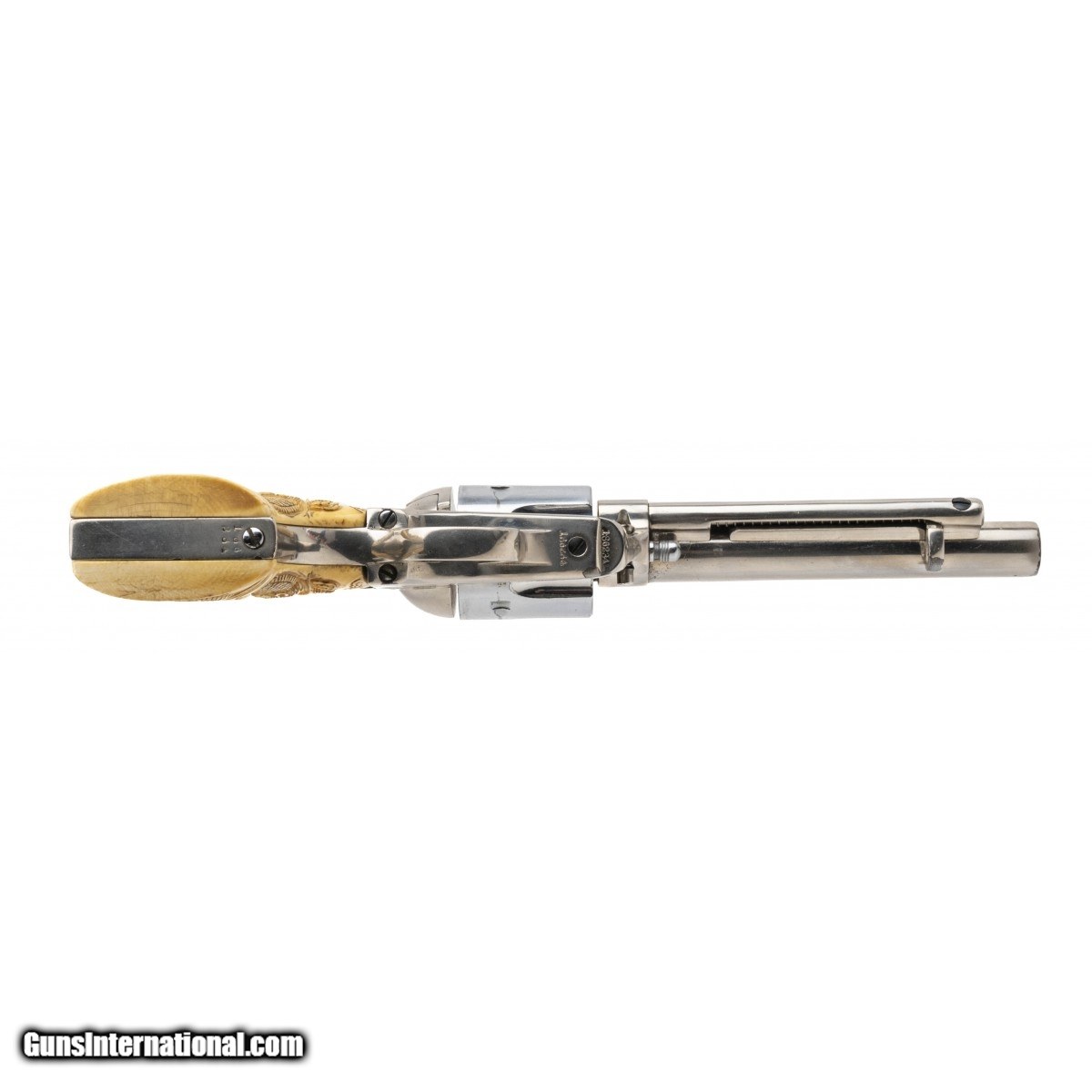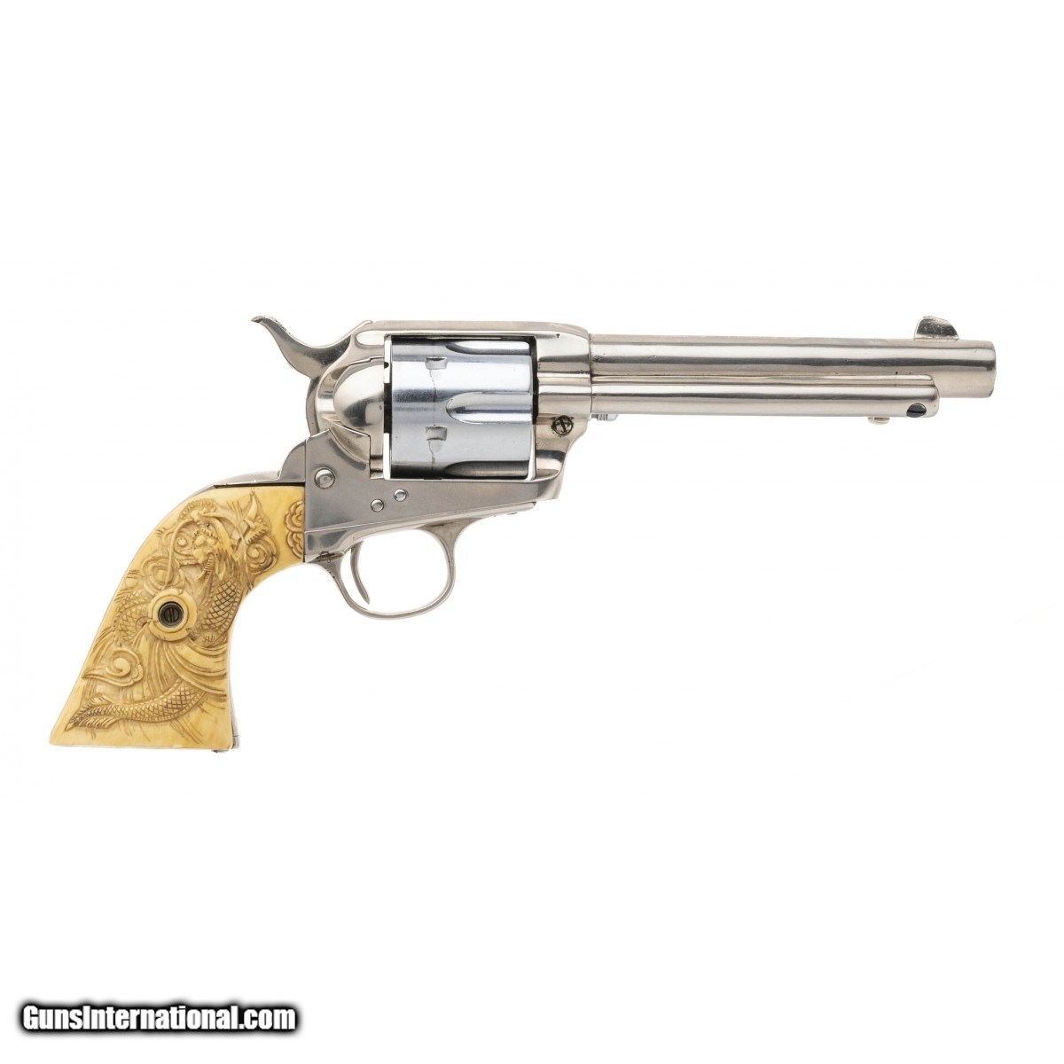 Description: " Serial No. 186234, made in 1899, .45 Colt, 5.75""round barrel. Revolver has non factory nickel finish with flaking visible at the muzzle, light surface scratches are also noted. Cylinder has a chrome finish, serial numbers are matching. Bore is good with frosting noted in the grooves. Beautiful Dragon carved Ivory grips are in excellent condition. Action indexes correctly with a tight lock up. Consignment SOLD Curio/Relic: Yes |