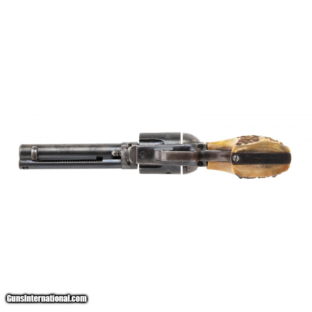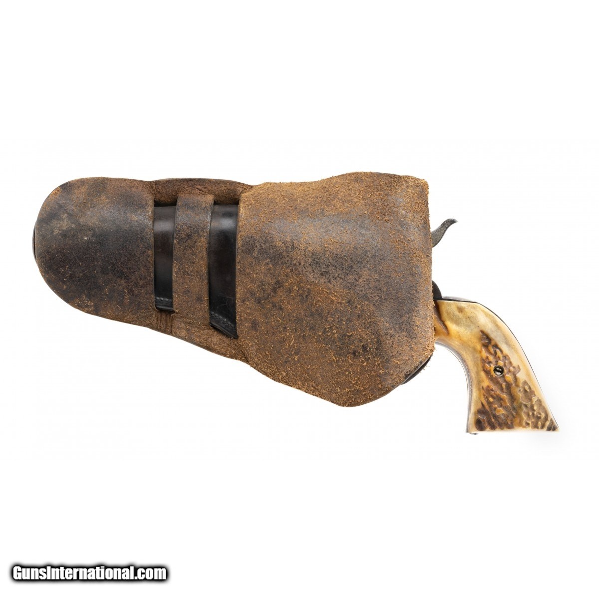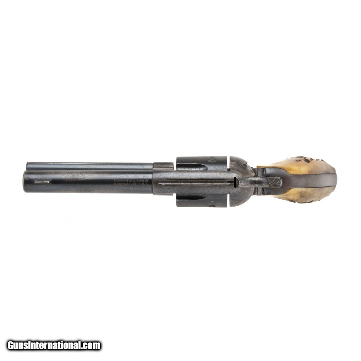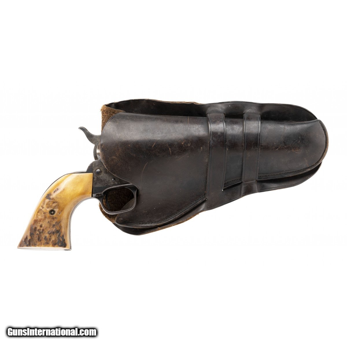 Description: " 1st generation single action army with 4.75"" barrel, made in 1920. Serials are matching. The bore is good with good rifling with some shallow pitting throughout. Has 40% of its blue finish mixed with brown patina. Case colors have lightly scattered colors. The action works perfectly. Has older stag grips in excellent condition. Overall very good condition. Comes with a period leather holster. SOLD Curio/Relic: Yes |