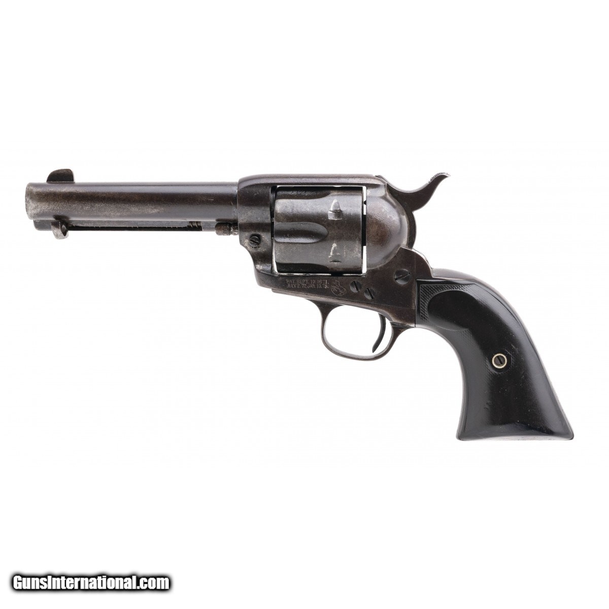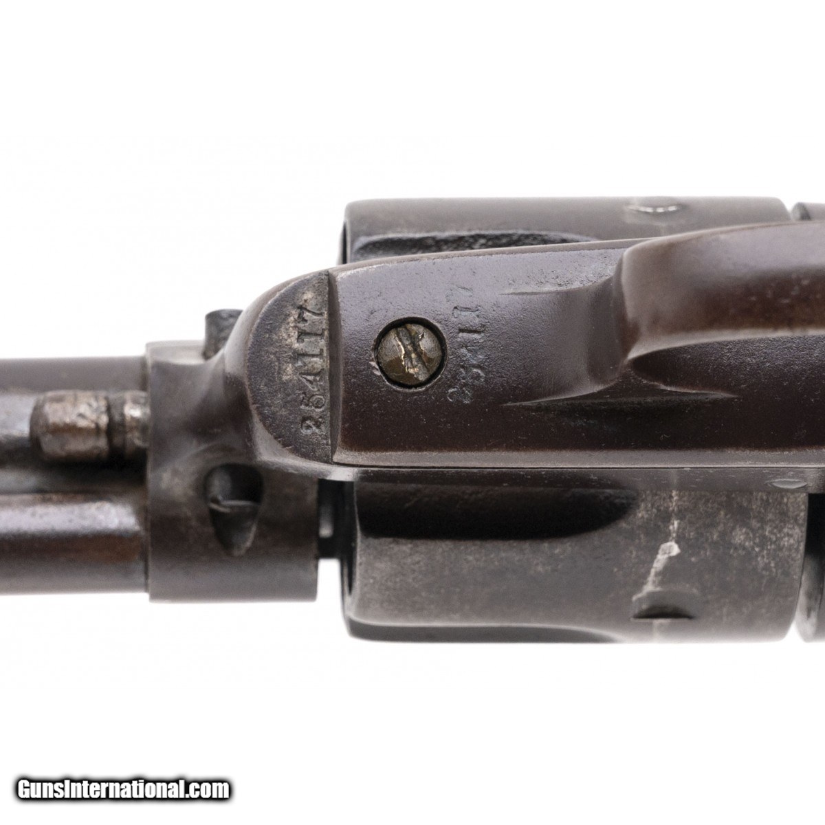 Description: " SN: 254117. Made in 1911. .45 Colt with a 4.75"" barrel. Bore is very good, strong rifling with light etching. The metal has an attractive brown patina throughout, with all markings legible. The grips have been worn smooth from handling. The action functions correctly. Overall good condition. (Consignment) SOLD Curio/Relic: Yes |