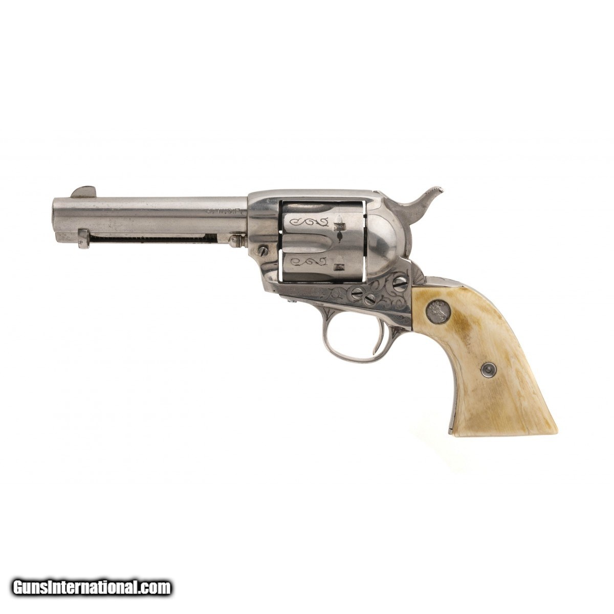 Description: "Serial number 337506. Made in 1919. 32-20 caliber with a 4 ¾". Gun has 95% of a very fine refinish. There is light post factory engraving. The grips a plastics made to look like ivories. Very attractive gun! SOLD Curio/Relic: Yes |