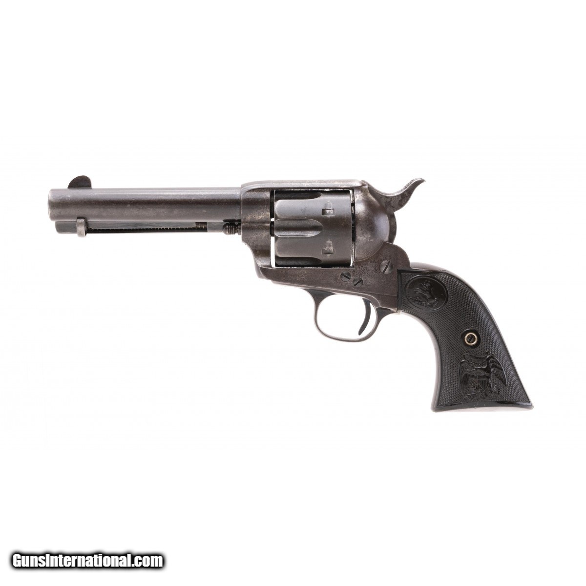Description: "Made in 1887. 45LC with a 4 ¾" barrel. Very nice sharp black powder gun. The barrel still has approximately 30% of the original blue finish. Frame has turned to mostly a brown patina with traces of colors in the protected areas The grips are very good pair of eagles. Action works perfectly. This is a very fine example of a short barrel black powder frame Colt Single Action Army! SOLD Antique: Yes |
