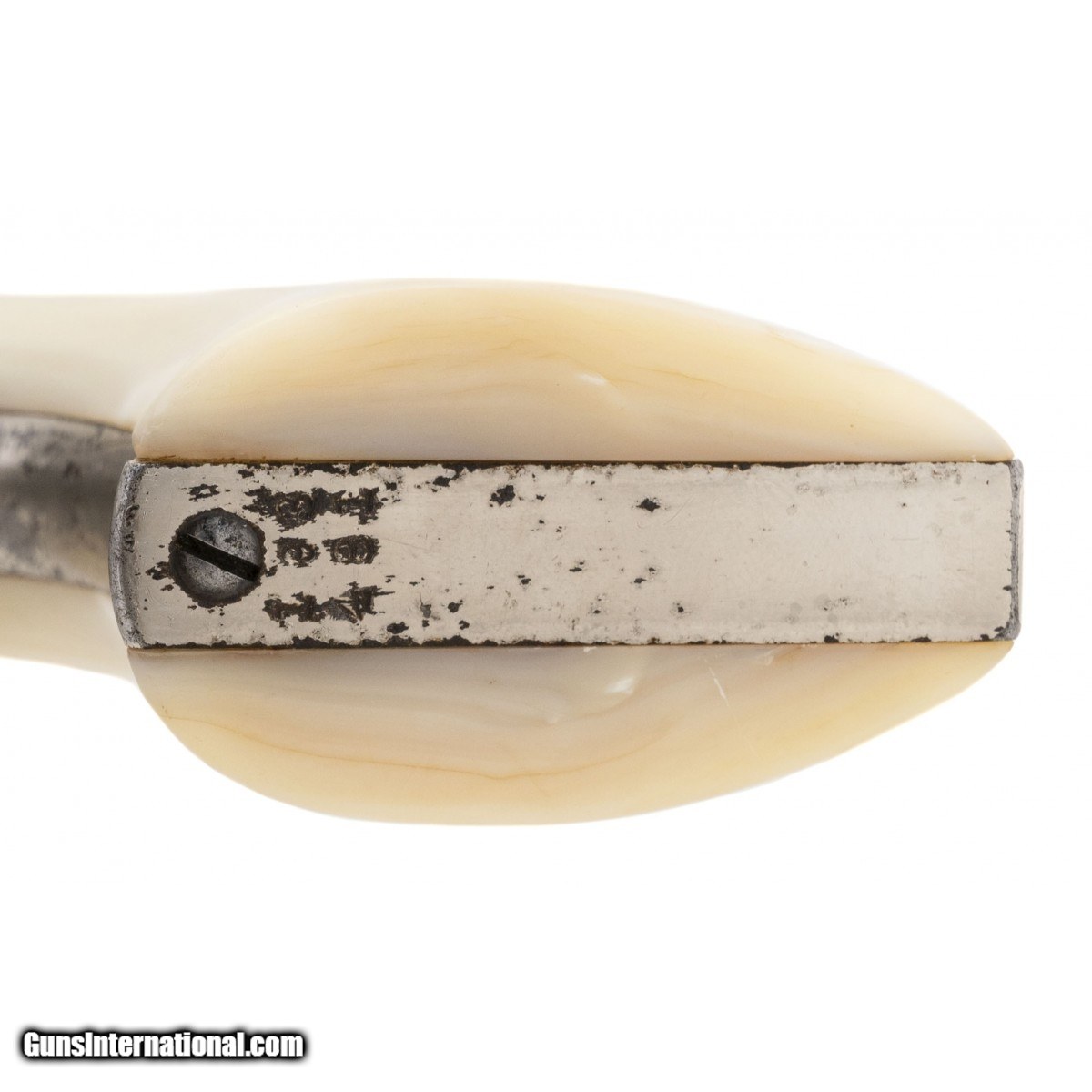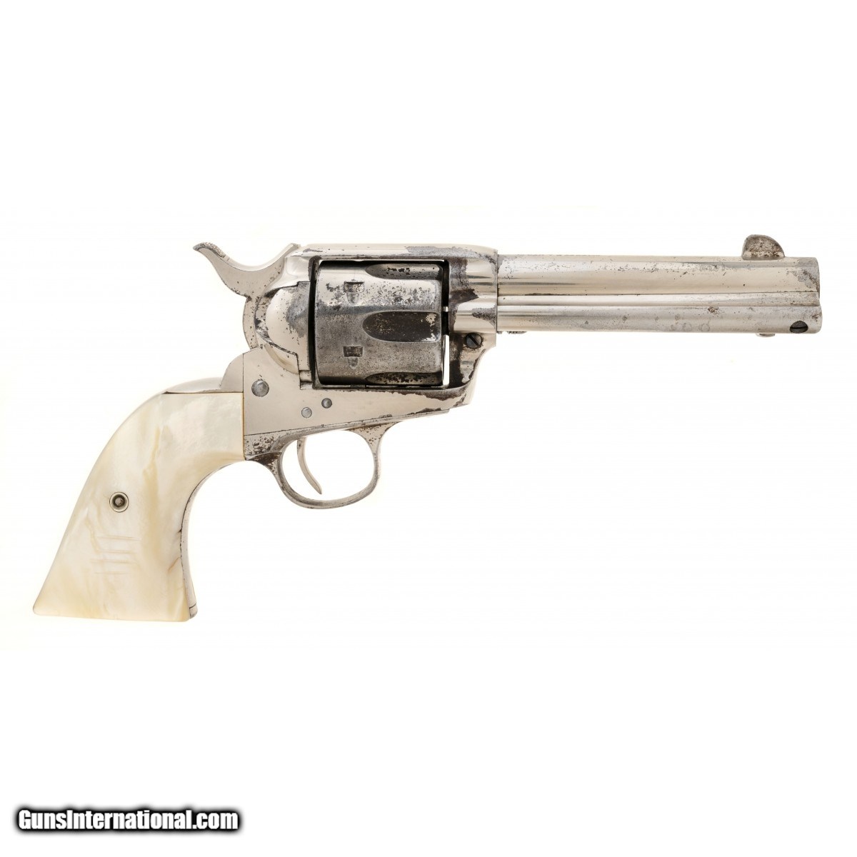 Description: "Serial number 193461. Made in 1900. 45 LC with a 4 ¾" barrel. Very fine gun with 90% of the original finish. This gun has period pearl grips. This gun comes with a factory letter confirming all features. This gun was shipped to Blish, Mize & Silliman Hardware Co. SOLD Curio/Relic: Yes |