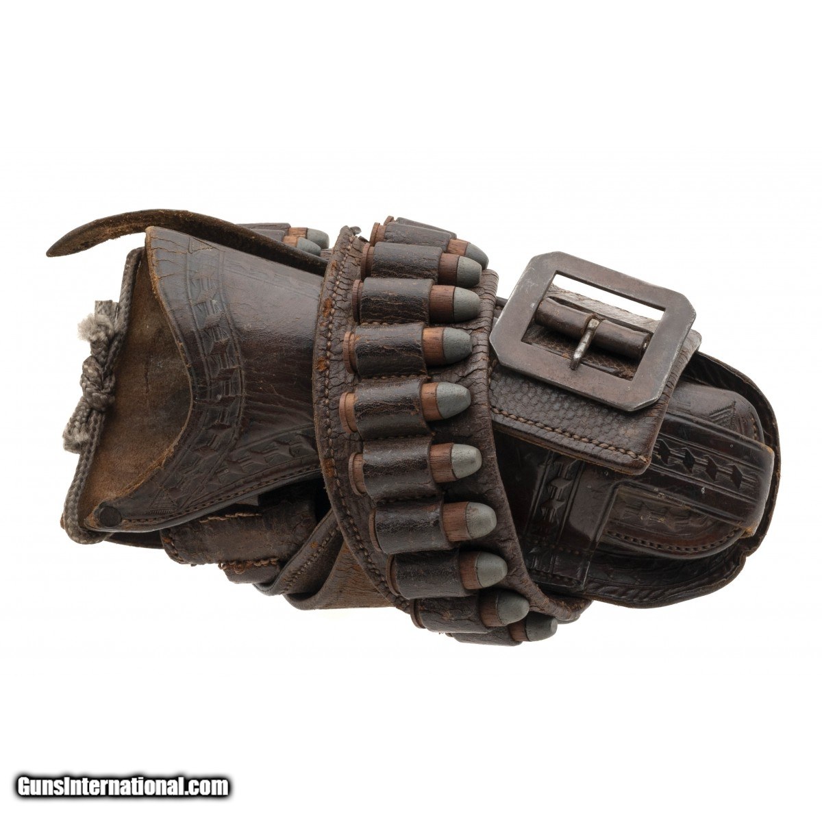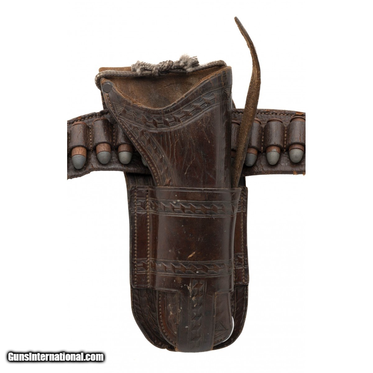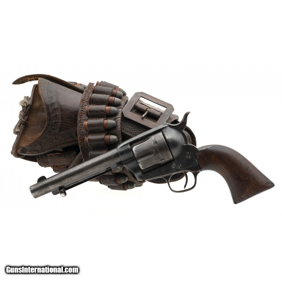 Description: "Serial number 1605. Made in 1874. 45 LC caliber with a 5 ½" barrel. This is a nice sharp Artillery Model Colt Single Action. These were made out of Cavalry model parts for the Spanish American war. These guns are all correctly mismatched. This is a nice sharp gun with a mostly dark gray patina. The frame has a dark gray to bluish finish which appear to be original manila arsenal case colors. This gun comes with a fantastic gun belt and Holster rig. The holster is the “jock strap" style and is tooled. No makers marks were observed. SOLD Antique: Yes |