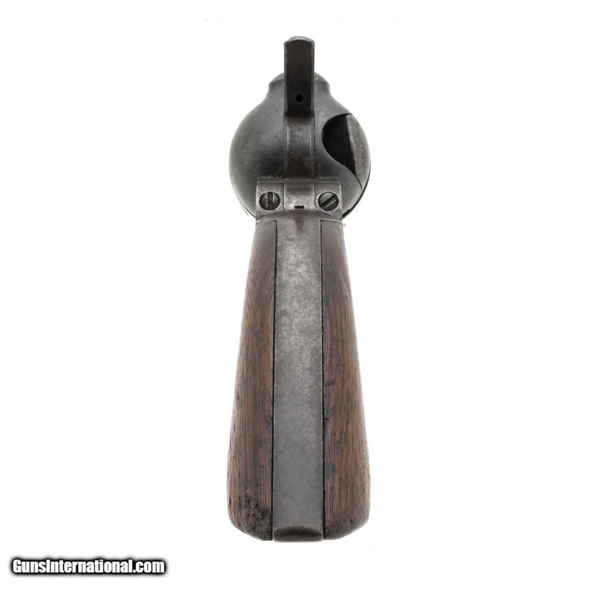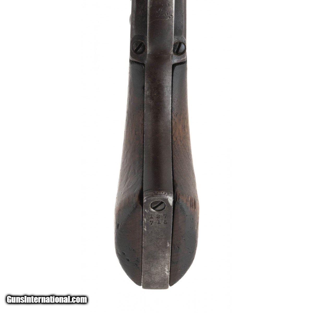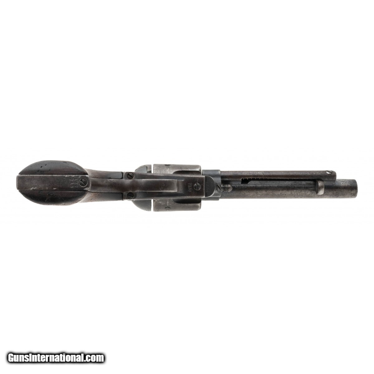 Description: "Serial number 1605. Made in 1874. 45 LC caliber with a 5 ½" barrel. This is a nice sharp Artillery Model Colt Single Action. These were made out of Cavalry model parts for the Spanish American war. These guns are all correctly mismatched. This is a nice sharp gun with a mostly dark gray patina. The frame has a dark gray to bluish finish which appear to be original manila arsenal case colors. This gun comes with a fantastic gun belt and Holster rig. The holster is the “jock strap" style and is tooled. No makers marks were observed. SOLD Antique: Yes |
