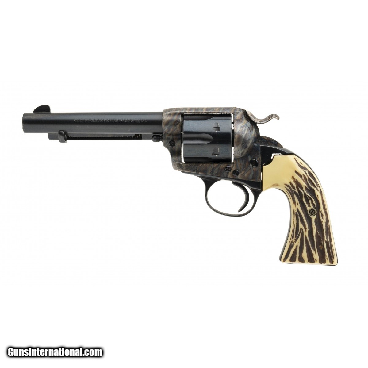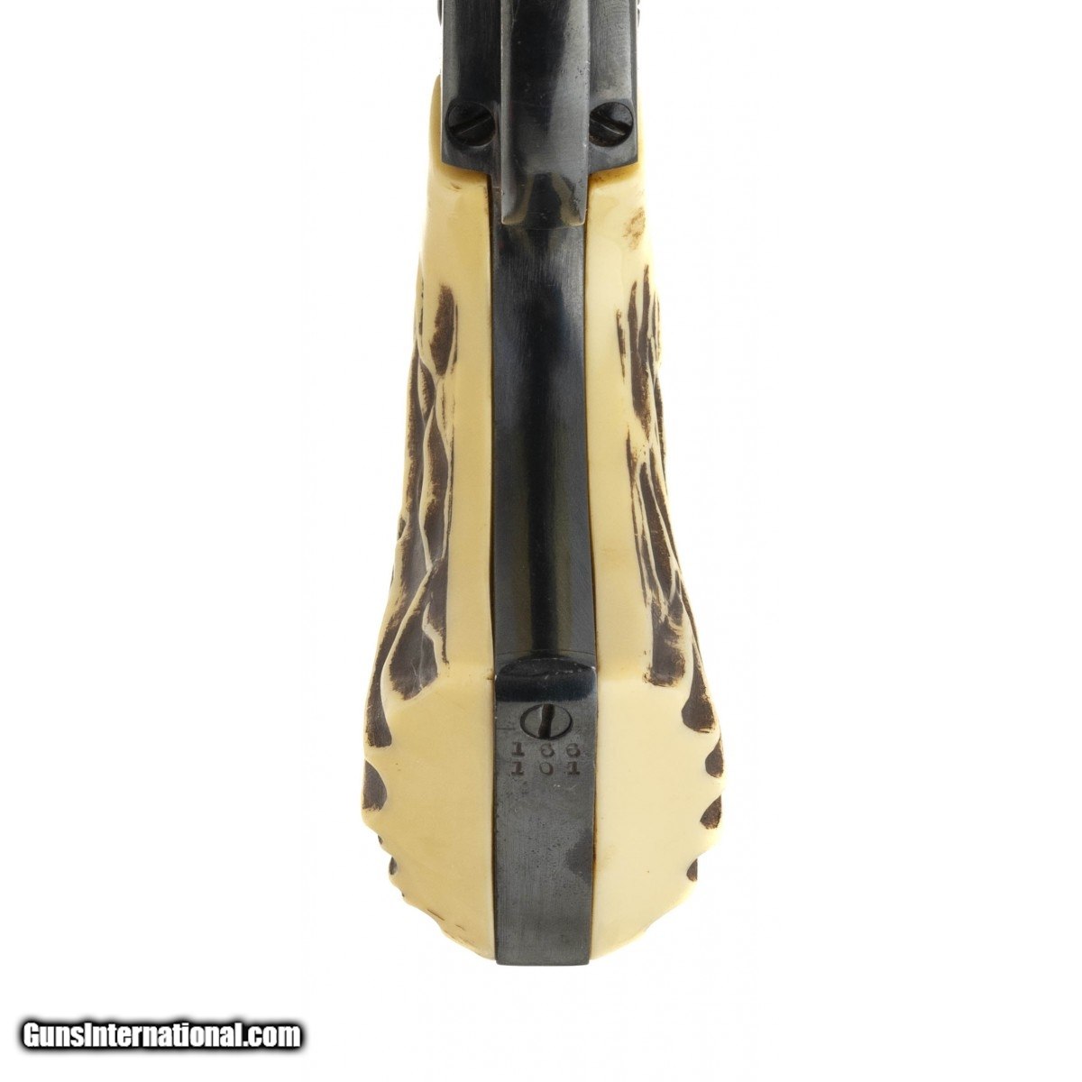 Description: "Serial number 166101. Made in 1896. 38 Special caliber with a 5 ½" barrel. This gun has been refinished to new condition. The barrel and cylinder have been replaced to later parts. Action locks up tight. Grips are replaced with plastic “stag" style grips. SOLD Antique: Yes |
