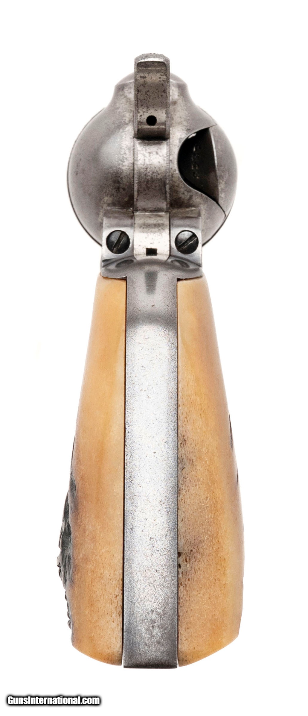 Description: "Serial number 233343. Made in 1902. 45 LC caliber with a 7.5" barrel. This gun has multiple replacement including the barrel. Several markings have been refreshed. Metal has a mostly gray patina. Grips are one piece stag. SOLD Curio/Relic: Yes |