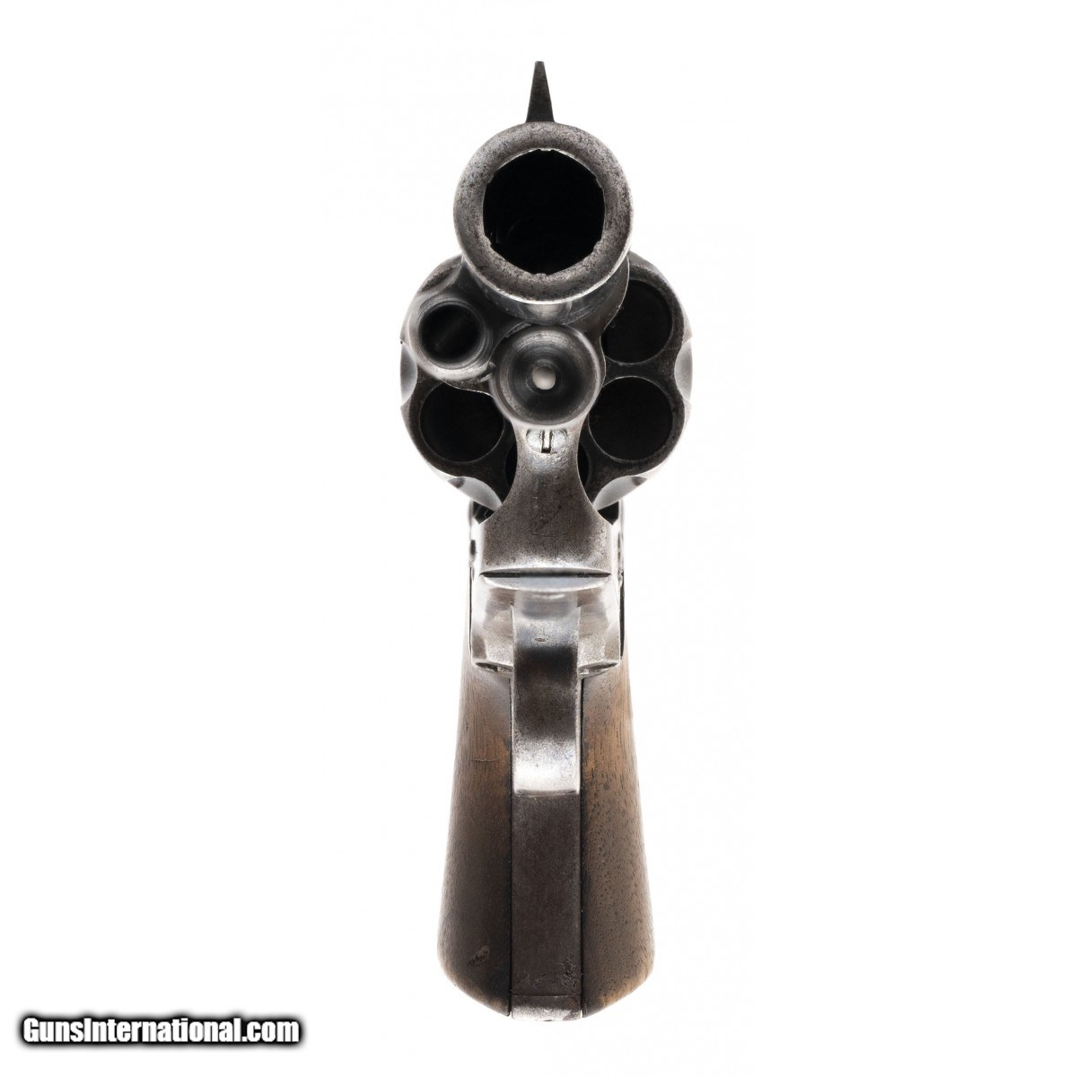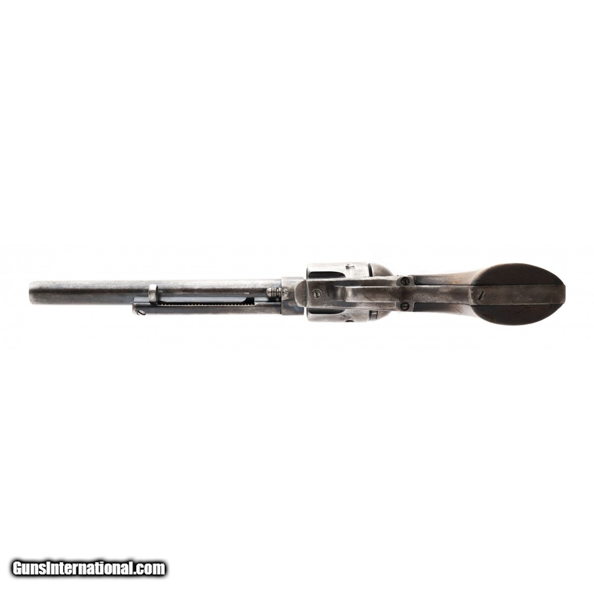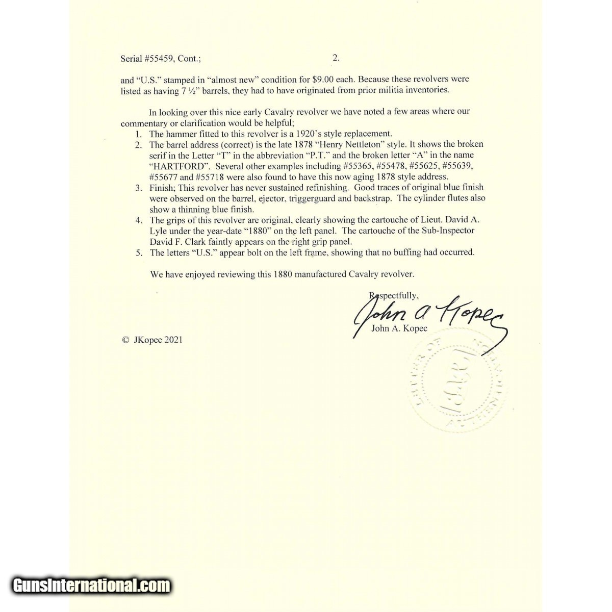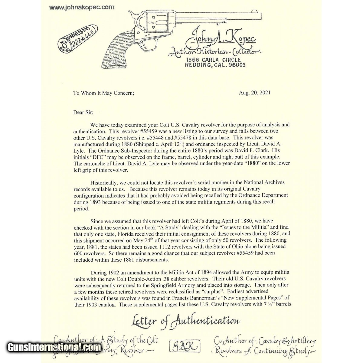 Description: "Serial Number 55459. Made in 1880. 45LC caliber with a 7 ½" barrel. This is a cavalry model inspected by David F Clark. Very fine gun with traces of blue in protected areas. Bright case colors remain on the frame forward of the cylinder. Grips are very good with visible cartouches dated 1880. Gun is all matching. The hammer is a later replacement. Action works well. This gun comes with a letter of Authentication from John Kopec. Mr. Kopec says this gun was most likely issued to the state of Ohio. Very nice example of a nice DFC Colt Cavalry Model! SOLD Antique: Yes |