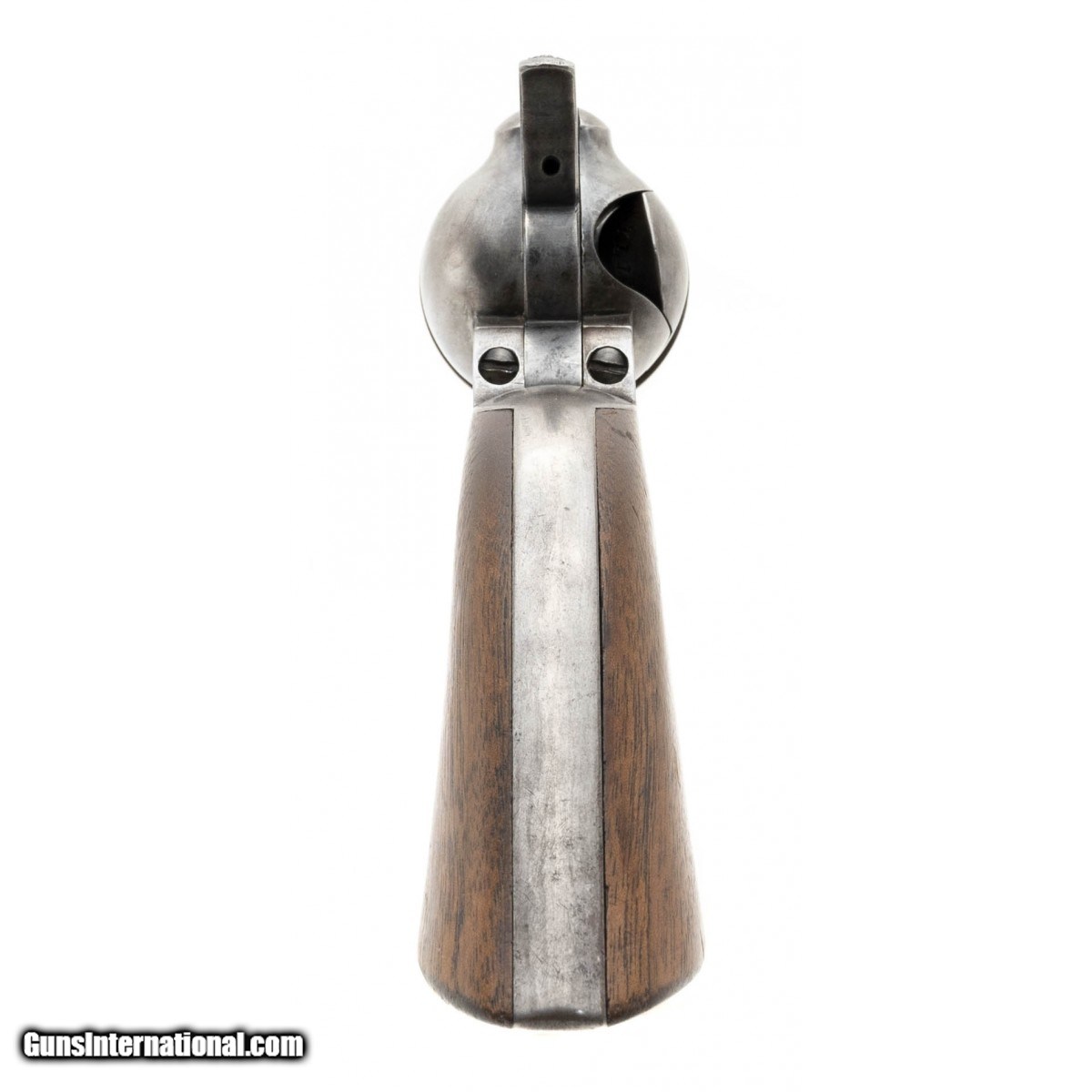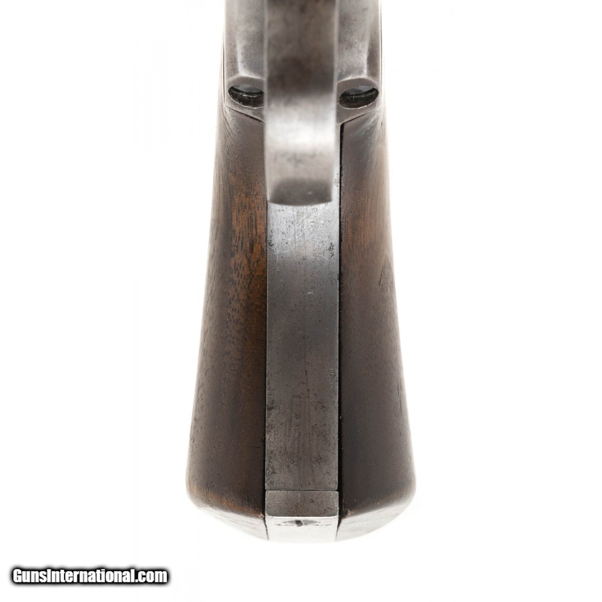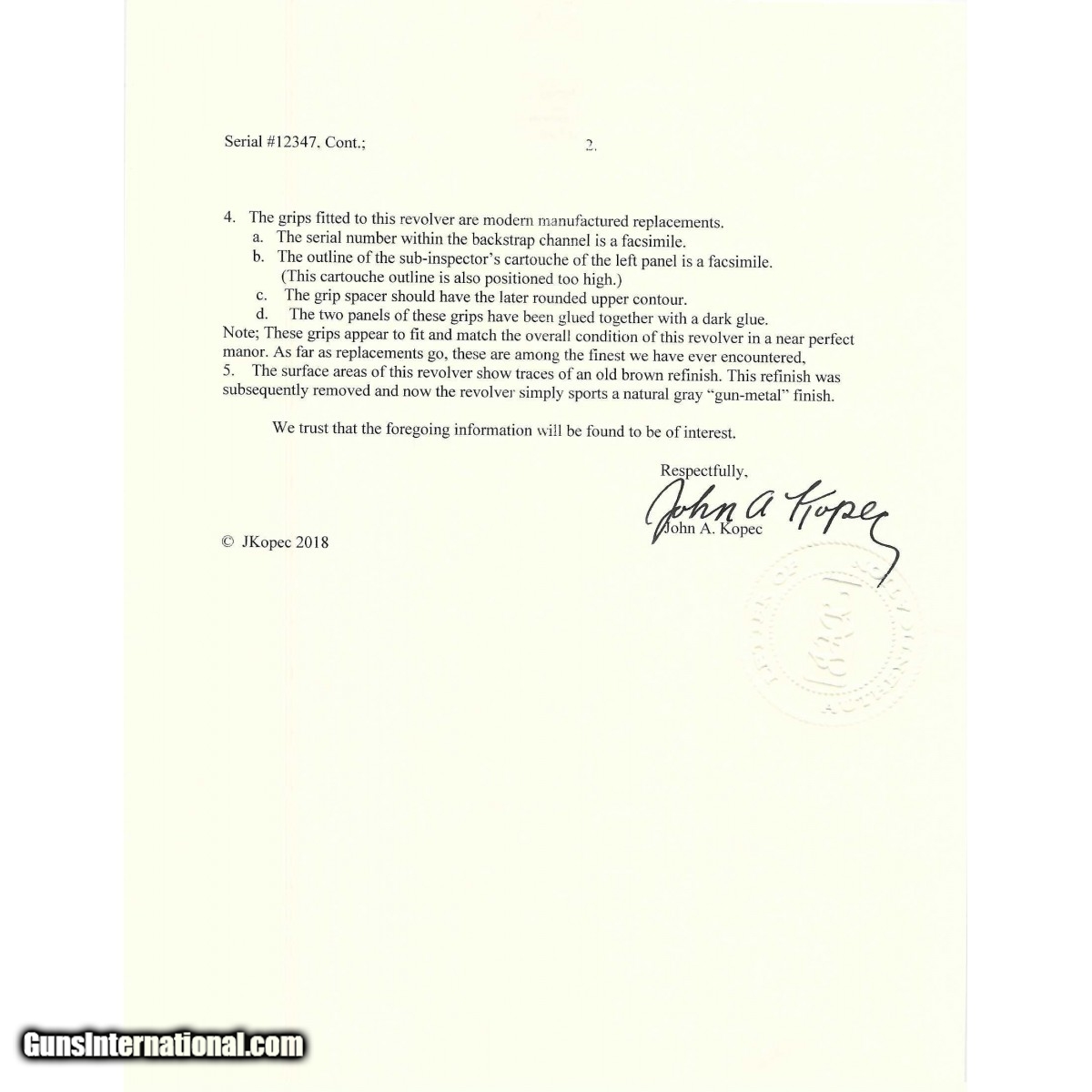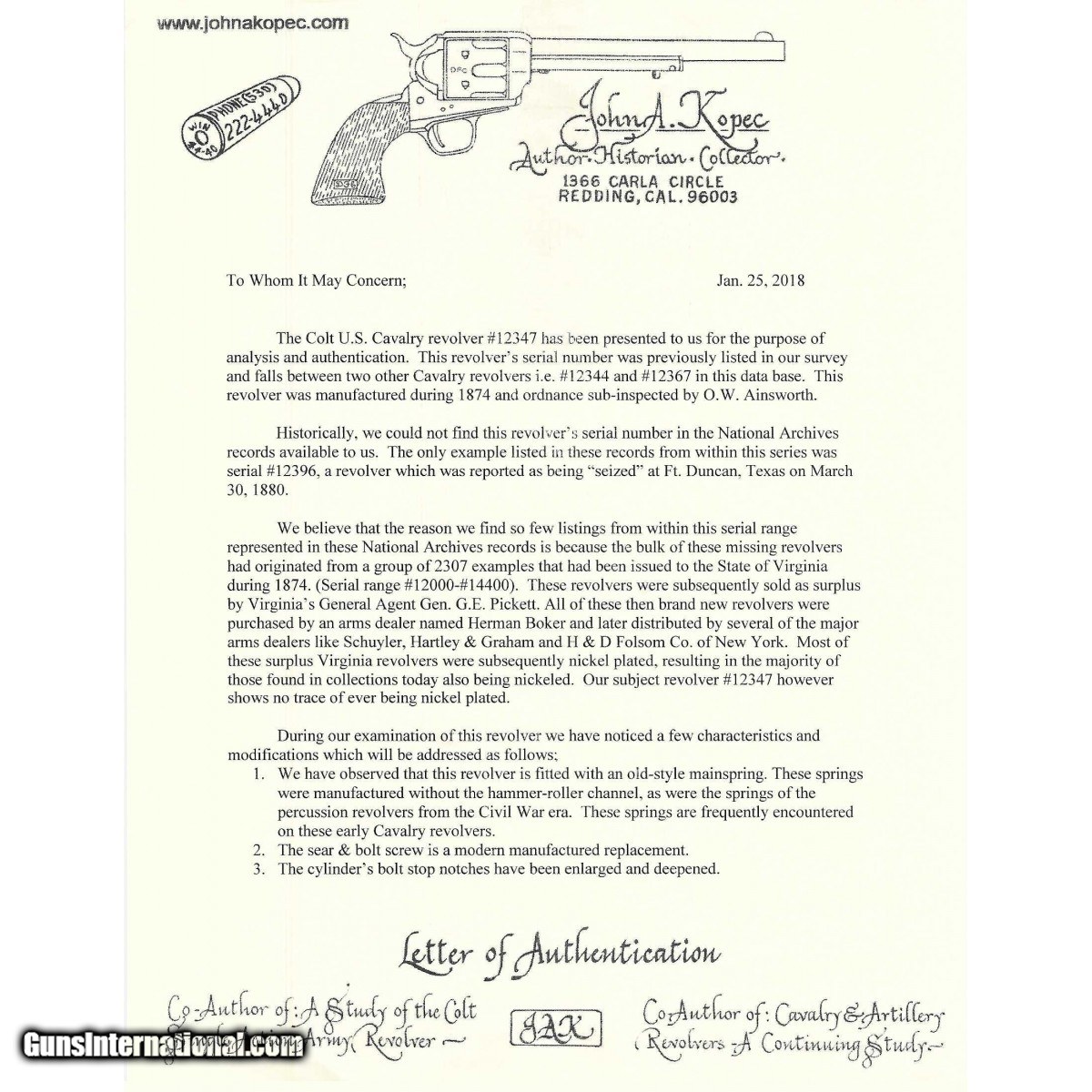 Description: "Serial number 12347. Made in 1874. 45 LC with a 7 ½" barrel. Very nice clean later Ainsworth model. Metal is sharp with clear markings. Action works well. This gun was inspected by O. W. Ainsworth. This gun comes with a letter from noted Colt expert John Kopec. Mr. Kopec said this gun as one of 2307 issued to the State or Virginia and subsequently sold to arms dealer Herman Boker. Mister Boker then sold these to firms like Schuyler, Hartley & Graham and H. D. Folsom of New York. Mr. Kopec goes on to list minor alterations like internal parts replaced and he says the replaced grips are the finest he has ever seen. Very Fine Colt Ainsworth Single Action Army! SOLD Antique: Yes |
