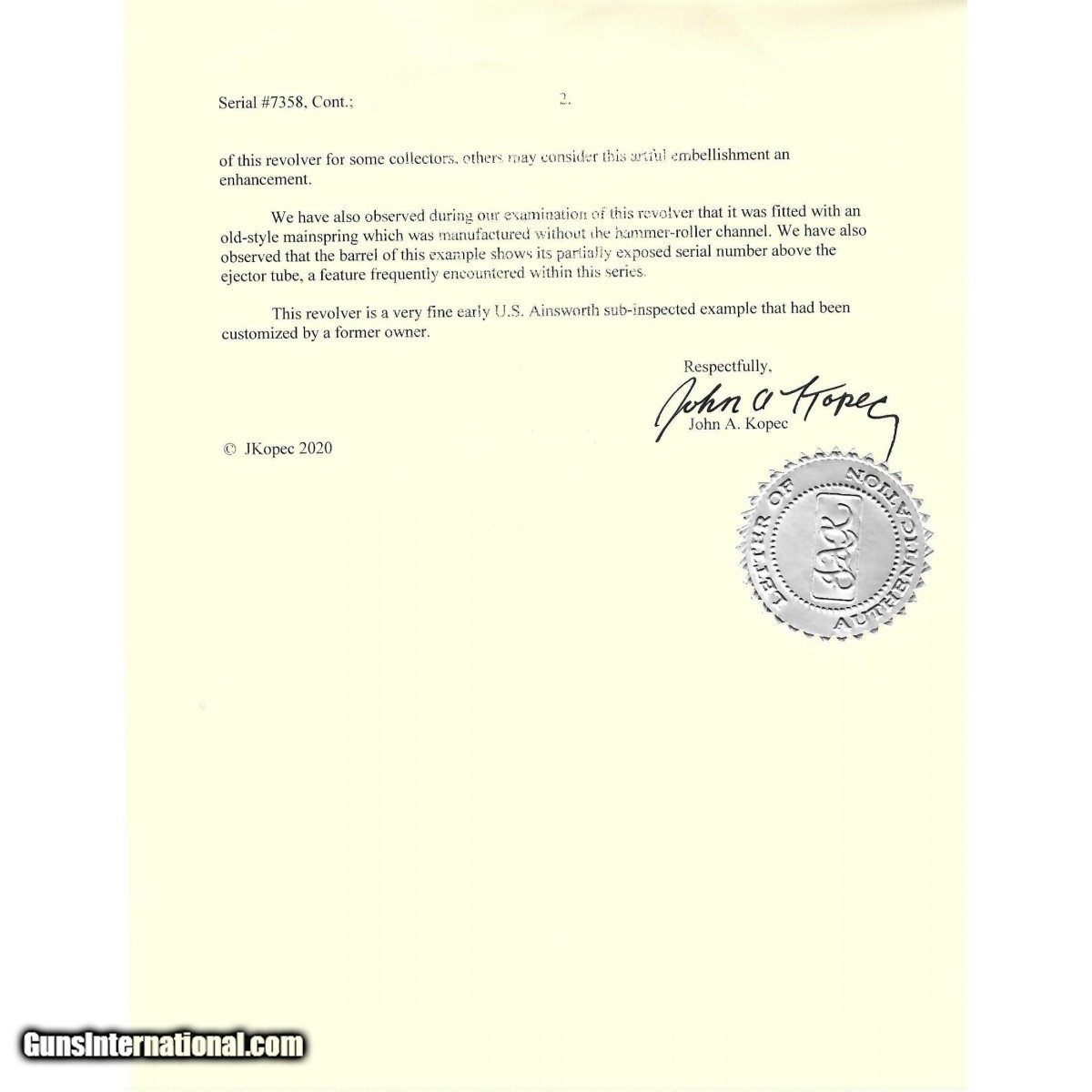 Serial number 7358. Made in 1874. 45 LC caliber with a 7 ½" barrel This is a nice sharp gun with a gun metal gray patina. The grips are period Colt made grips, but they are not military inspected. There is a steer head carved on the right hand side of the grips. This gun comes with a letter of authentication from noted Colt Single Action expert John Kopec. He declares it all original (with the exception of the grips) and awarded this gun the coveted Silver seal reserved for only the original and finest guns at Mr. Kopec’s discretion.