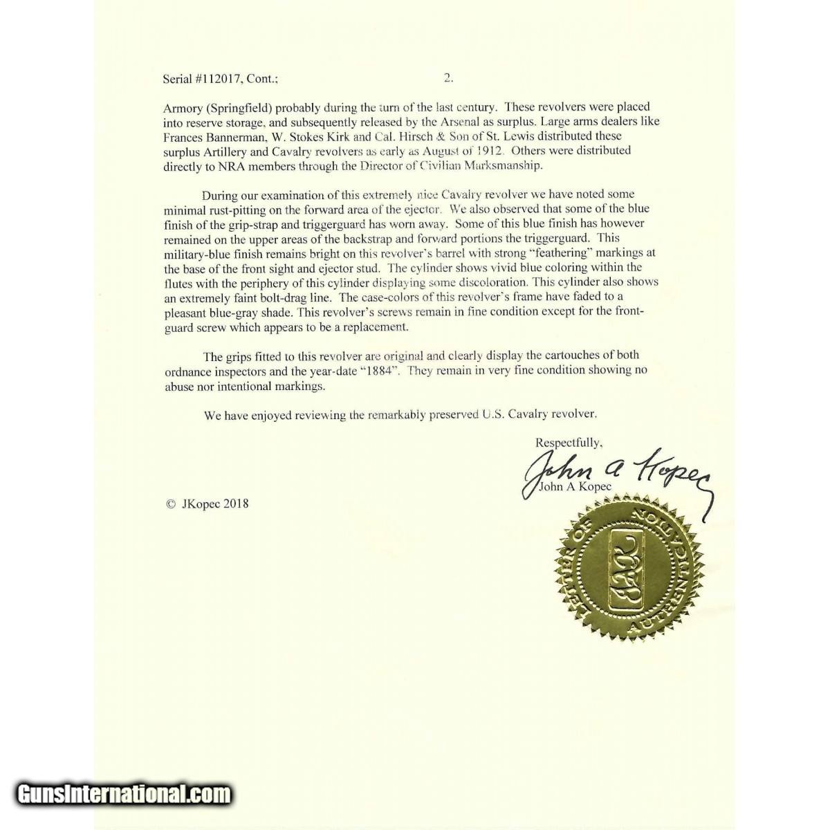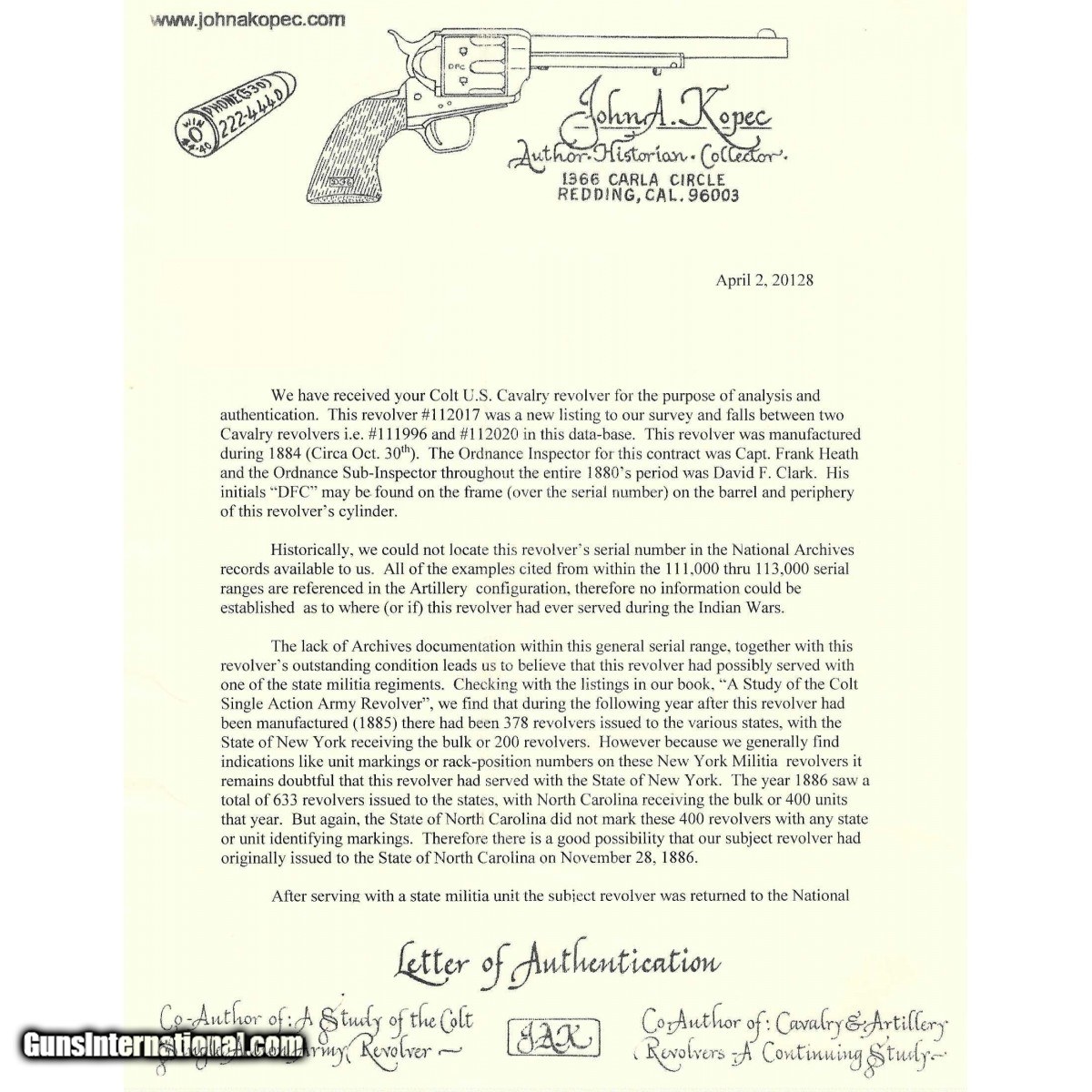Description: "Serial number 112017. Made in 1884. 45 LC caliber with a 7 ½" barrel. This gun is in Mint condition as restored. David F. Clark (DFC) was the government inspector. This gun comes with a letter of authentication from noted Colt Single Action expert John Kopec. At the time he wrote the letter, this gun was in all original condition and this gun was awarded the coveted gold seal. The gold seal is reserved only for the finest and all original guns! SOLD Antique: Yes |
