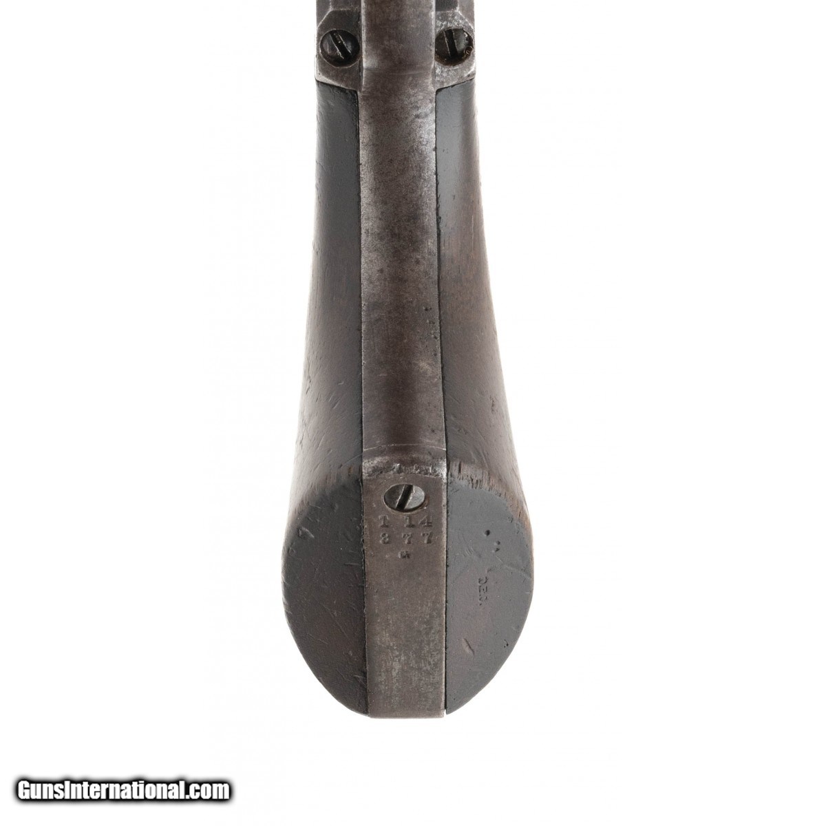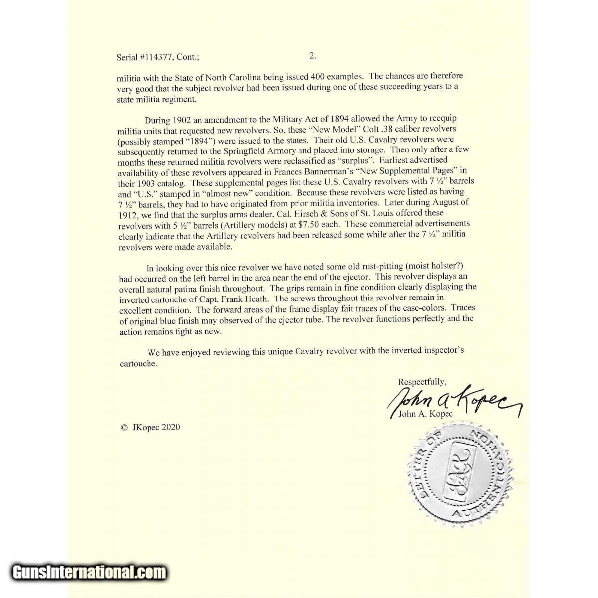 Description: "Serial number 114377. Made in 1885. 45 LC caliber with a 7 ½" barrel. Nice sharp gun with a even gray patina. Grips remain nice and sharp with good visible cartouches. Frame still has traces of case colors. This gun comes with a letter of authentication from noted Colt Single Action expert John Kopec. He declares it all original and awarded this gun the coveted Silver seal reserved for only the original and finest guns at Mr. Kopec’s discretion. SOLD Antique: Yes |