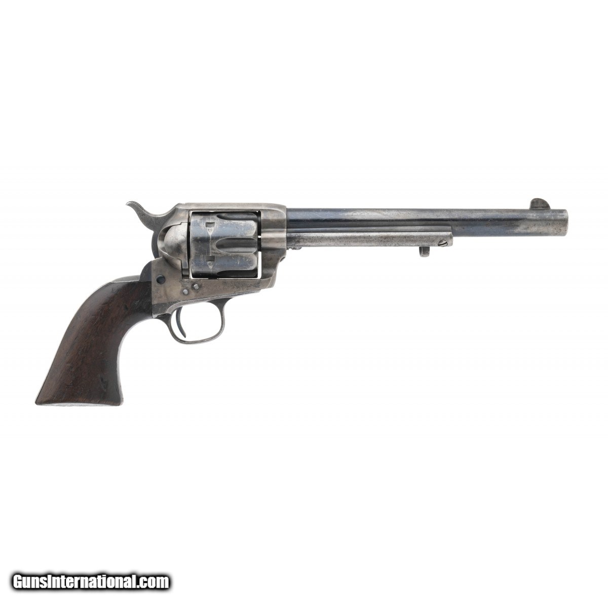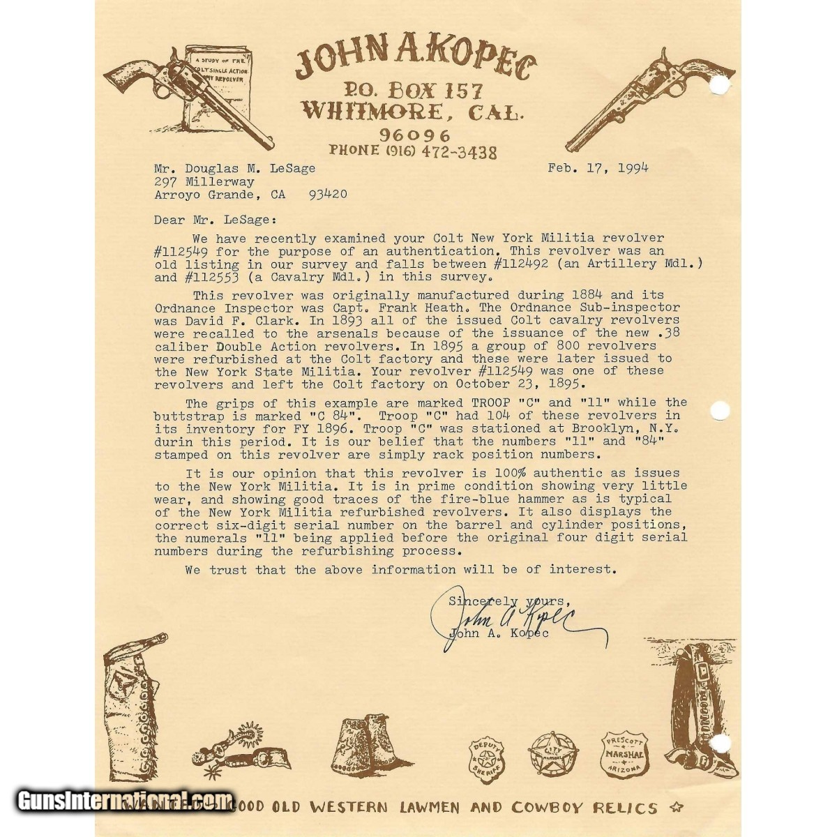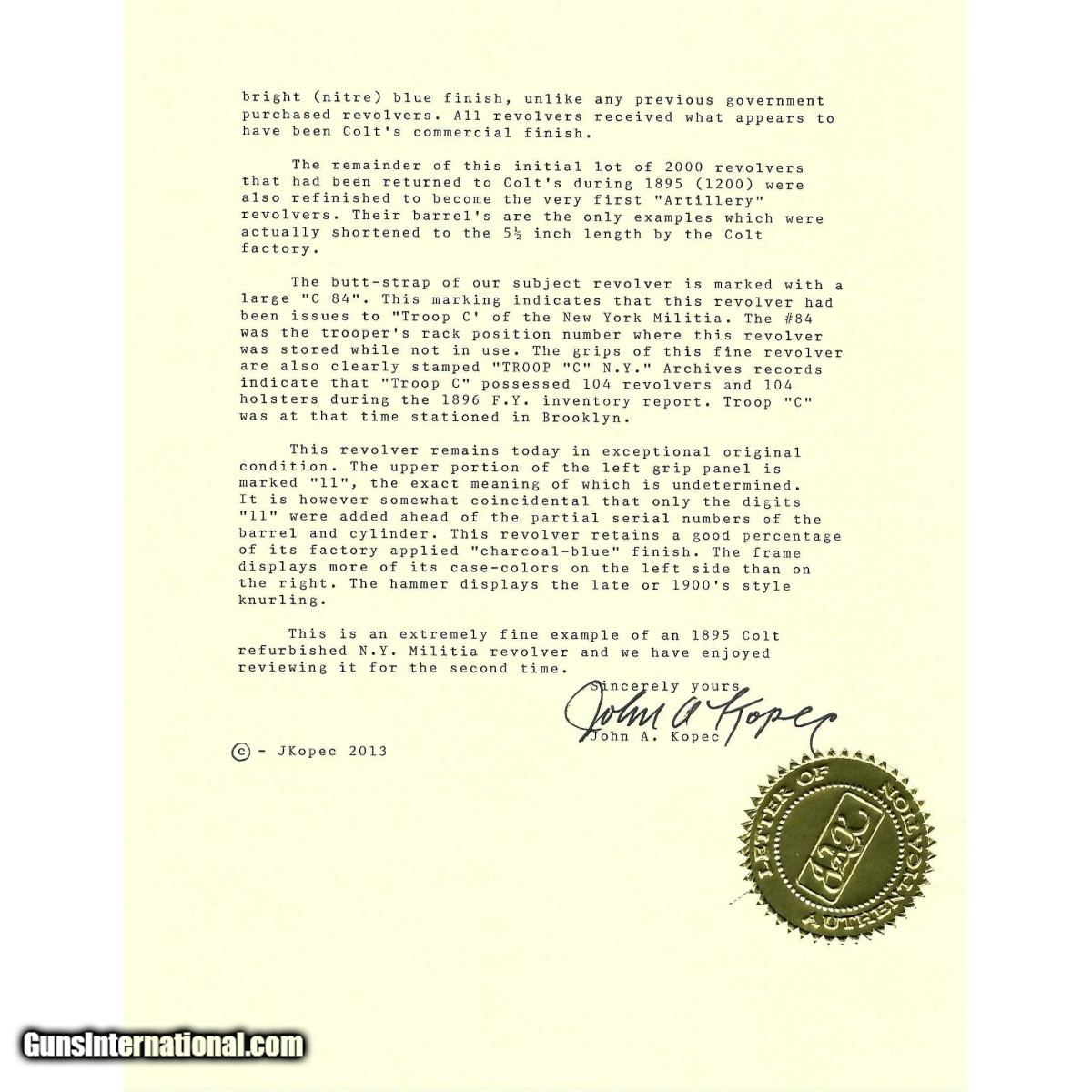 Description: "Serial number 112549. Made in 1884. 45 LC caliber with a 7 ½" barrel. This is a very fine example. The barrel has 70% -80% of the original blue. The frame still has lots of case colors. The grips are very fine. This is a gun issued to the New York Militia. It has markings on the grips and on the butt of the gun that this gun was issued to Troop C which was stationed in Brooklyn. This gun comes with a letter of authentication from noted Colt Single Action expert John Kopec. He declares it all original and awarded this gun the coveted Golden seal reserved for only the original and finest guns at Mr. Kopec’s discretion. SOLD Antique: Yes |