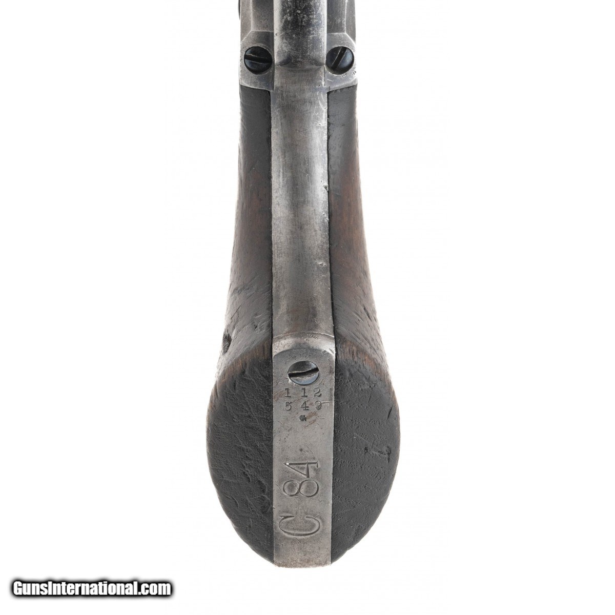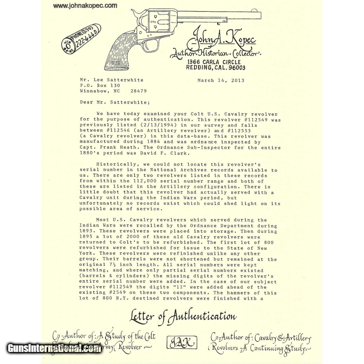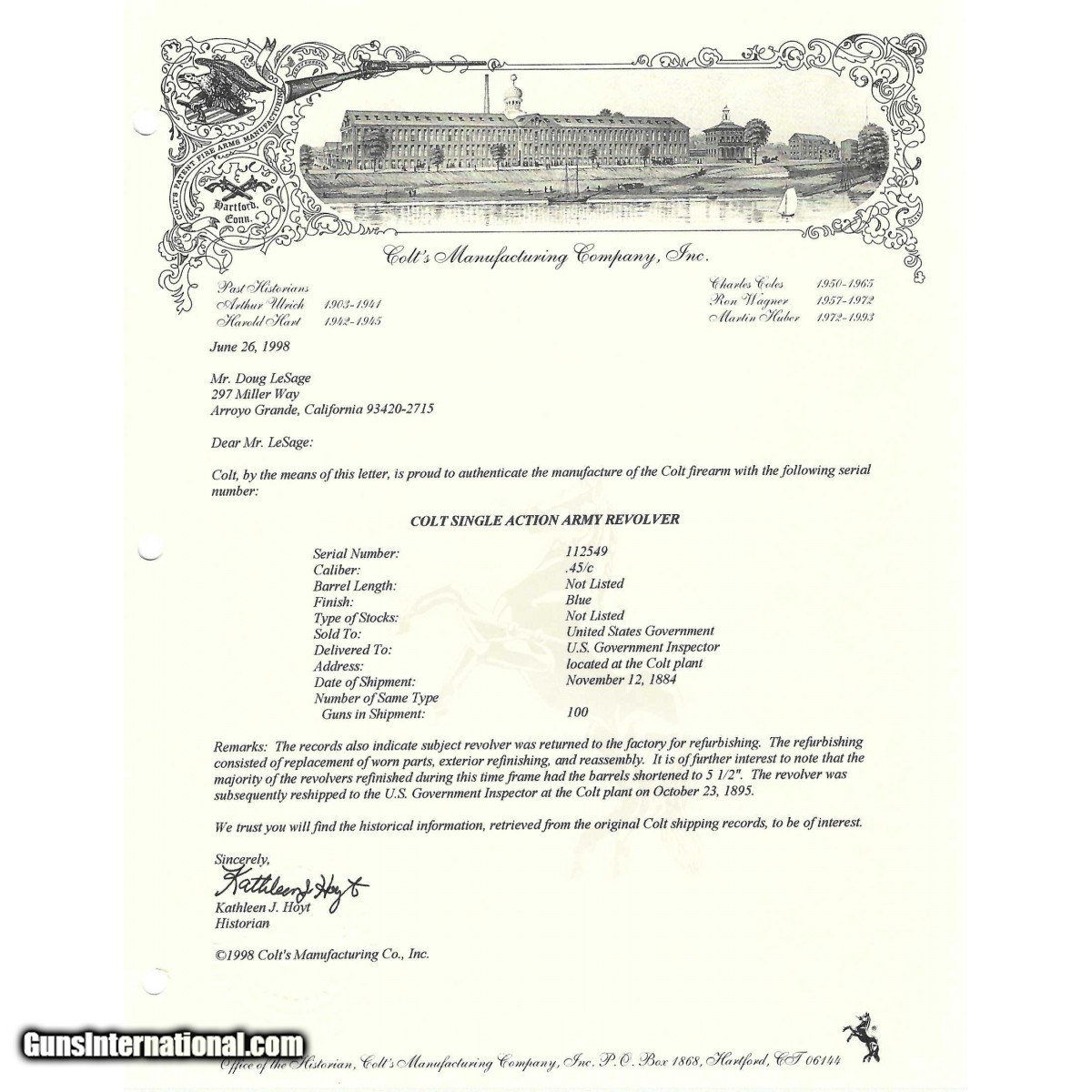 Description: "Serial number 112549. Made in 1884. 45 LC caliber with a 7 ½" barrel. This is a very fine example. The barrel has 70% -80% of the original blue. The frame still has lots of case colors. The grips are very fine. This is a gun issued to the New York Militia. It has markings on the grips and on the butt of the gun that this gun was issued to Troop C which was stationed in Brooklyn. This gun comes with a letter of authentication from noted Colt Single Action expert John Kopec. He declares it all original and awarded this gun the coveted Golden seal reserved for only the original and finest guns at Mr. Kopec’s discretion. SOLD Antique: Yes |