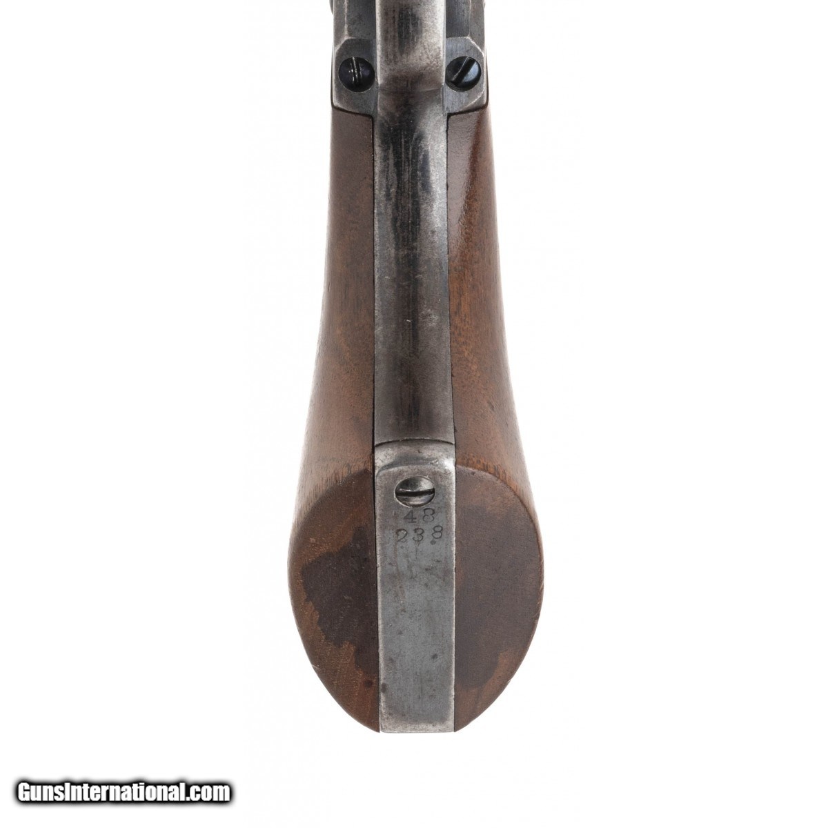 Description: " Serial number 48238. Made in 1878. 45 LC caliber with 7 ½" barrel. This is a very good example of a Henry Nettleton. The barrel has a bluish gray patina with some original blue in the protected areas. The frame still has a fair amount of case colors. The grips are very ell made replacements. This gun comes with a letter of authentication from noted Colt Single Action expert John Kopec. Mr. Kopec says this gun is all original with the exception of the grips. SOLD Antique: Yes |