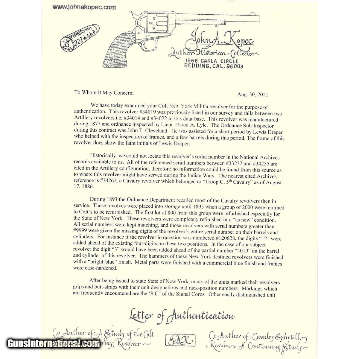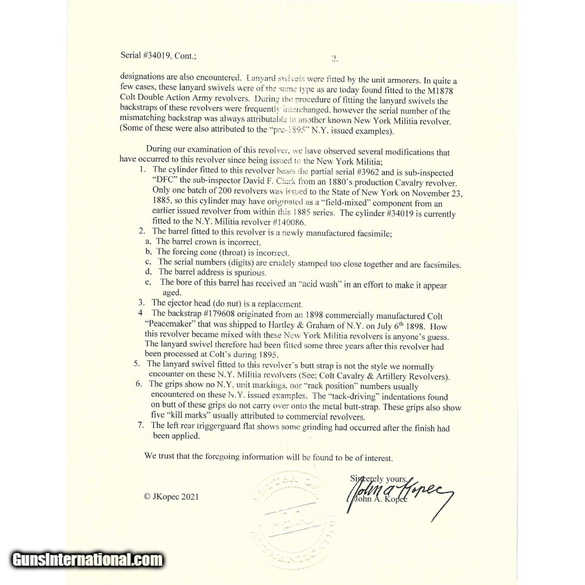 Description: "Serial Number 34019. Made in 1877. 45 LC with a 7 ½" barrel. Scarce gun inspected by John T Cleveland. Mr. Cleveland was one of the more scarce US martial inspectors. This is gun is in very fine condition. This gun has had significant restoration. Accompanying this gun is a letter of authentication from noted Colt expert John Kopec. Mr. Kopec notes numerous alterations to this gun. Very attractive gun inspected by JTC and a issued to the New York Militia! SOLD Antique: Yes |