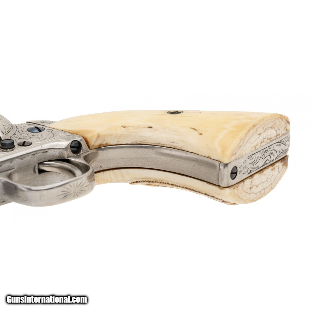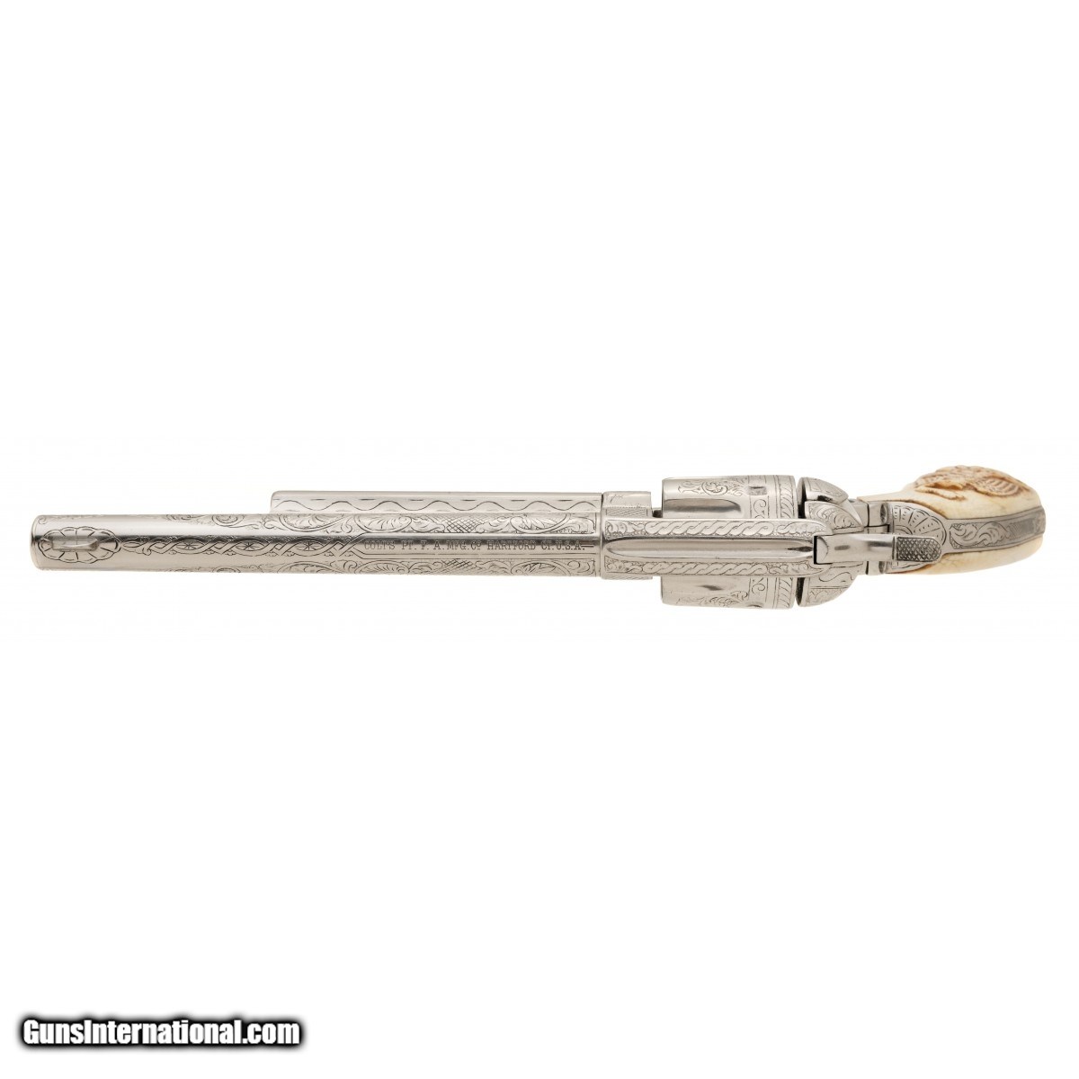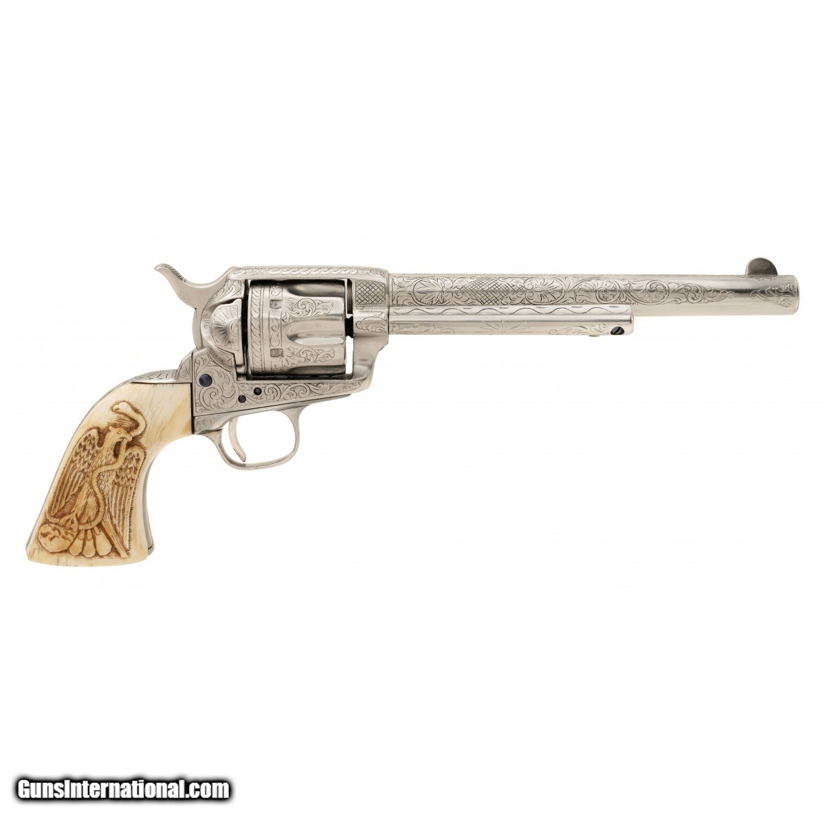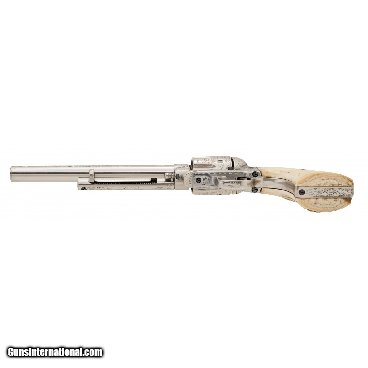 Description: " SN: 94129. Manufactured in 1883, .44-40 Winchester with a 7.5"" barrel. Bore is excellent. Antique nickel Single action Army with re-nickeled engraved barrel and frame by D.W. Harris, with nitre blue screws and Ivory grips engraved with an eagle holding a snake. The barrel has been replaced at some point and the new barrel has ""Colt Frontier Six Shooter"" on the left side. 3-line patent code on the left side of the receiver. Has factory letter. Overall excellent condition. (Consignment) SOLD Antique: Yes |