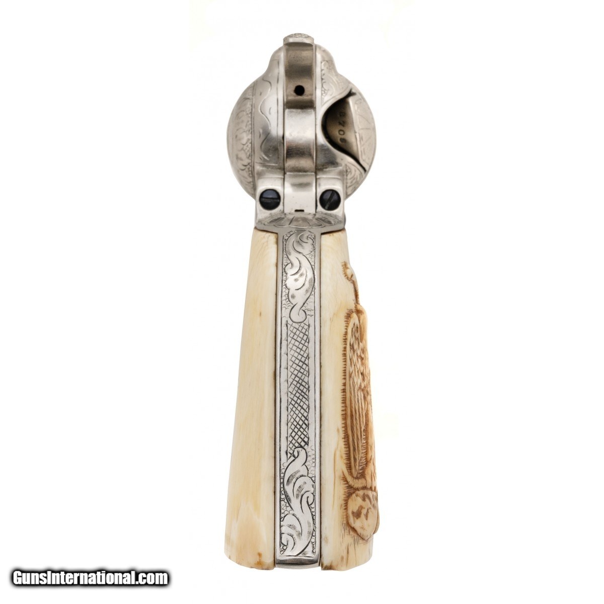 SN: 94129. Manufactured in 1883, .44-40 Winchester with a 7.5"" barrel. Bore is excellent. Antique nickel Single action Army with re-nickeled engraved barrel and frame by D.W. Harris, with nitre blue screws and Ivory grips engraved with an eagle holding a snake. The barrel has been replaced at some point and the new barrel has ""Colt Frontier Six Shooter"" on the left side. 3-line patent code on the left side of the receiver. Has factory letter. Overall excellent condition. (Consignment)