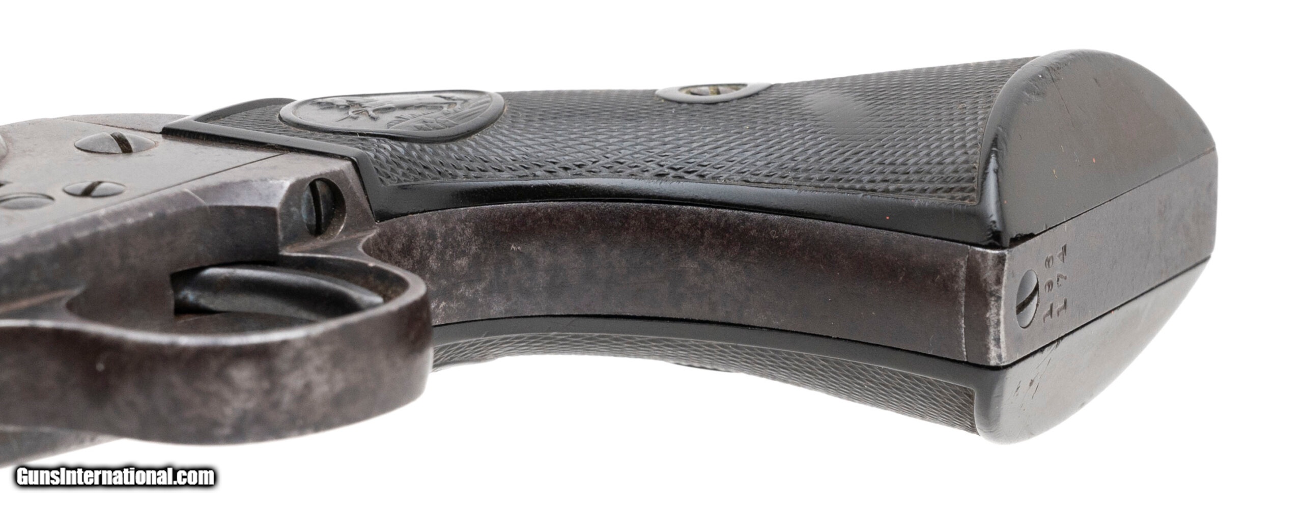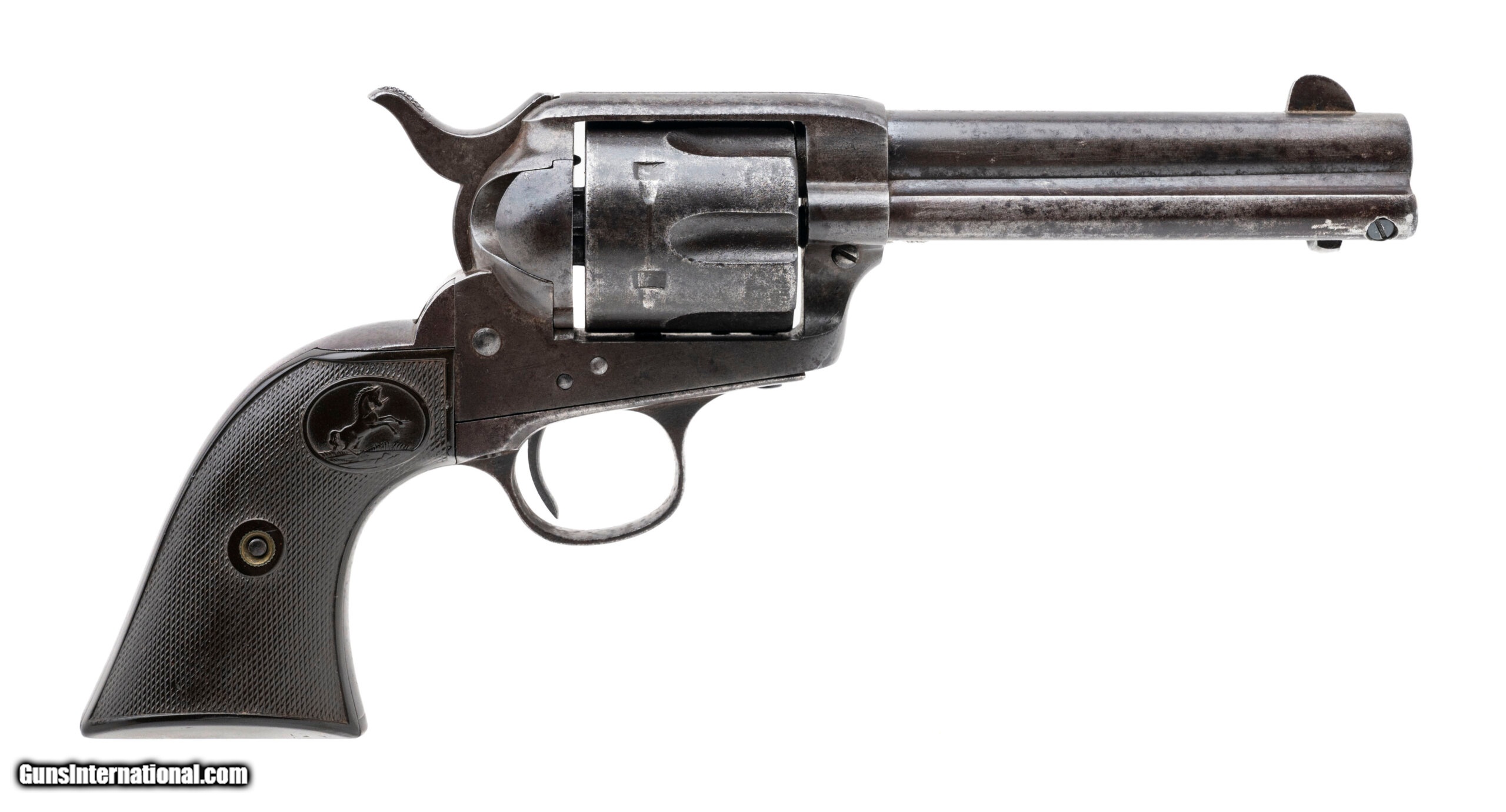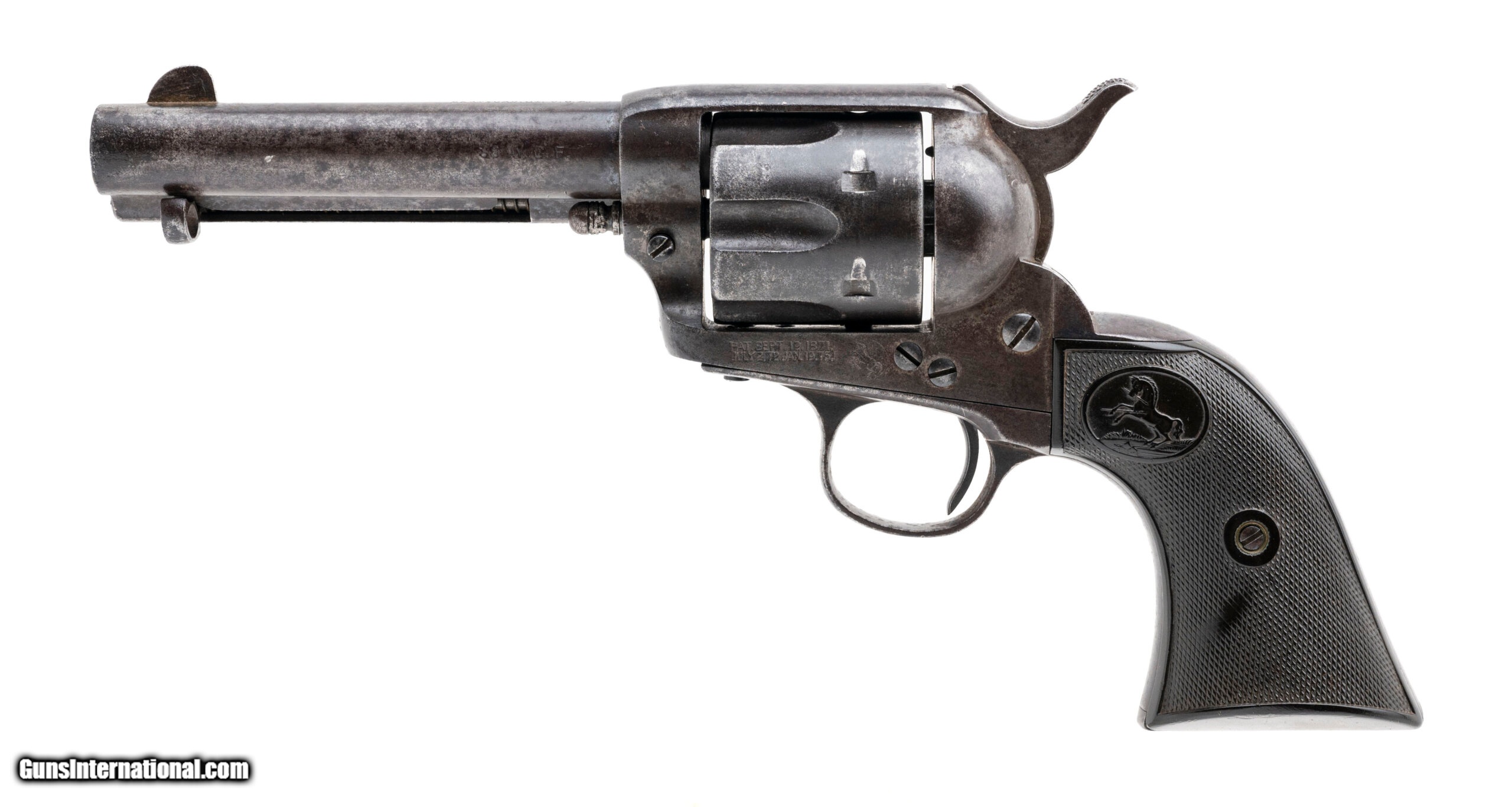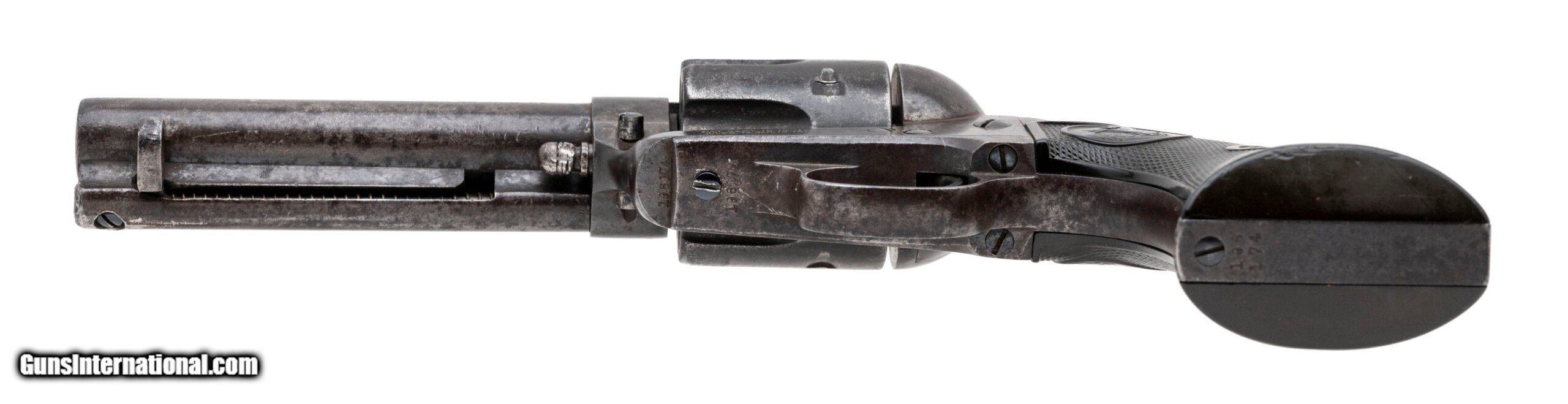 Description: "Serial No. 196174, made in 1900, .38 W.C.F., 4 ½" round barrel. Finish has turned to mottled brown patina with traces of original blue visible in protected areas. Serial numbers are matching, cylinder is unmarked. Grips have minimal handling wear noted with checkering remaining sharp,action indexes and functions correctly with a tight lock up. (DALLAS LOCATION) SOLD Curio/Relic: Yes |