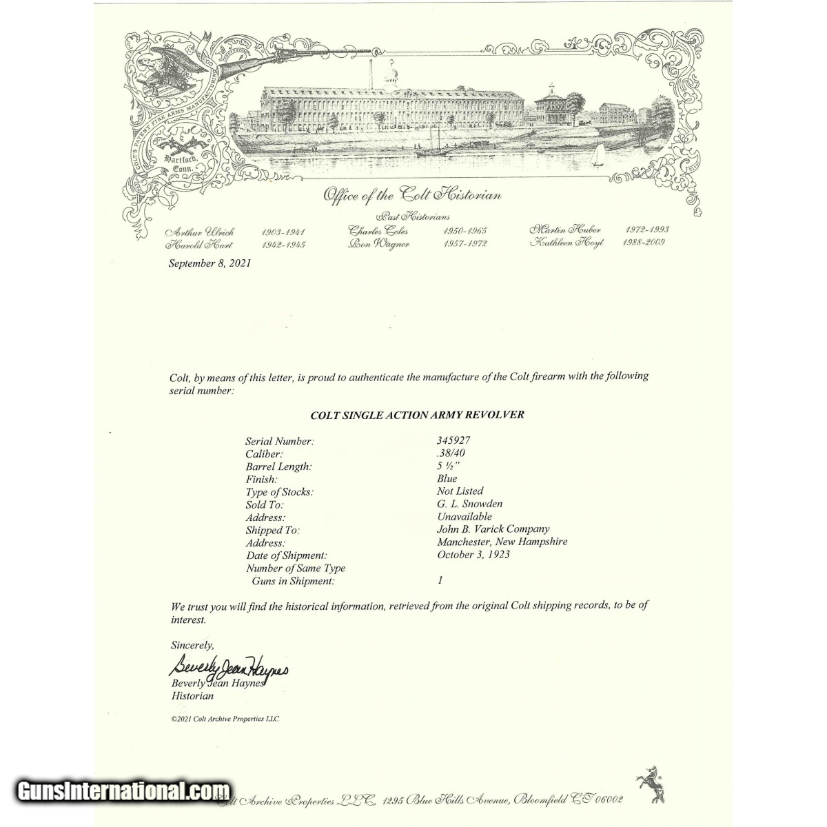 Description: " Sn:345927, Manufactured circa 1923, .38 WCF with a 5.5"" barrel. Bore is in excellent condition. Single action revolver with fluted cylinder, 2-line patent dates on left side of frame and rampant colt trademark just right of patent dates on frame. Revolver was shipped to John B. Varick Company, Manchester, New Hampshire on October 3, 1923. Has factory letter. Overall condition is excellent. (Consignment) SOLD Curio/Relic: Yes |