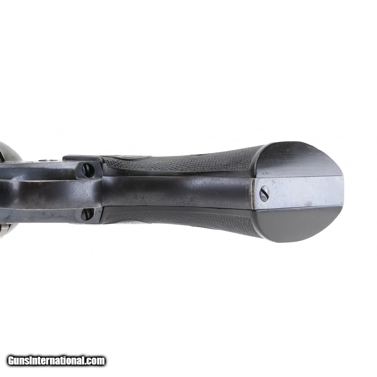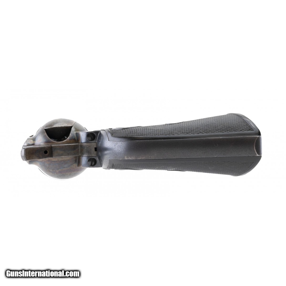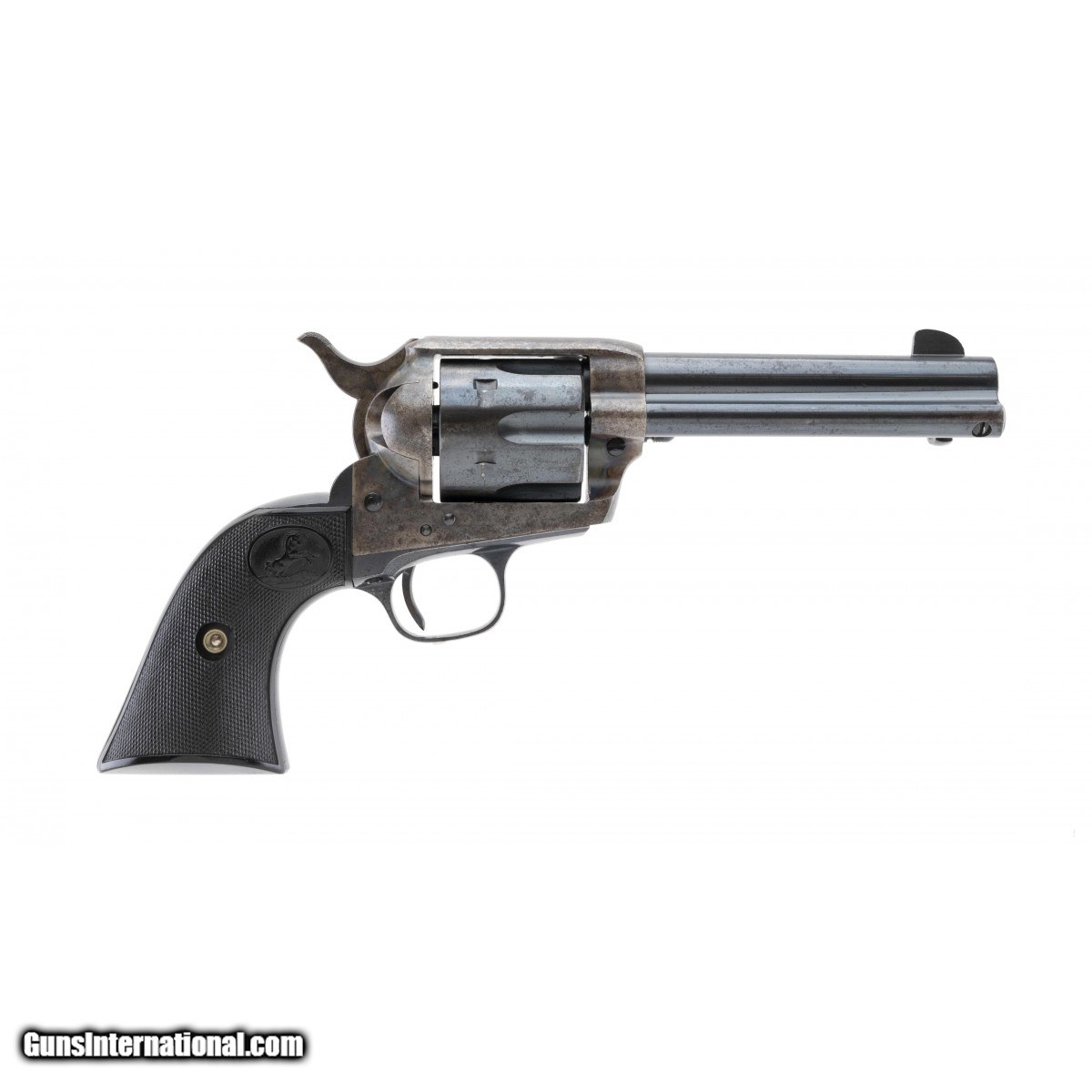 Description: " This 38 W.C.F. (38-40) Colt Single Action Army is circa 1927. The 4.75"" barrel has an excellent bore. The barrel retains approx. 95% blue with a little muzzle wear and very light spotting. The cylinder has approx. 95% blue with scattered light spotting. The backstraps are blue-plum. The frame and hammer have case colors, especially in the protected areas. The hard rubber rampant Colt grips are excellent with no cracks or chips. The gun is tight and the action functions correctly. This is a very presentable 94 year old Colt Single Action Army revolver. SOLD Curio/Relic: Yes |