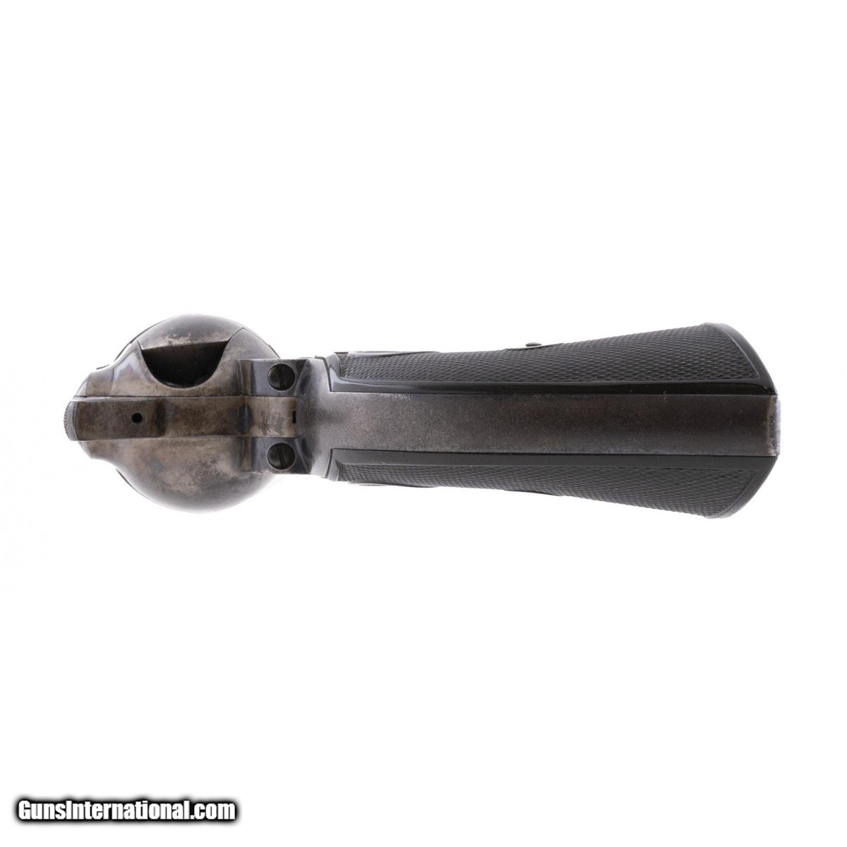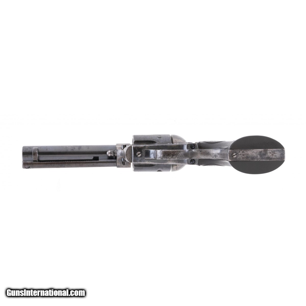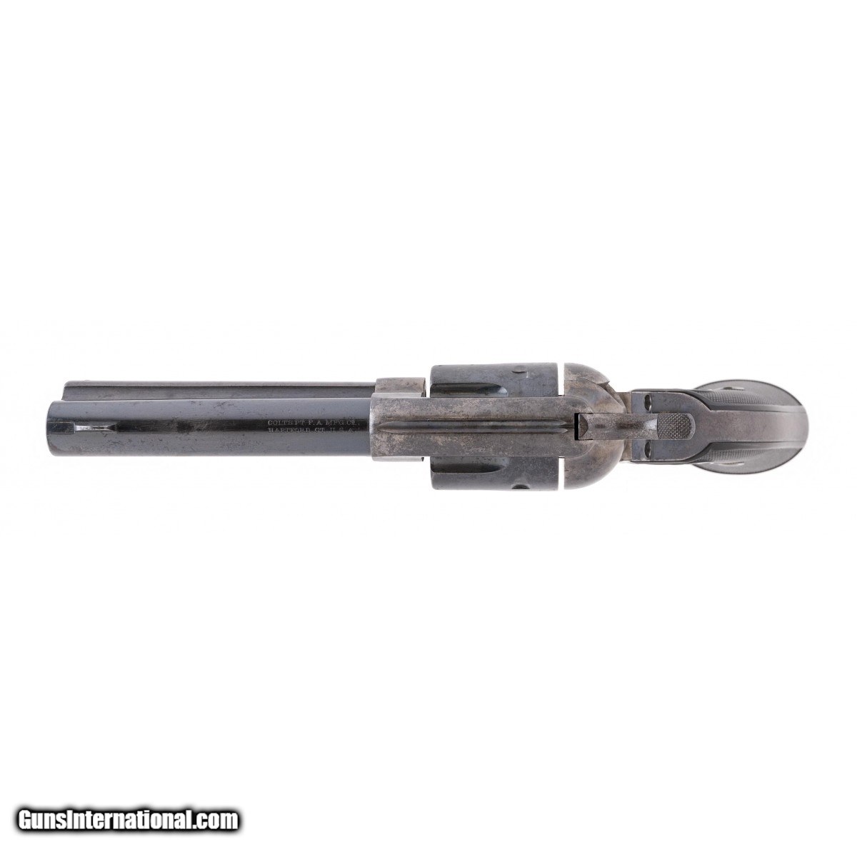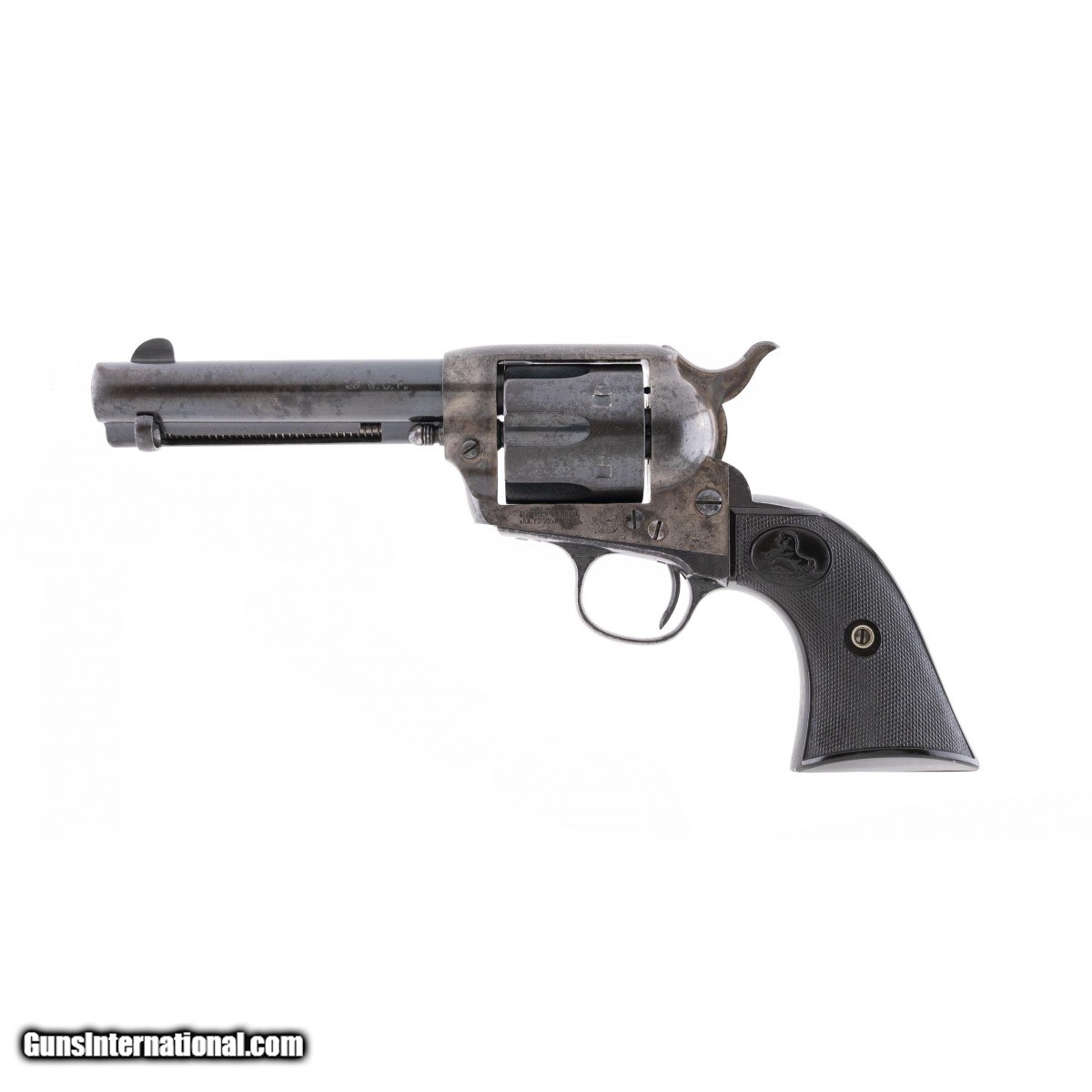 Description: " This 38 W.C.F. (38-40) Colt Single Action Army is circa 1910. The 4.75"" barrel has an excellent bore. The barrel retains approx. 85% blue with spotting on the left side where it apparently rested in a box. The cylinder has approx. 90% blue with scattered spotting. The backstraps are a gray-brown. The frame and hammer show traces of case colors but are mostly silver. The hard rubber rampant Colt grips are fine with no cracks or chips. The gun is tight and the action functions correctly. This is a very presentable 111 year old Colt Single Action Army revolver. SOLD Curio/Relic: Yes |