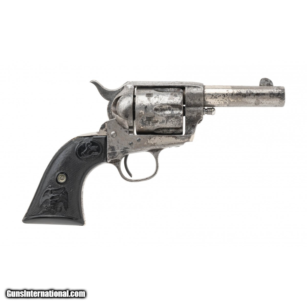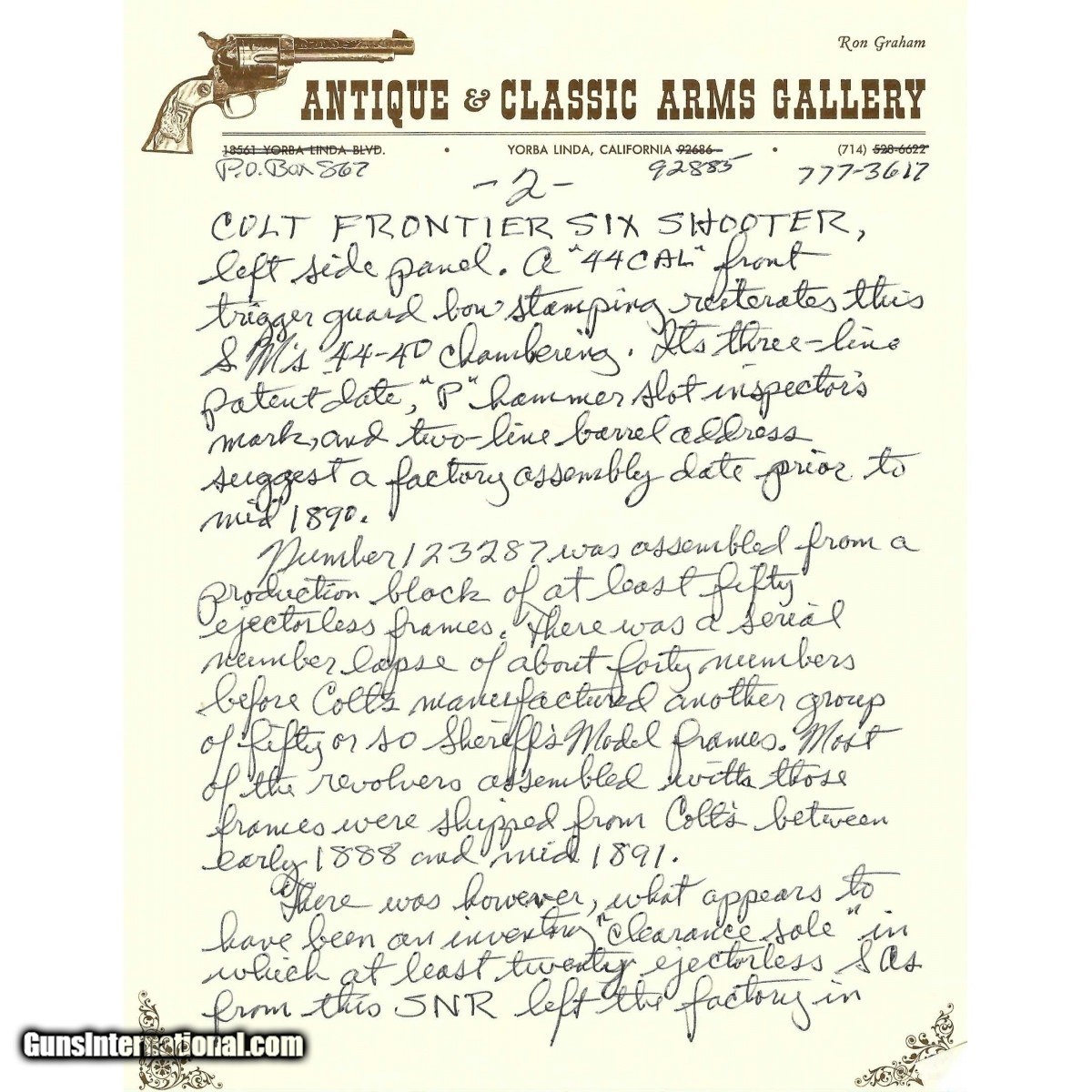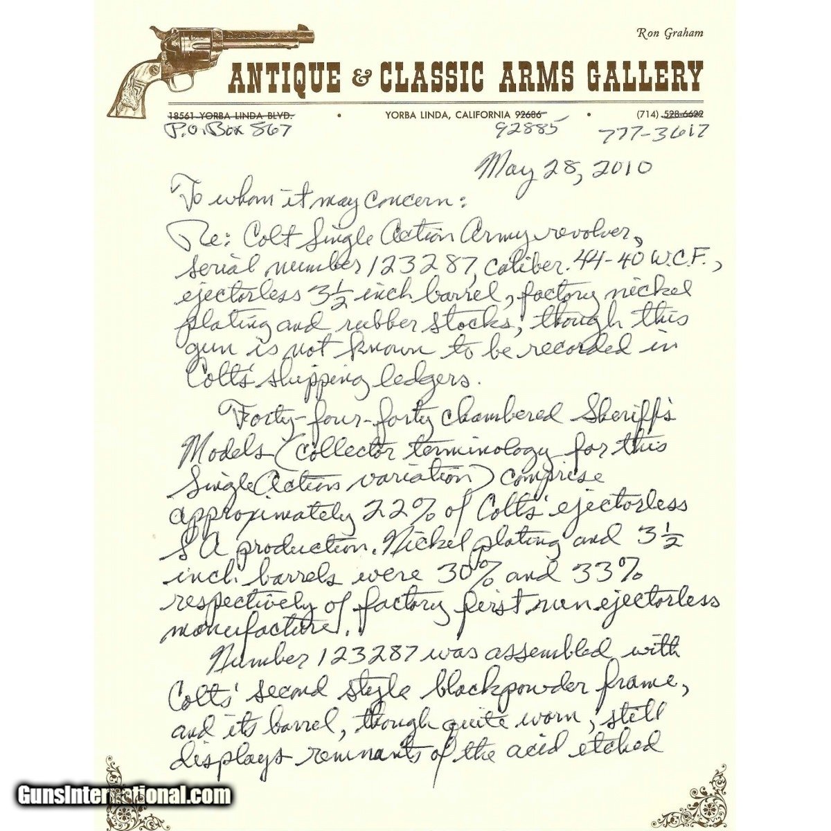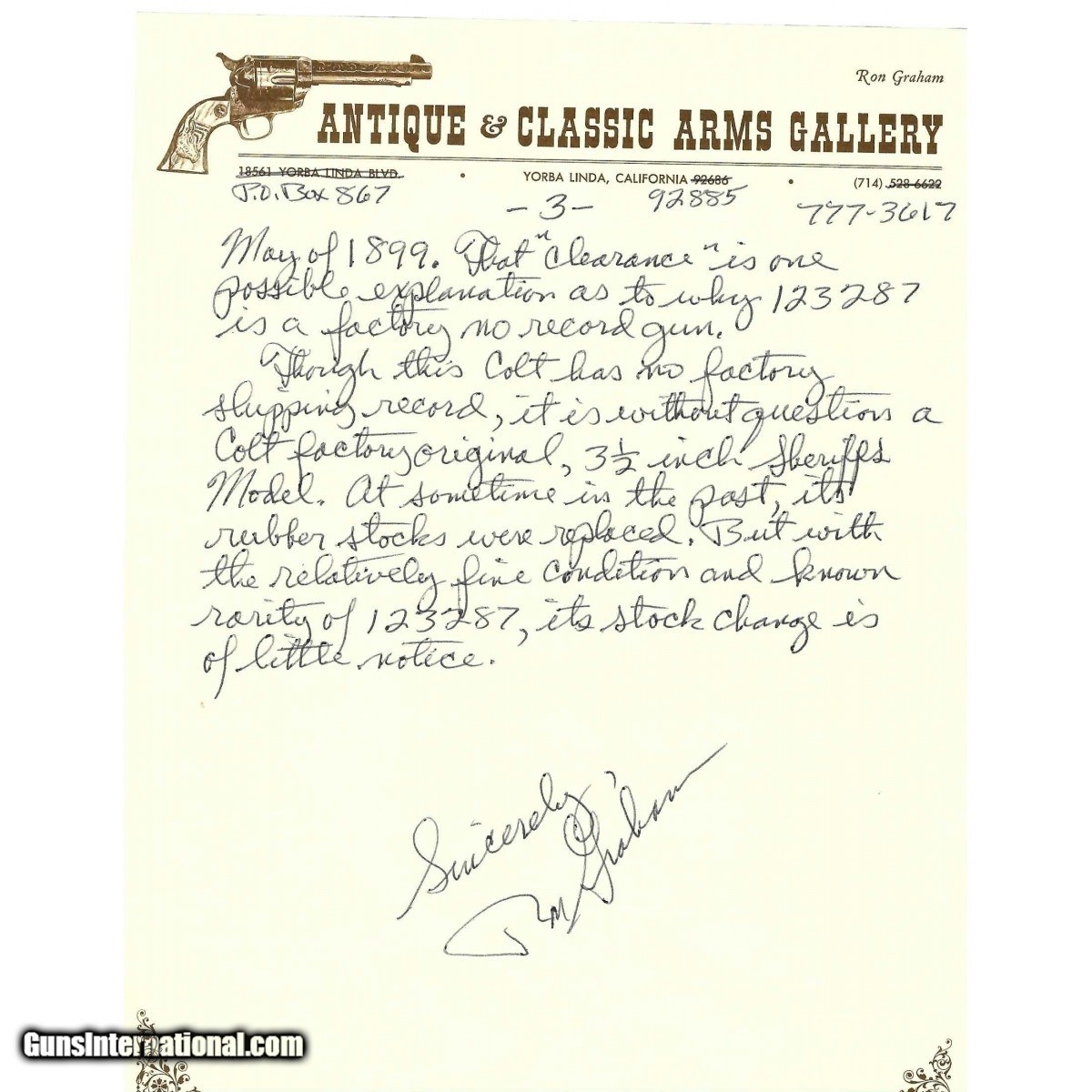 Description: "SN: 123287. Made in 1888. 44-40 caliber with a 3 ½" barrel. This is a very nice example of a sheriffs model with 5% of the original nickel finish. The eagle grips are original grips, but not to this gun. Ther is a small chip along the backstrap on the right hand side. Overall the grips are very good. This gun is a no record gun from Colt. It comes with a letter of authentication from noted Colt Single Action expert Ron Graham. Mr. Graham declares this gun to be completely authentic (with exception to the grips) and says the serial number of this gun falls into a range of over 50 known Sheriffs models. This gun was out of the John Irwin estate. Colt Sheriffs models are a variation where there is no ejector rod present. SOLD Antique: Yes |