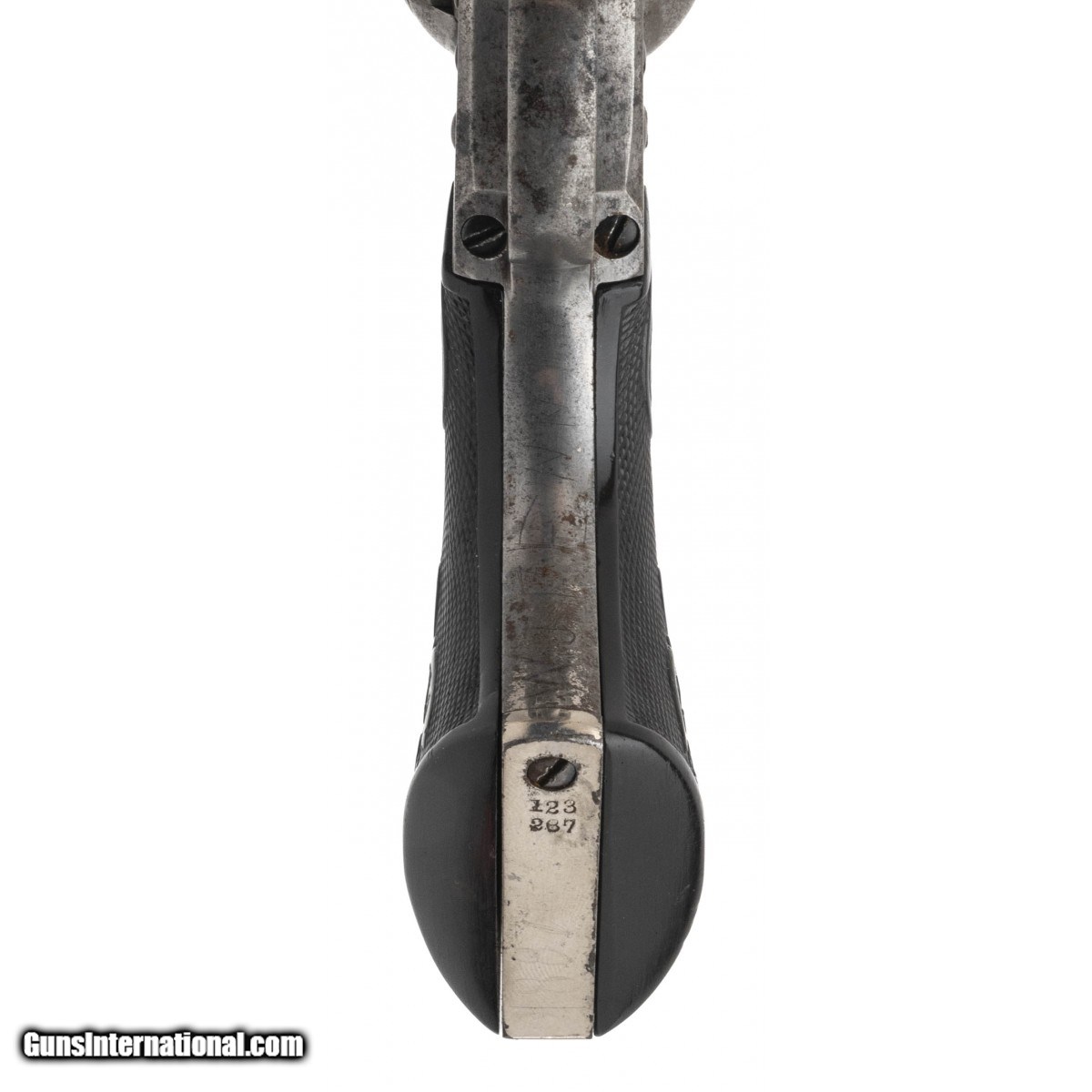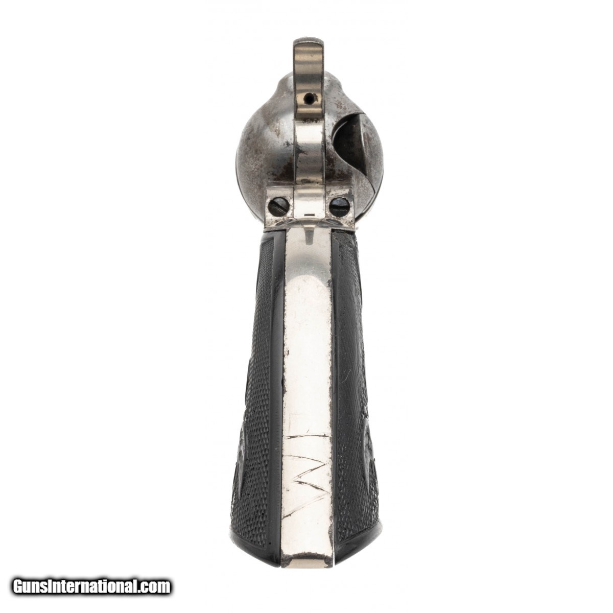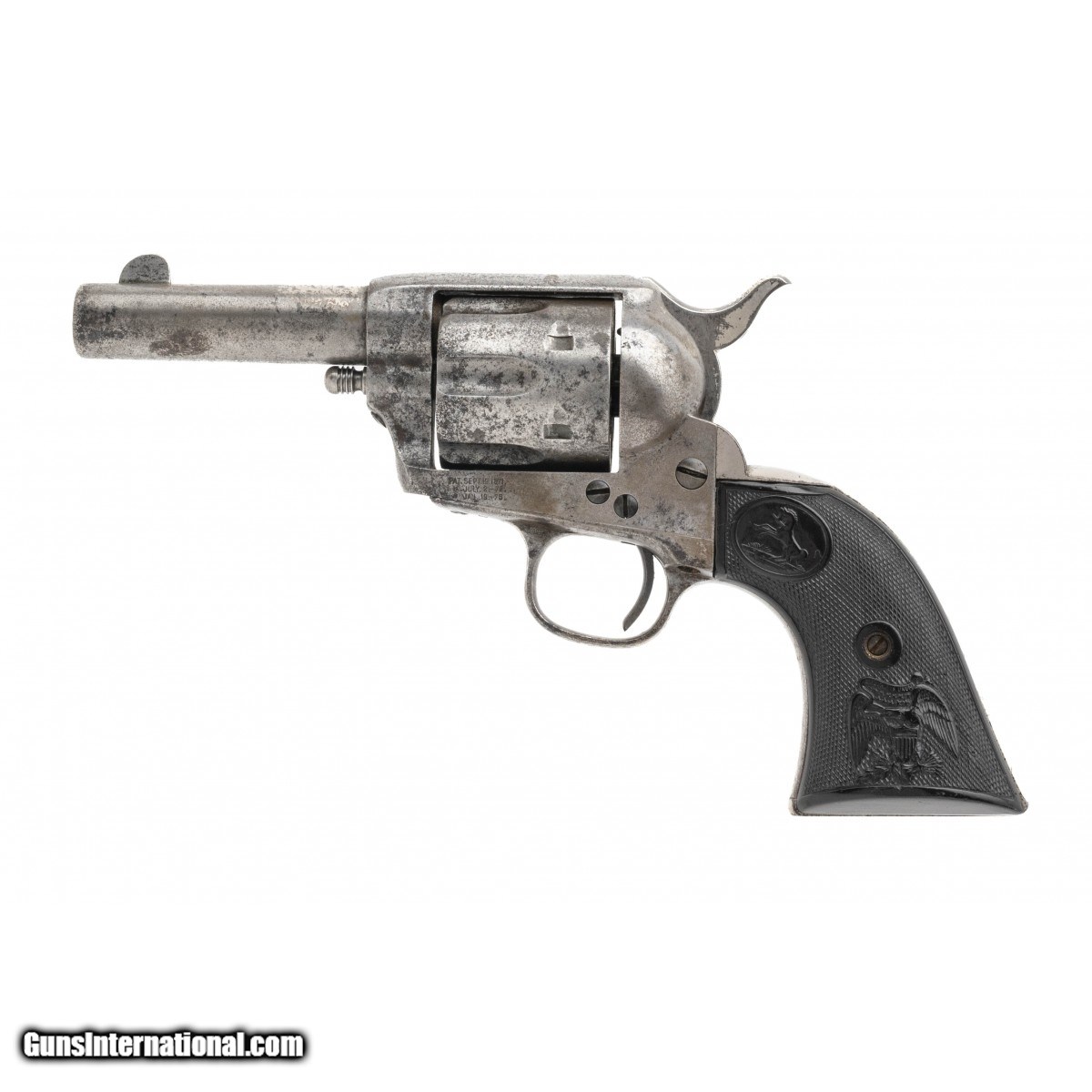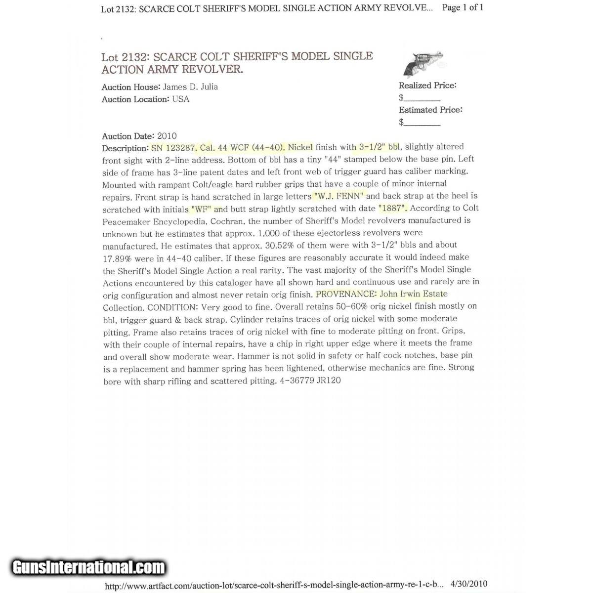Description: "SN: 123287. Made in 1888. 44-40 caliber with a 3 ½" barrel. This is a very nice example of a sheriffs model with 5% of the original nickel finish. The eagle grips are original grips, but not to this gun. Ther is a small chip along the backstrap on the right hand side. Overall the grips are very good. This gun is a no record gun from Colt. It comes with a letter of authentication from noted Colt Single Action expert Ron Graham. Mr. Graham declares this gun to be completely authentic (with exception to the grips) and says the serial number of this gun falls into a range of over 50 known Sheriffs models. This gun was out of the John Irwin estate. Colt Sheriffs models are a variation where there is no ejector rod present. SOLD Antique: Yes |